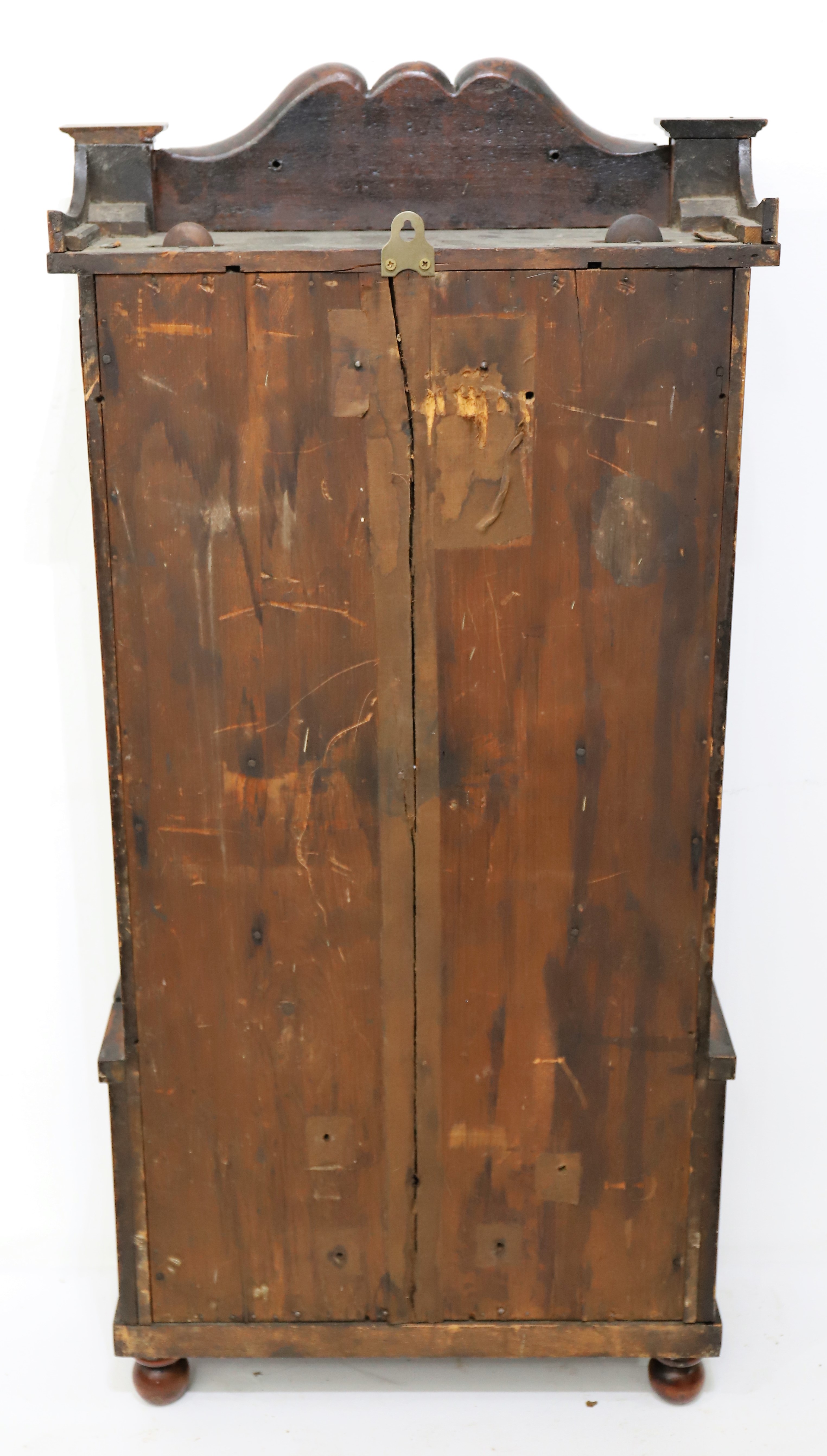 mirror is likely original but the wire attachment to pull it up and observe the brass movement is missing. The hands are period/correct. The strap brass movement is oily and will only run for a minute or two; the strike works. There two proper old weights and a
