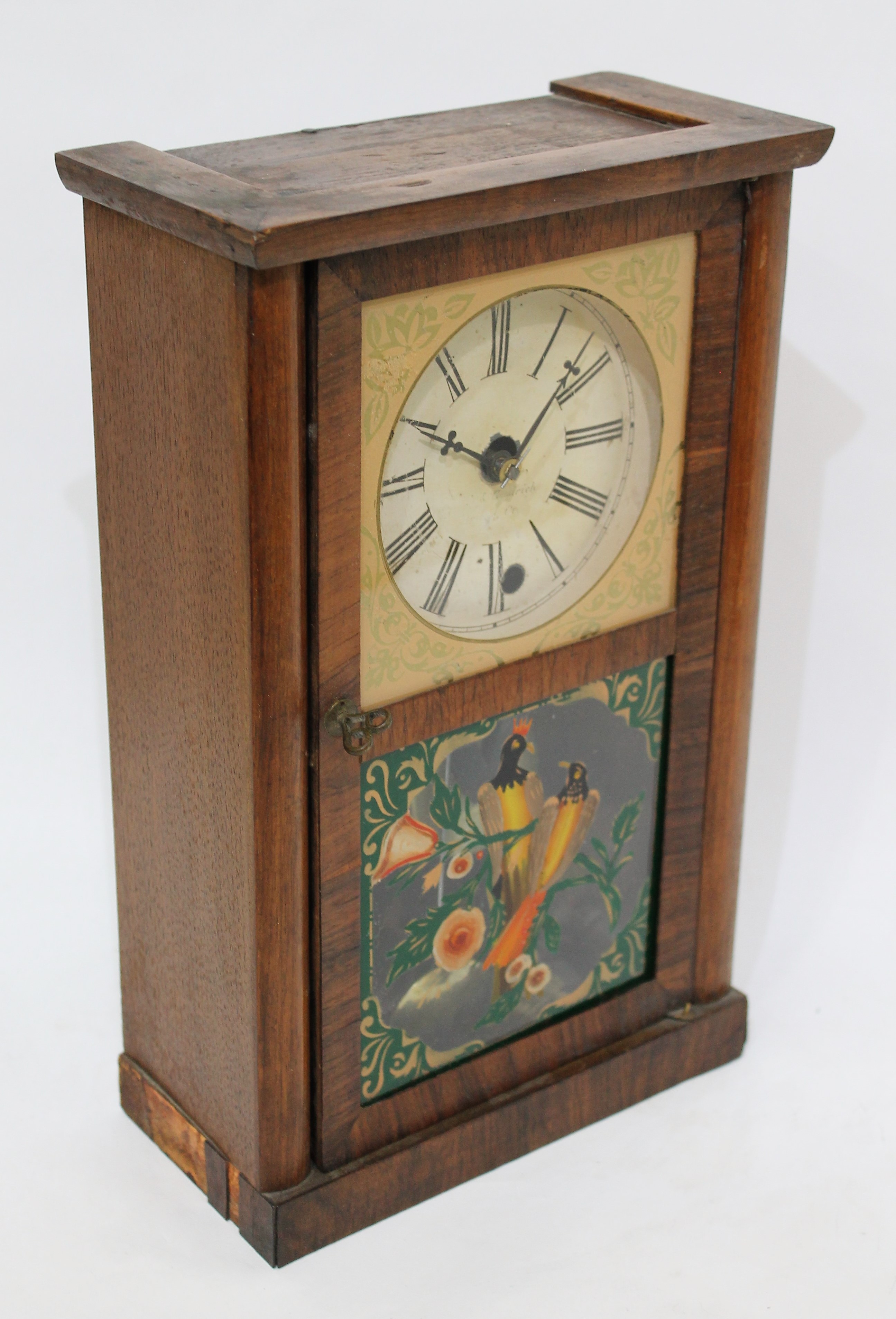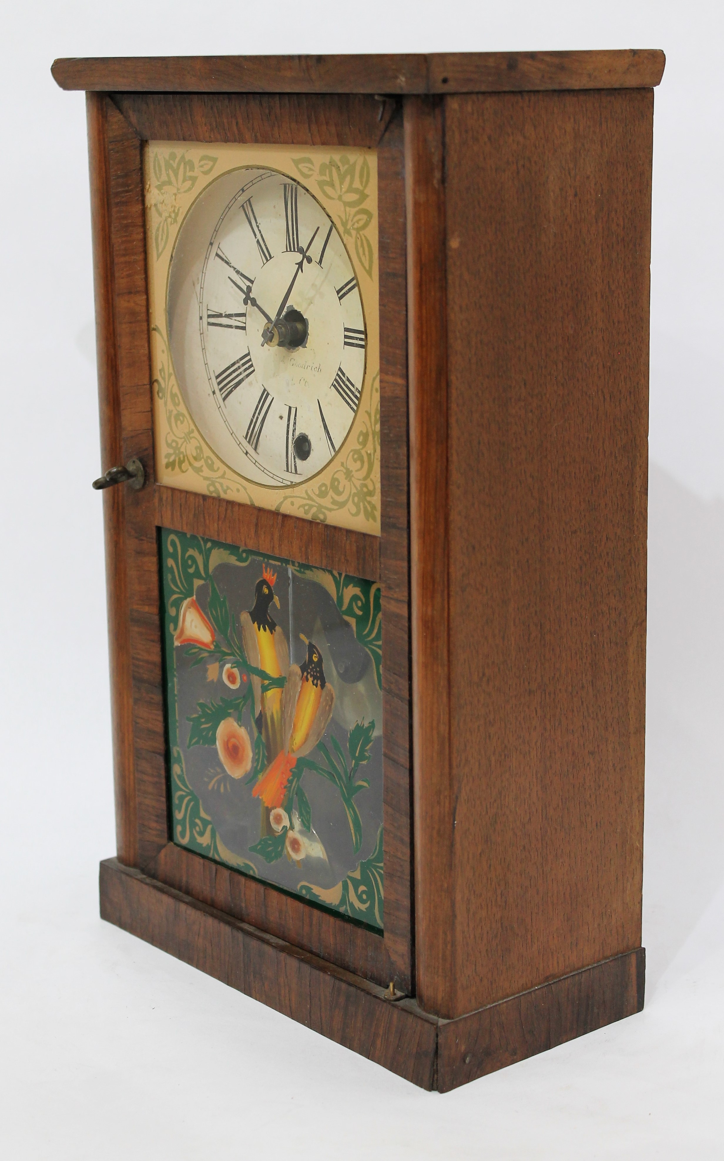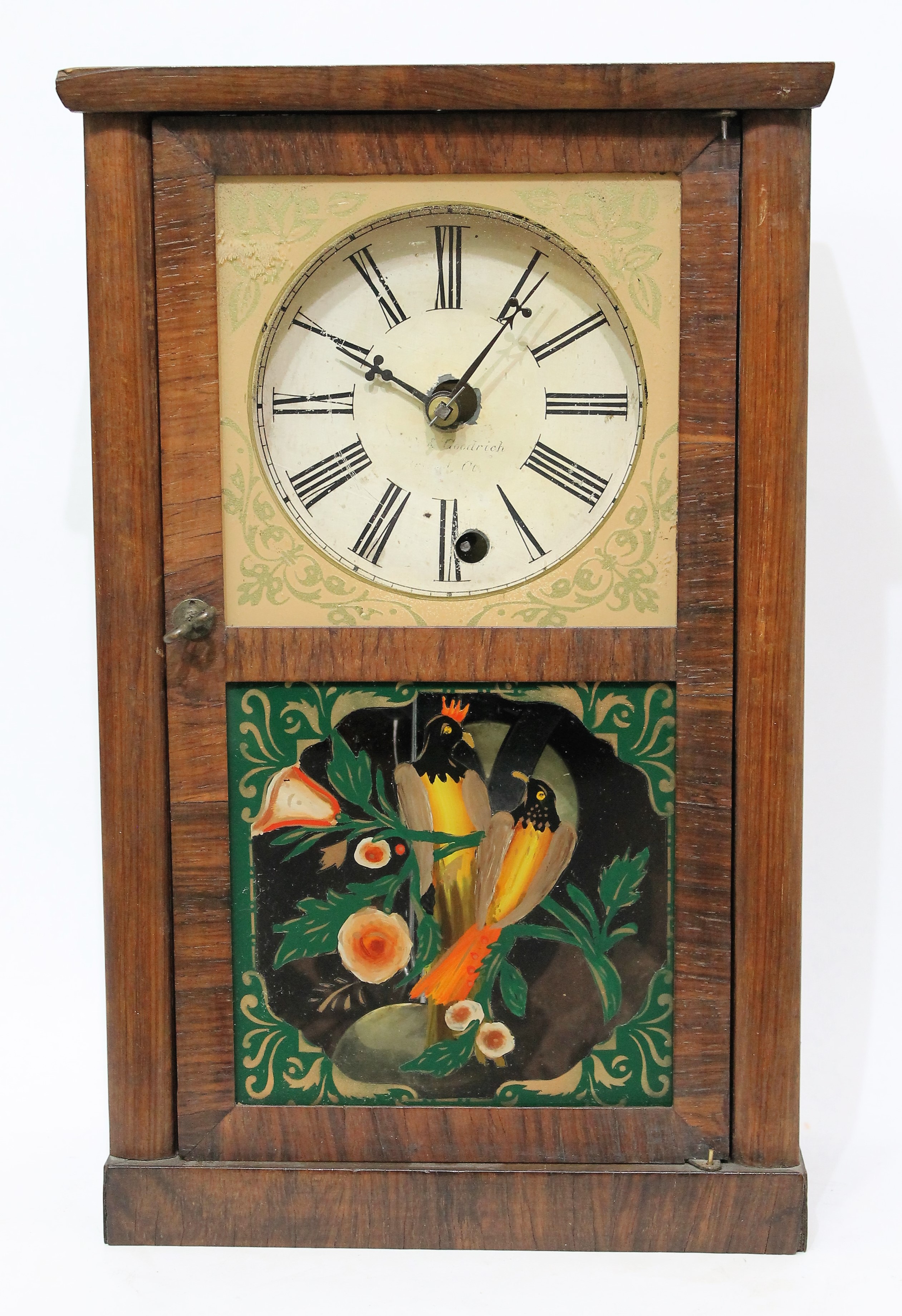 Smith & Goodrich cottage, ca. 1853. There is no label and movement is unsigned, but the dial is signed Smith & Goodrich, Bristol CT. The 12.5-inch case is veneered
