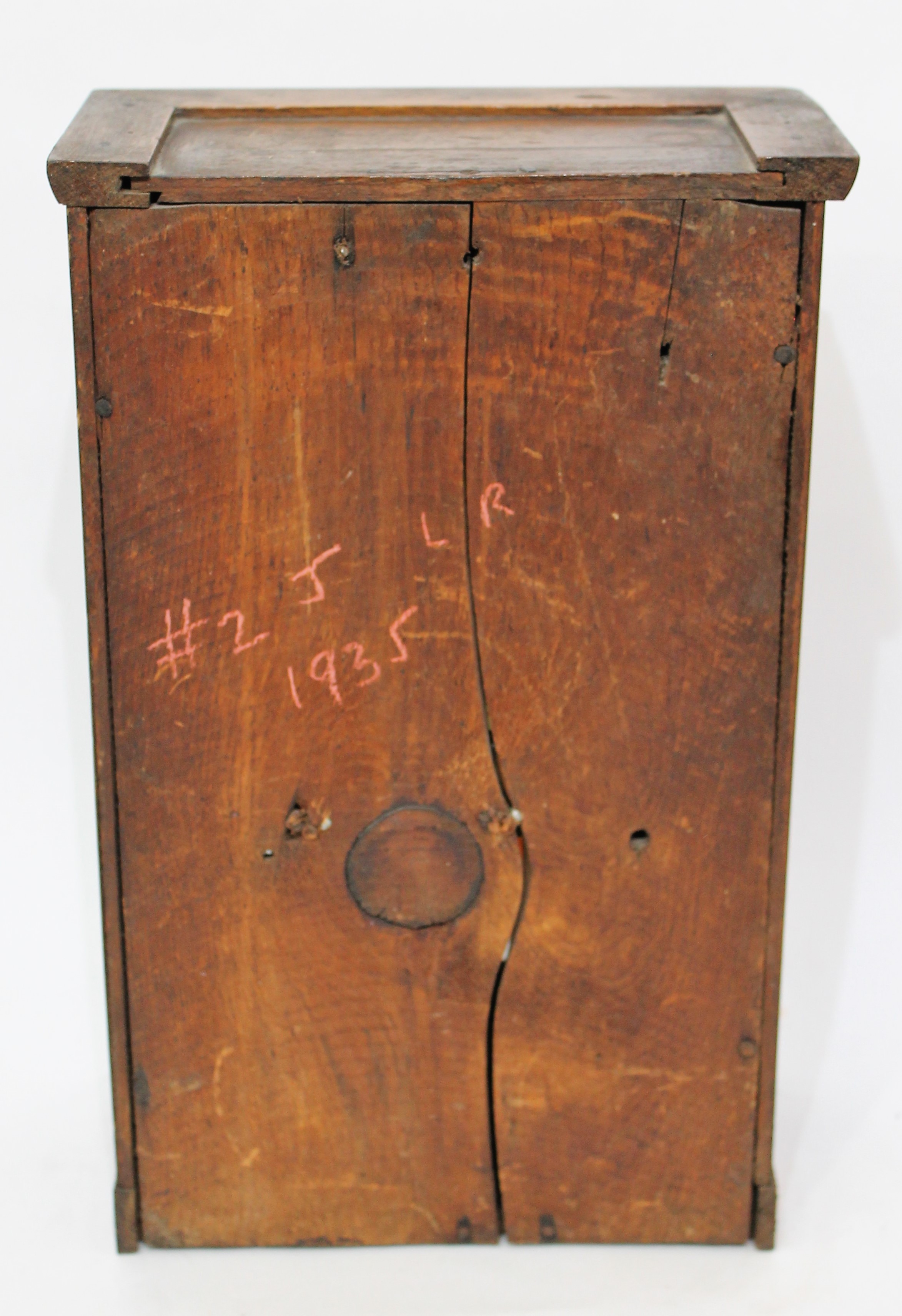 in mahogany or walnut with significant losses on the left-side base. Both glasses are old and both have been repainted appropriately. The dial is likely original with considerable chipping and wear, and a faded signature. There is a hole on the lower left that,