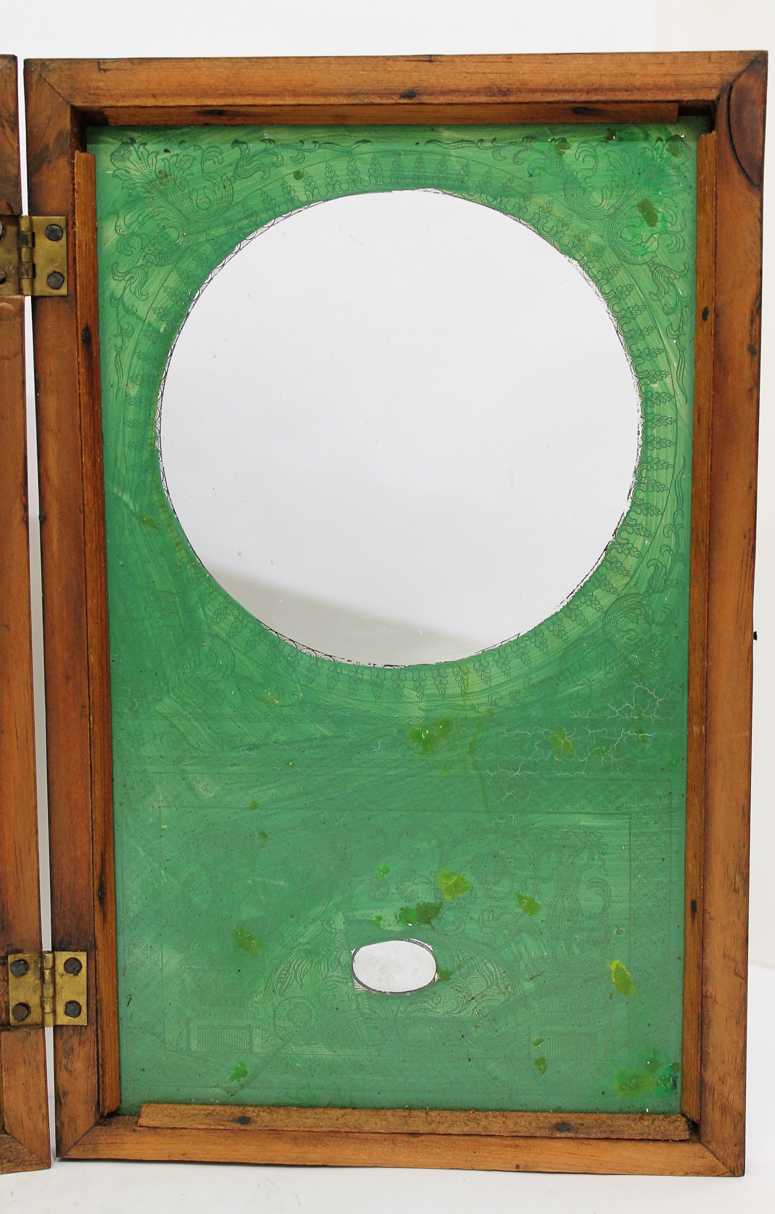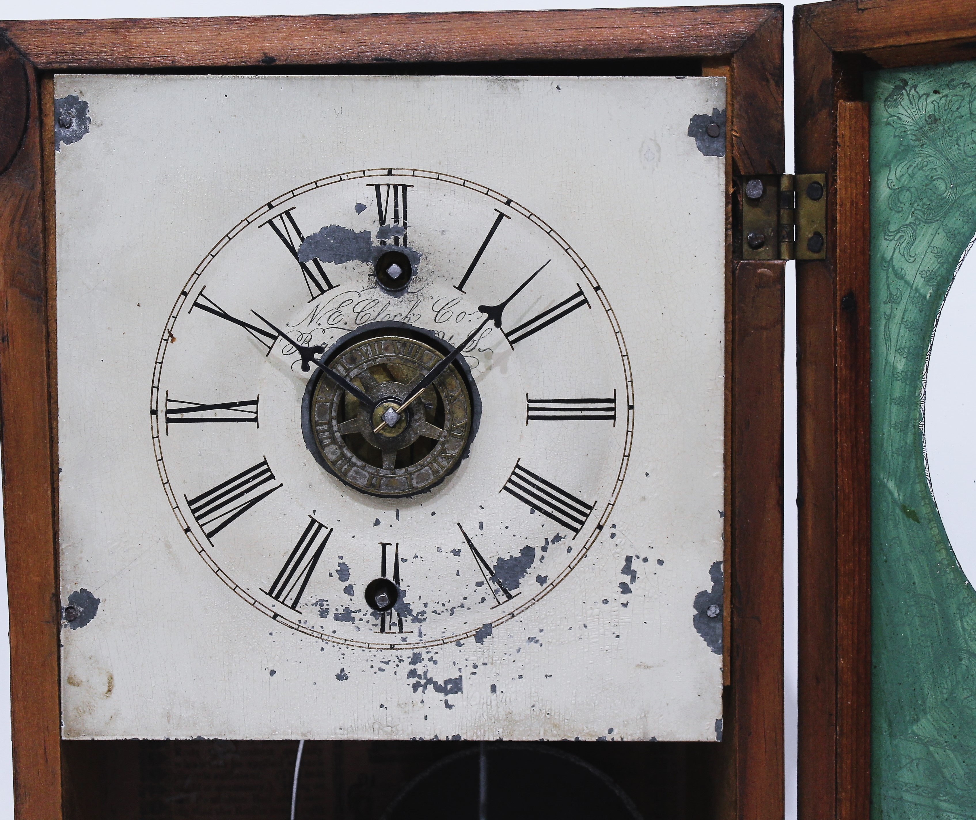 decalcomania pattern, backed in green. The image has been rebacked, and the pattern itself may also be a replacement. The signed dial is original with chipping and losses, the hands likely original. This clock has an unusual 1-day, time-and-alarm