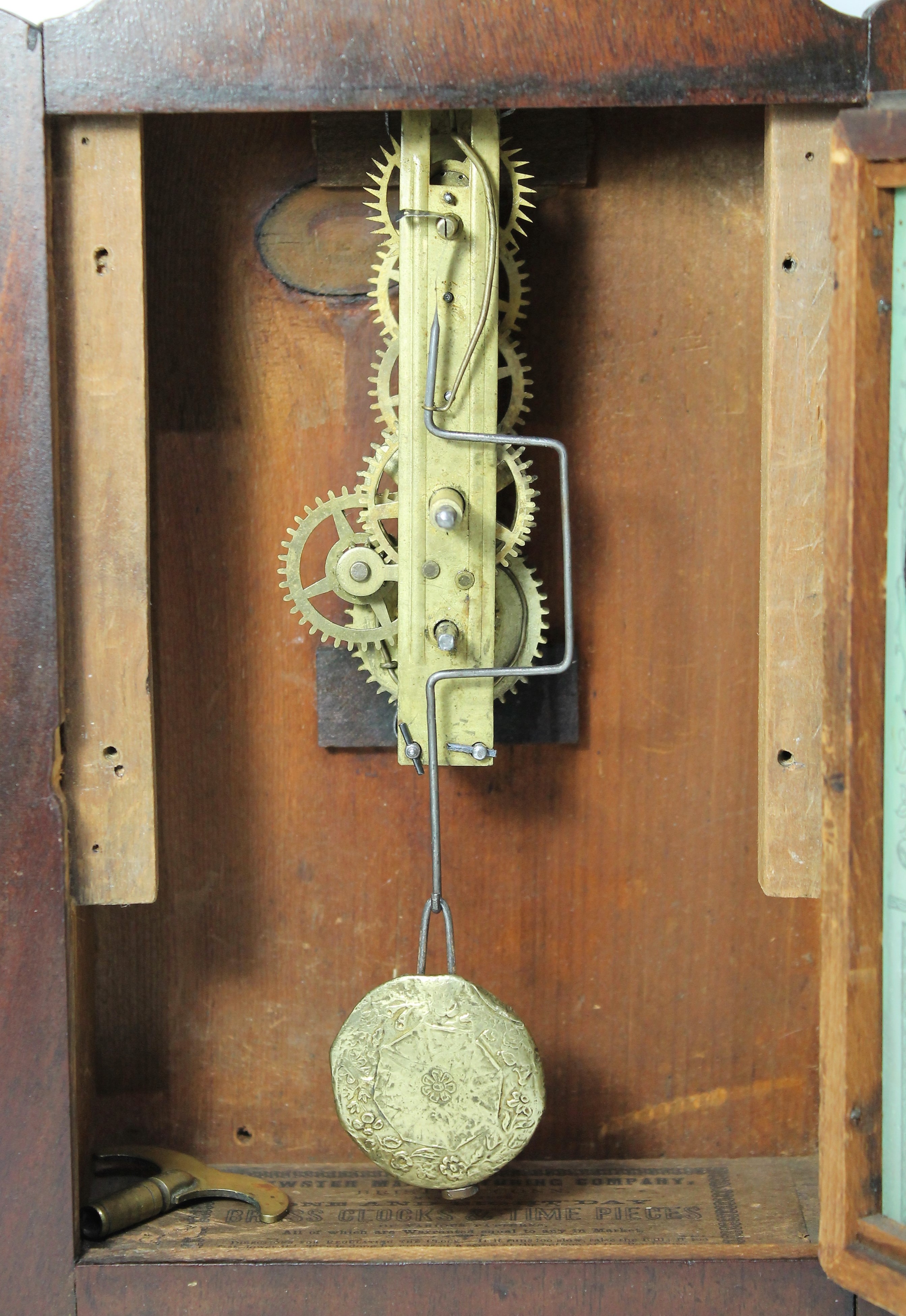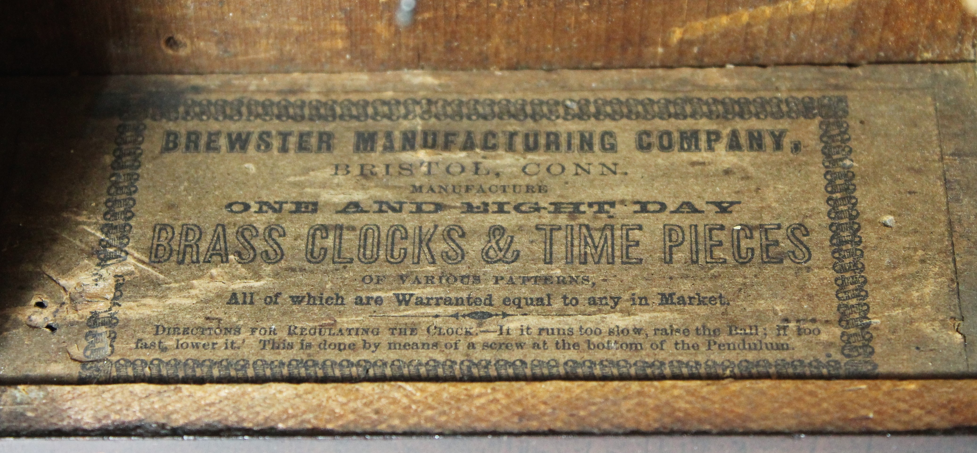 movement is quite unusual, a ladder movement with ribbed plates. It is not die-stamped; it is running with enthusiasm. There is an old, embossed pendulum bob, a Brewster winding key, and a good label on the bottom inside. I can find one sale of