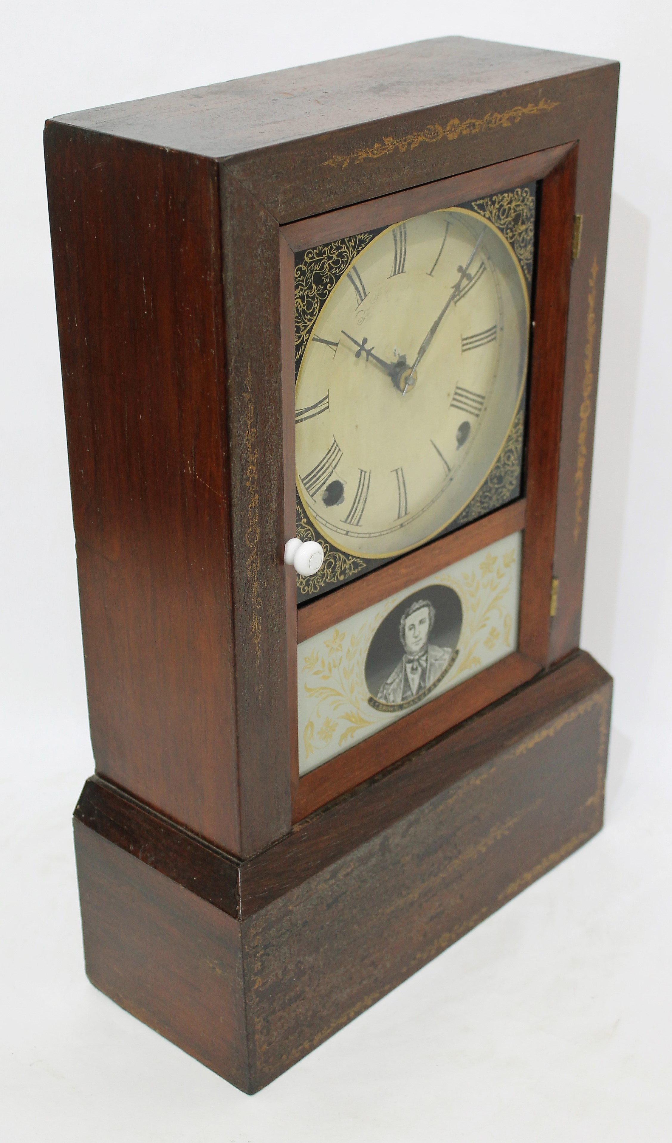 Forestville Manufacturing Co. shelf clock, 1842-1849. A 15.5-inch case veneered in rosewood with gilt stenciling on the top, sides, and base. The finish is worn and detracts from