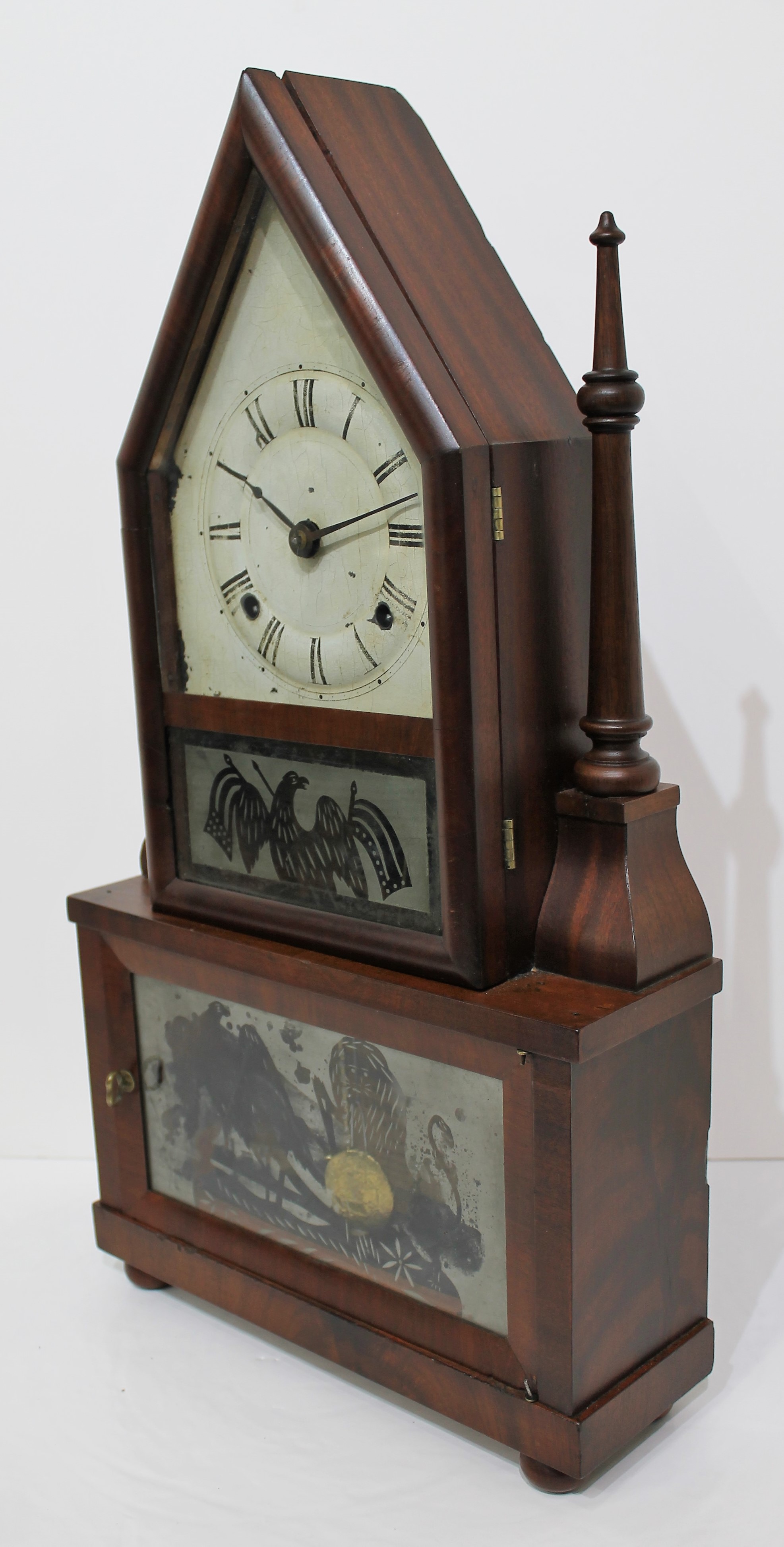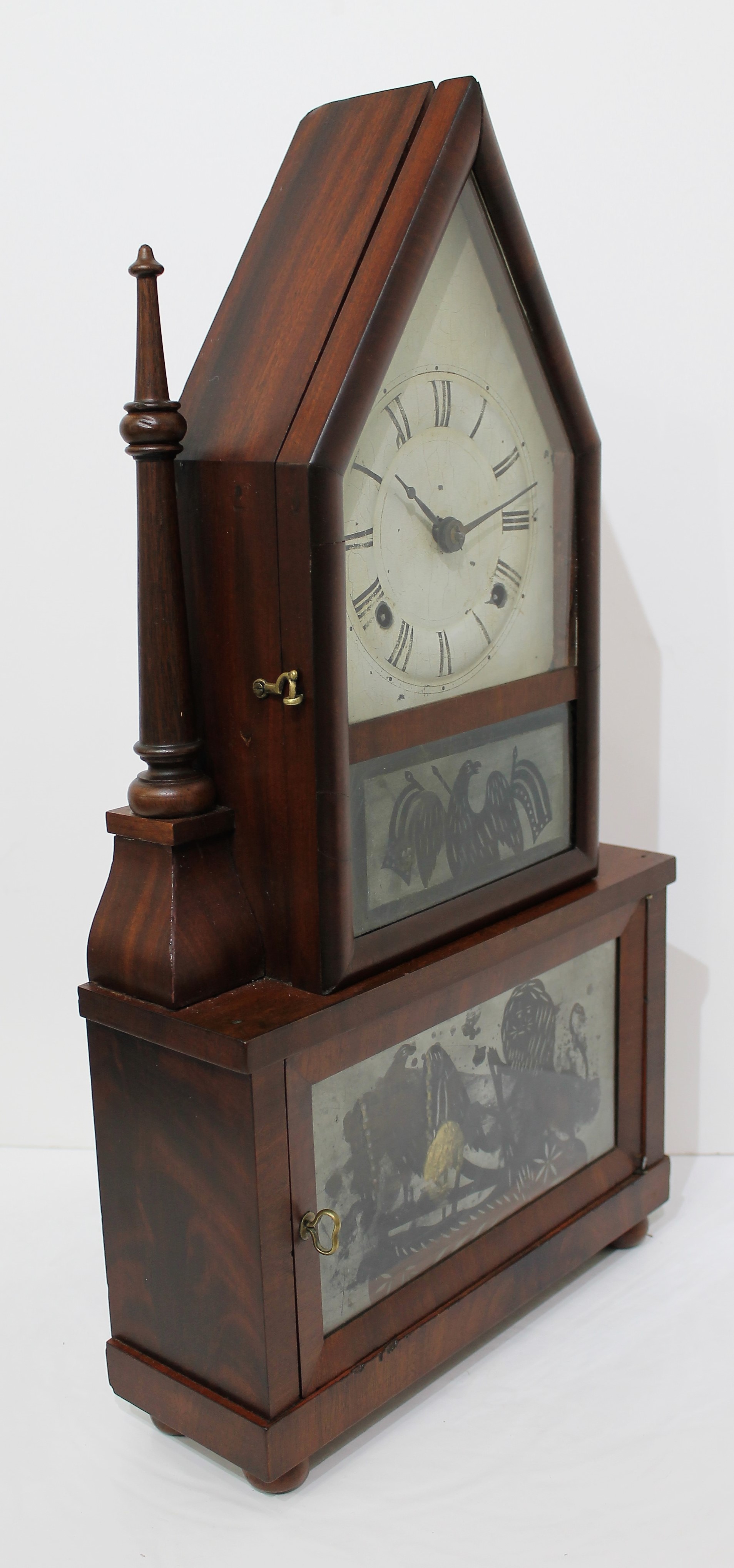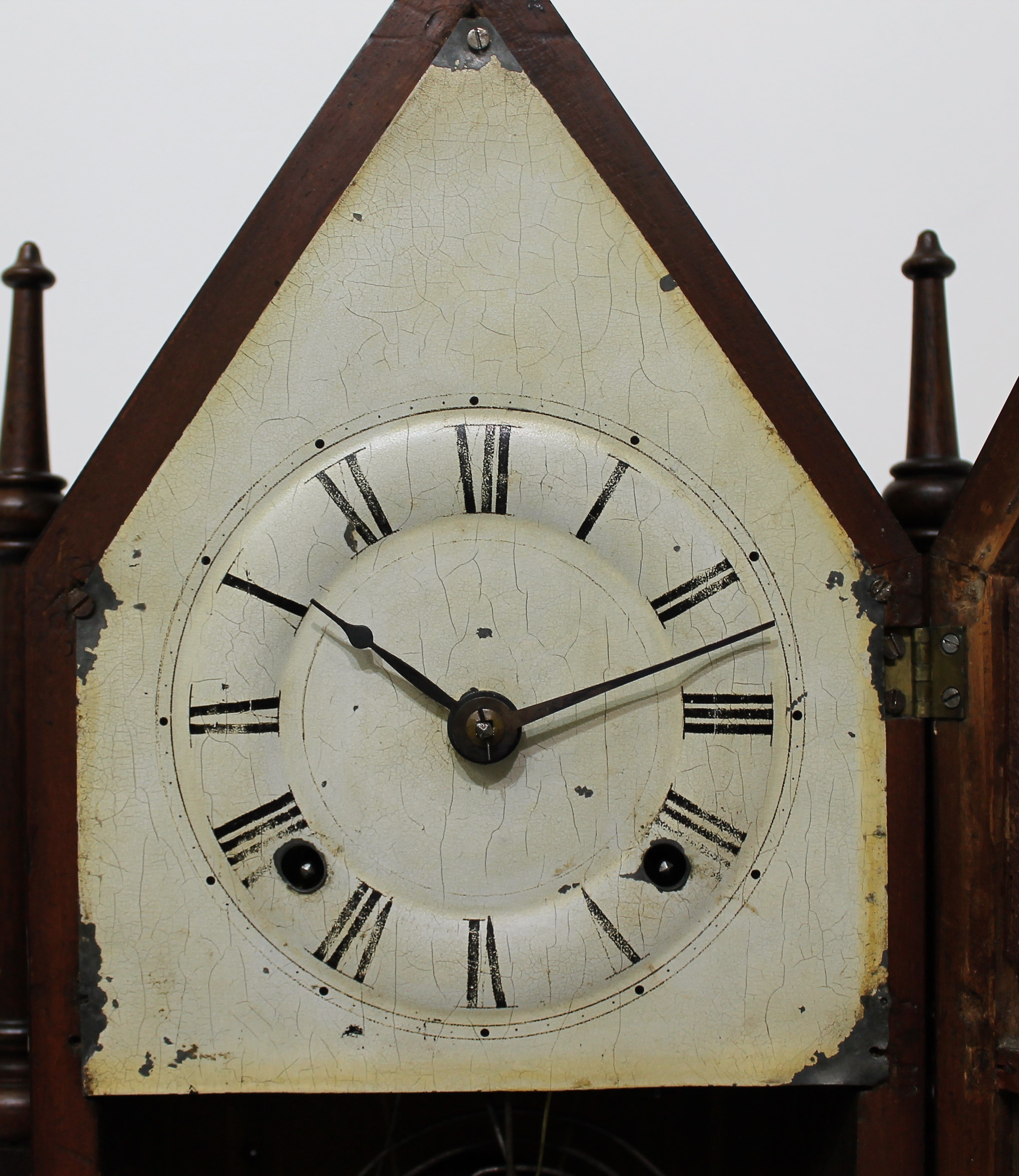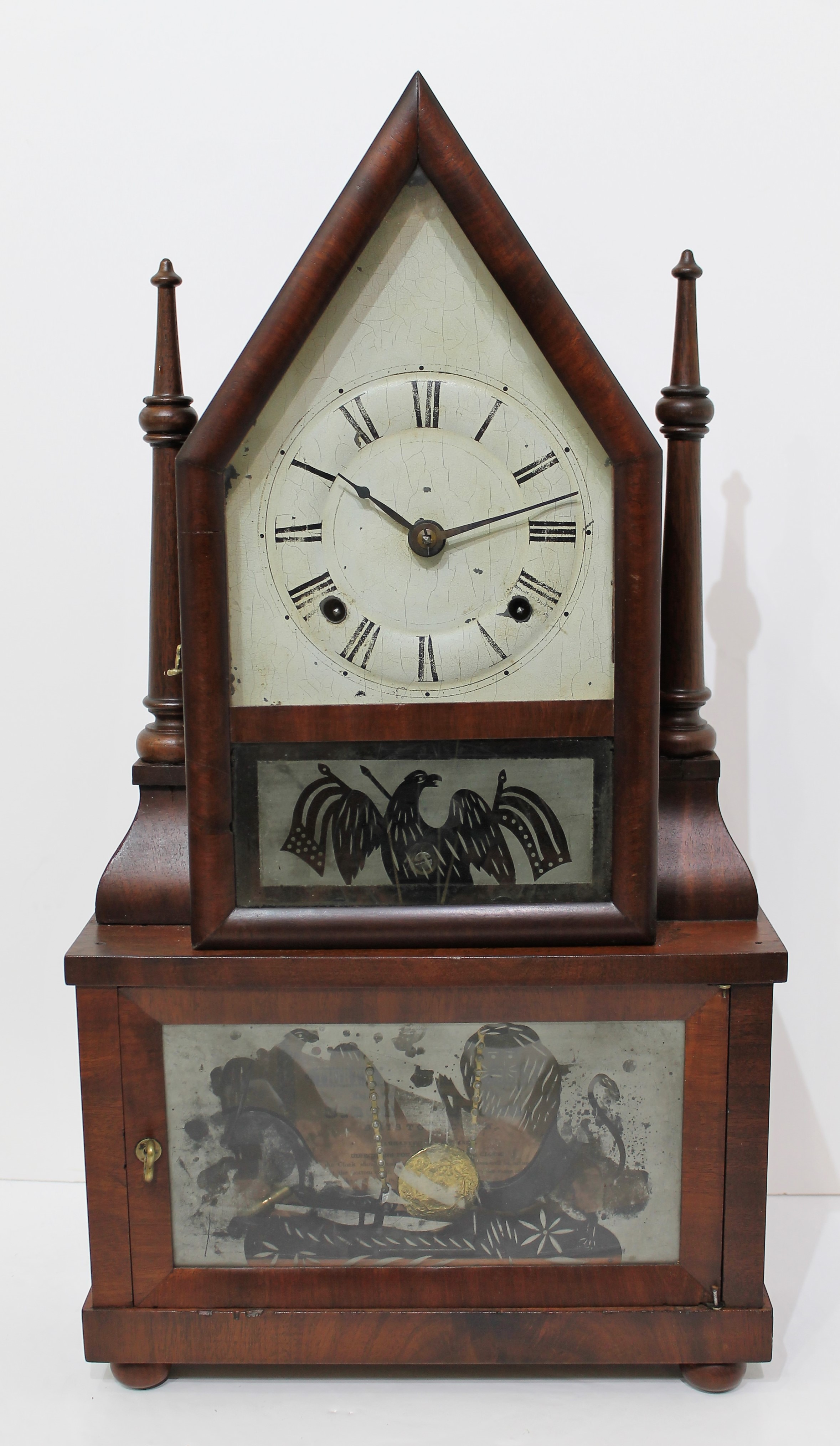 with wagon-spring movement, 1844–1848. This is a double-steeple with single candlesticks on each side and a 30-hour wagon-spring