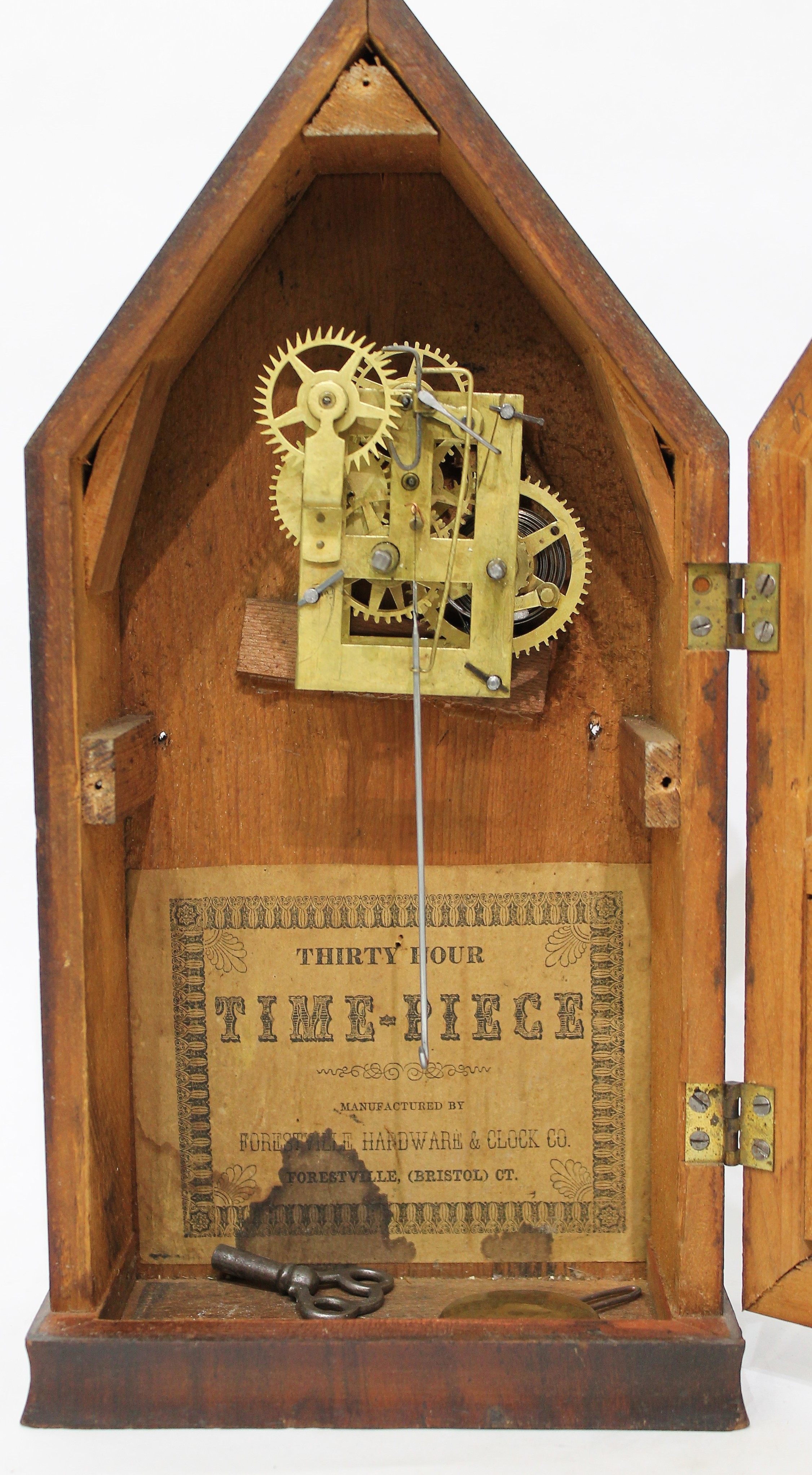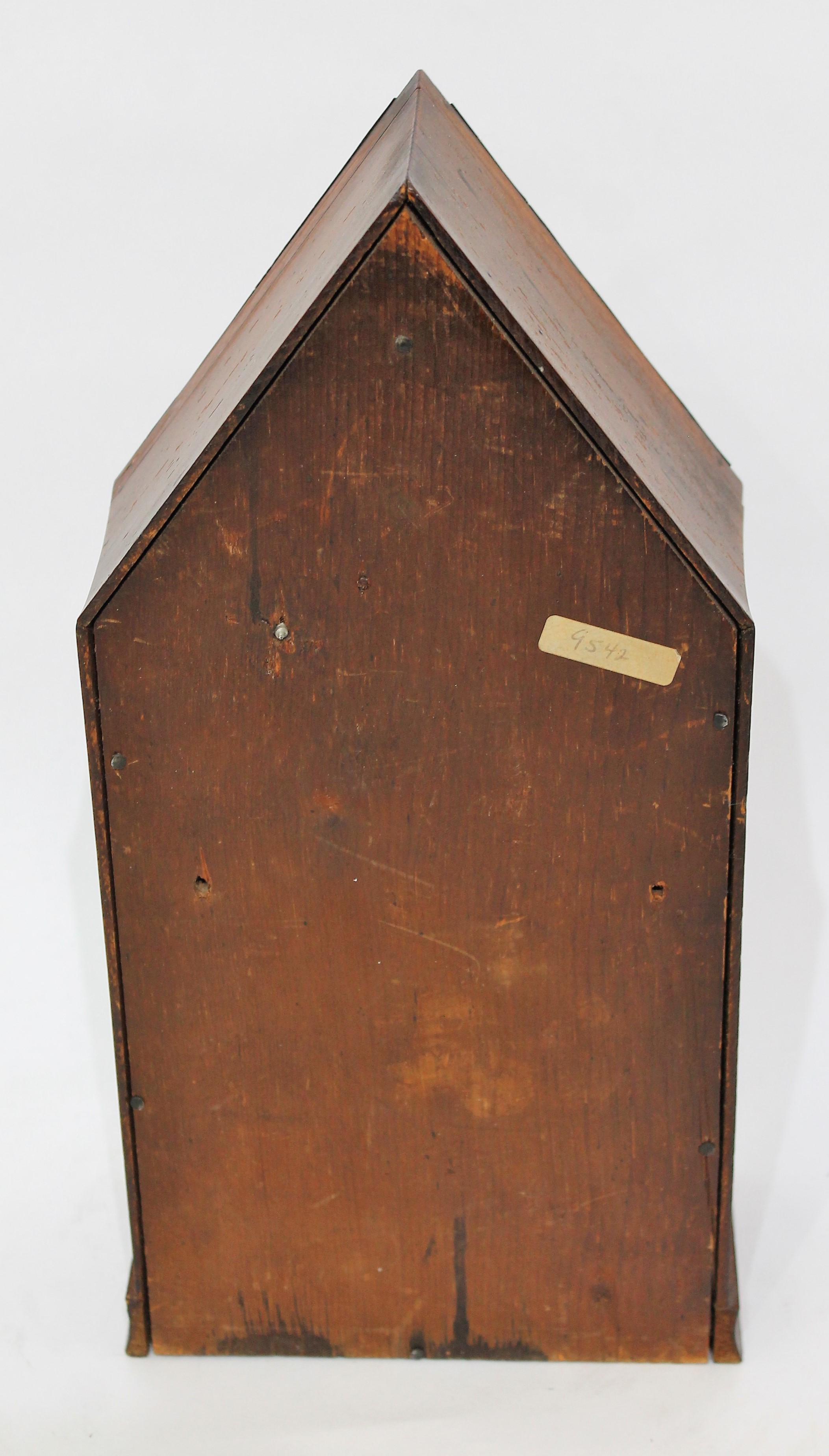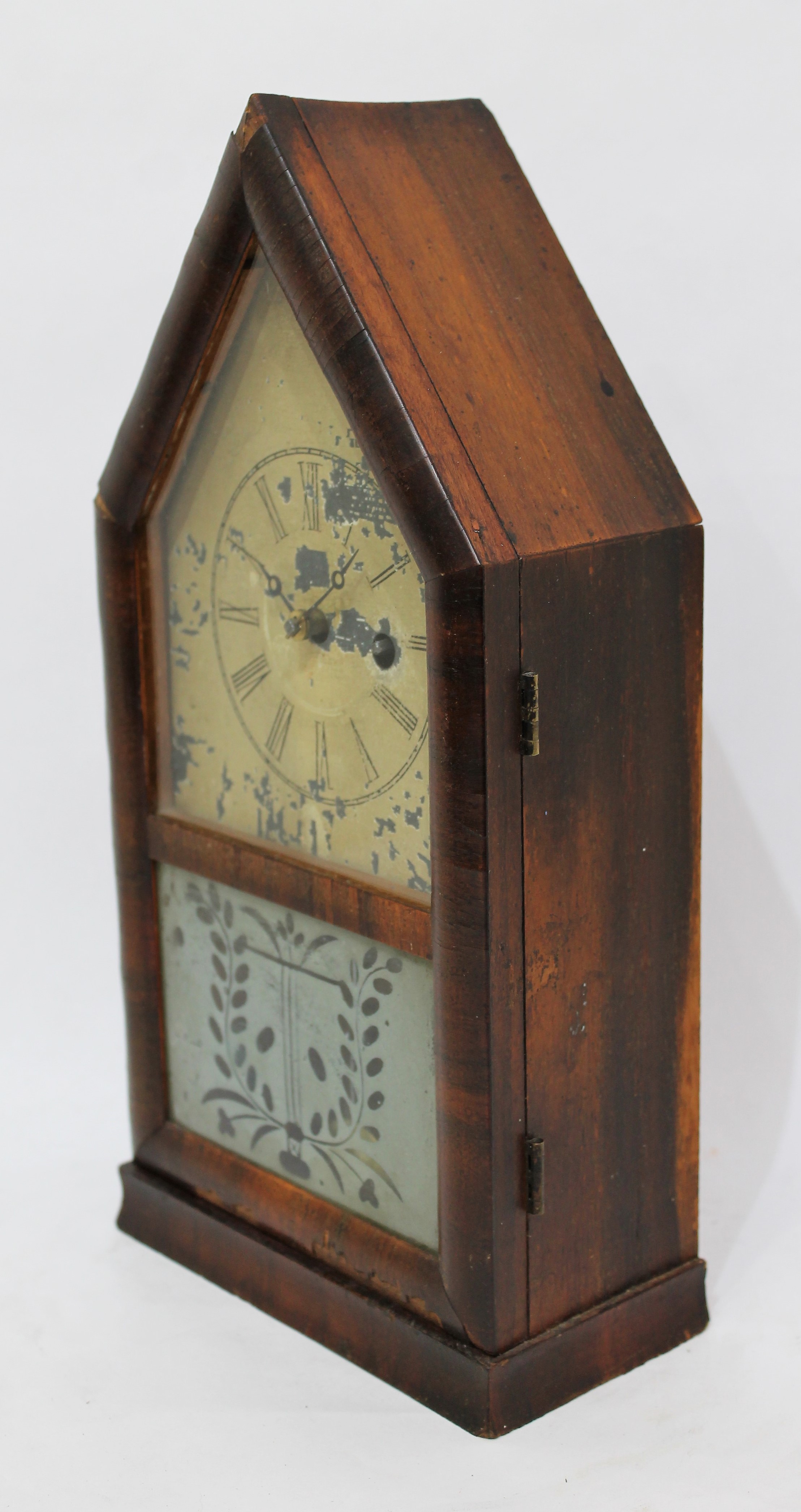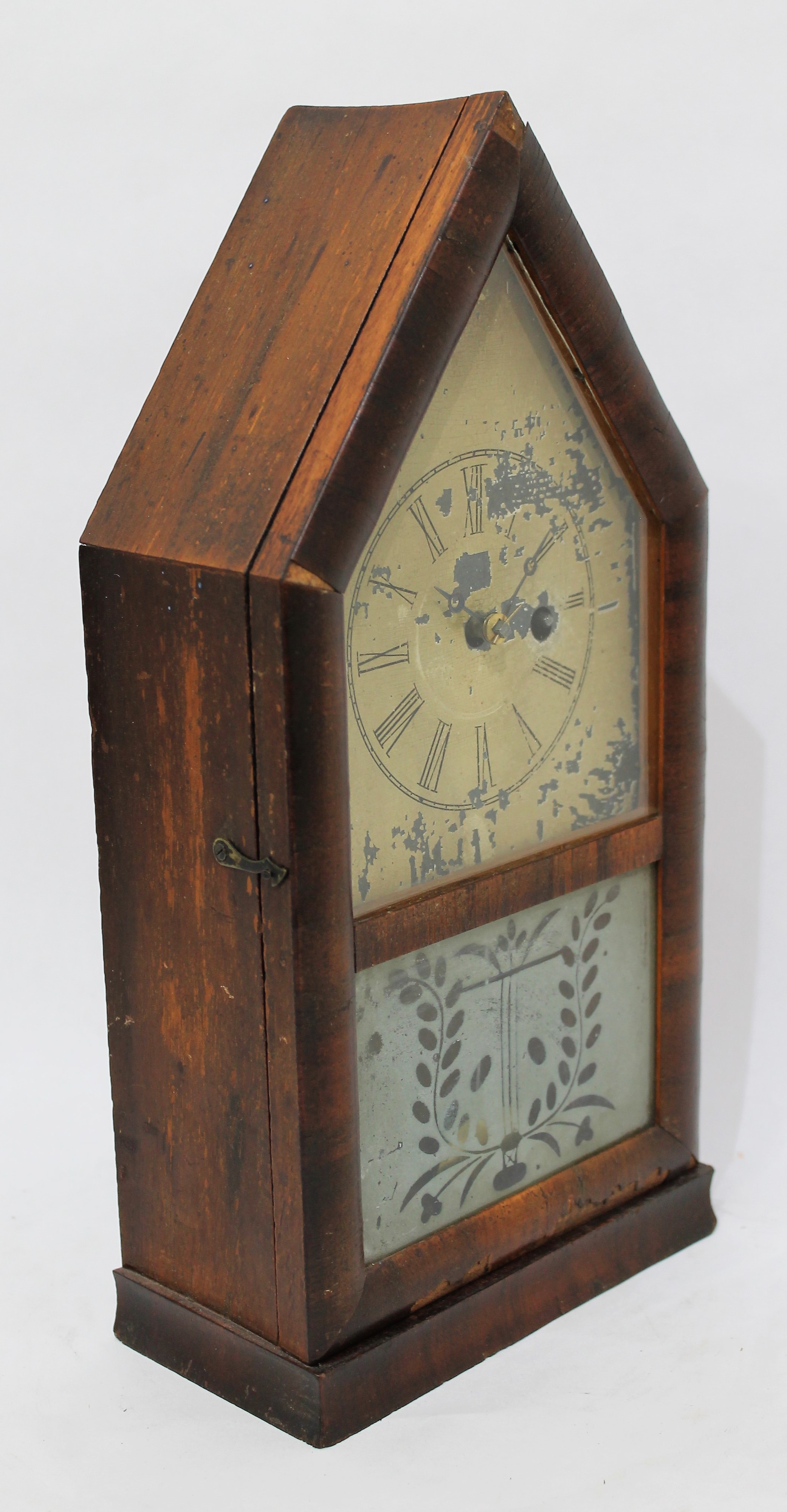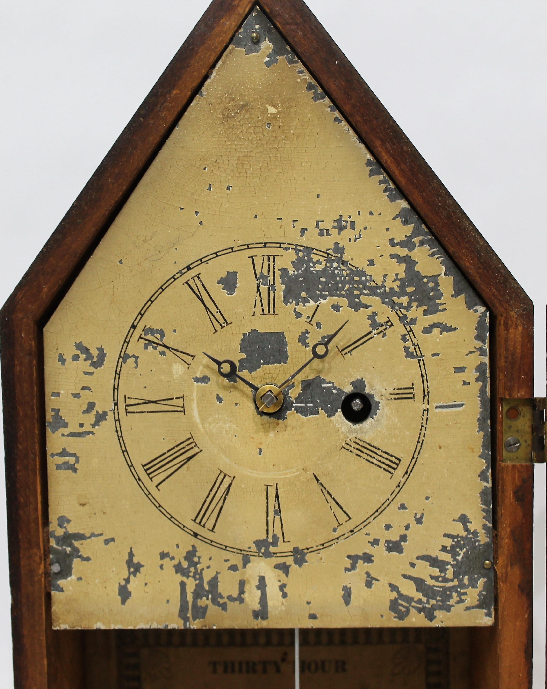 Hour Time-piece” sub-miniature steeple, 1853–1855. A second example from this company, this one without side finials. The 12.5-inch case has mahogany or walnut veneer on the front with some losses, particularly on the bottom edge of the door and at