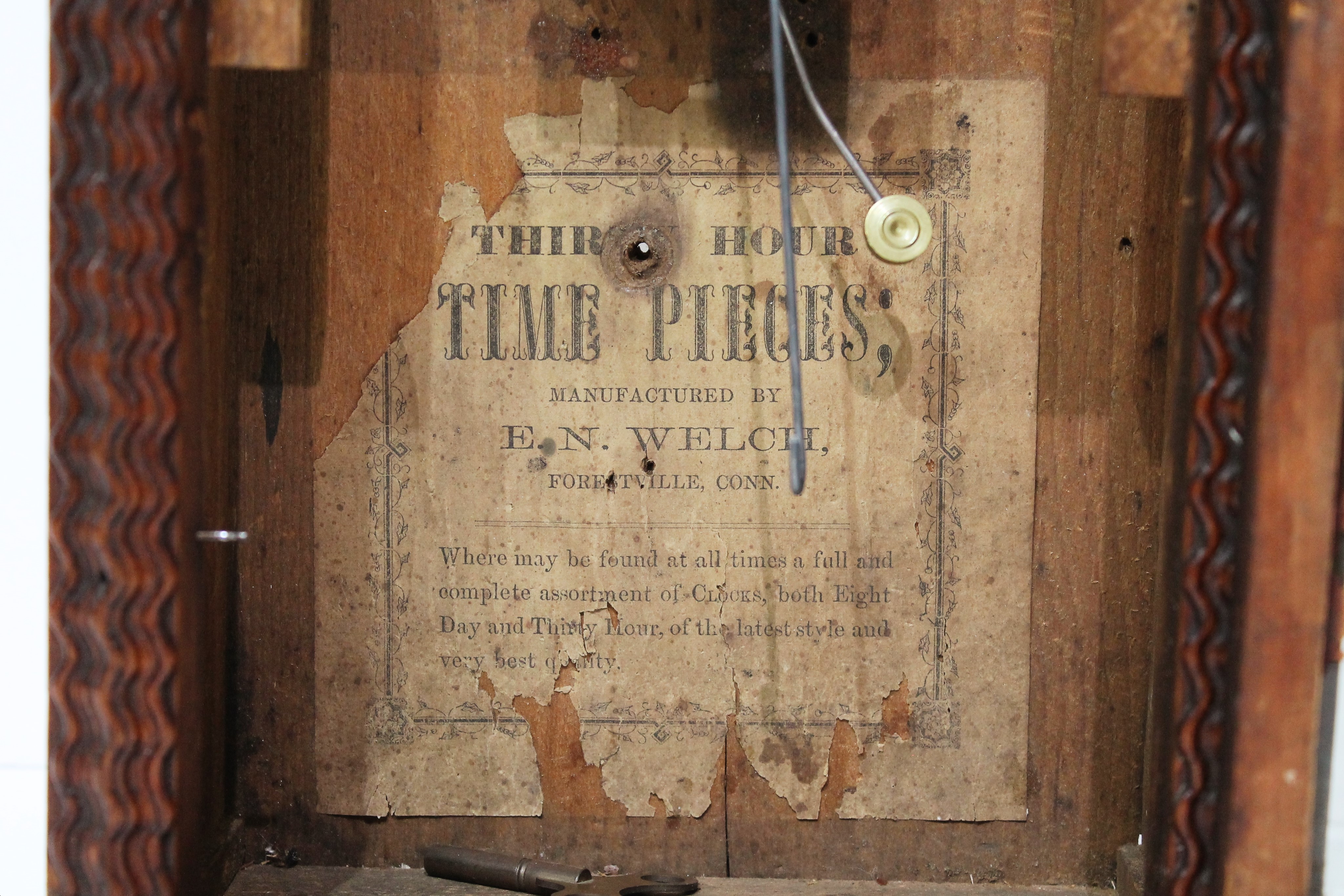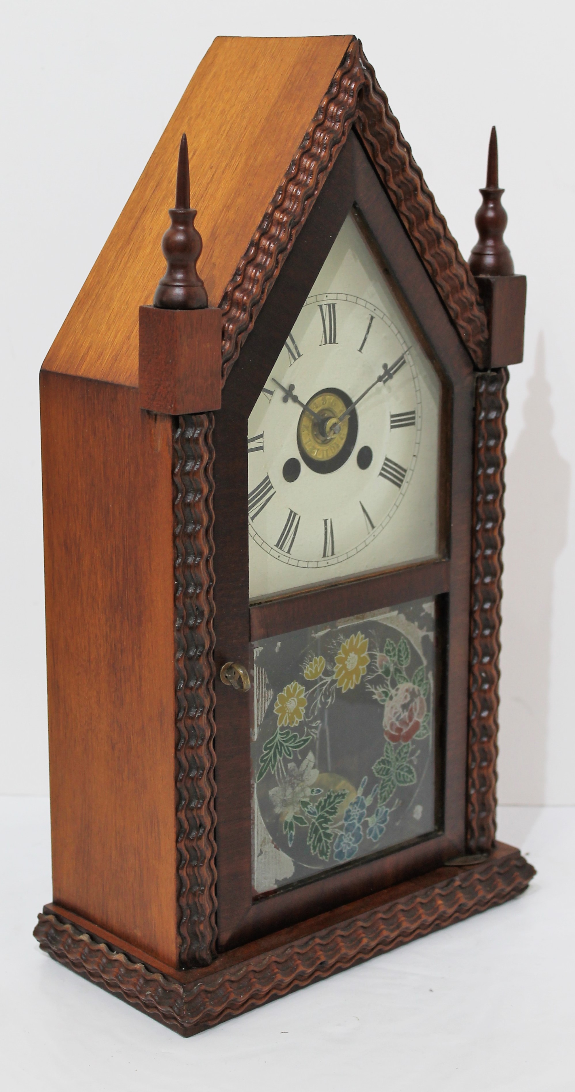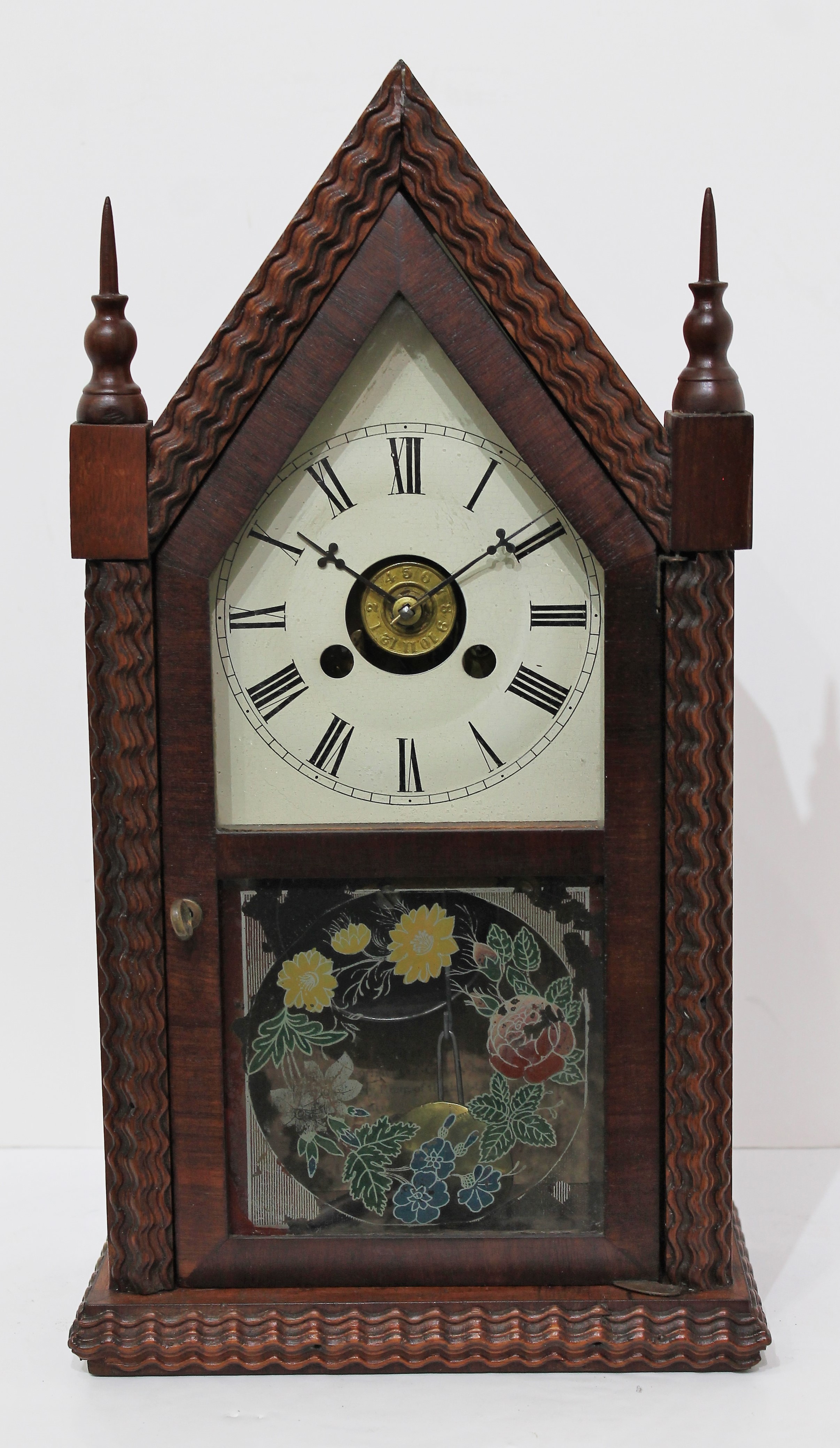 steeples was J.C. Brown, and a few were later sold by Welch after they bought out Brown. All had a Forestville movement. AAC had a similar example in January’s auction; it contained the same movement found here. Close inspection of the ripple trim