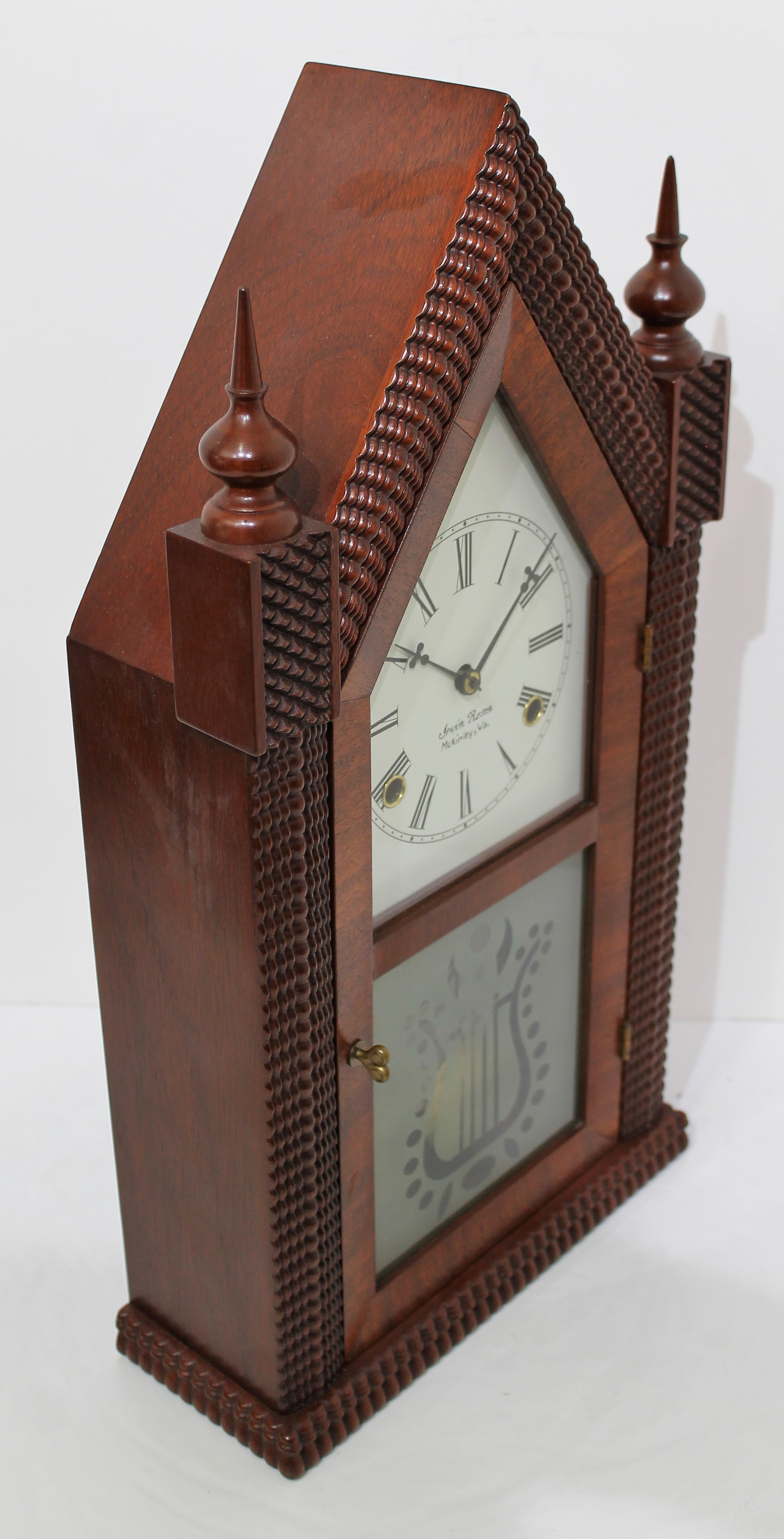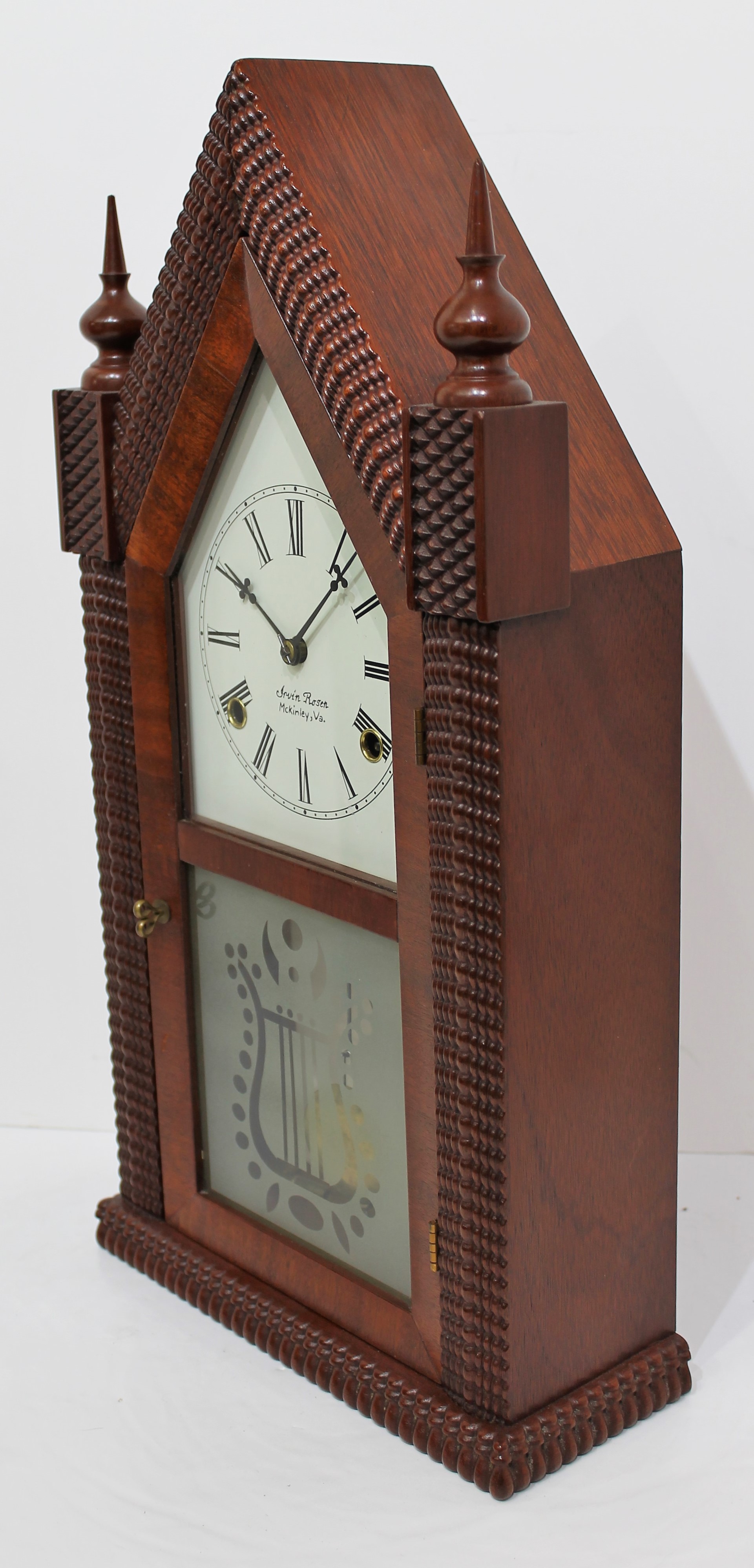 steeple. The mahogany case is 19.5 inches tall with a modern frosted glass tablet and dial glass; the signed painted dial is
