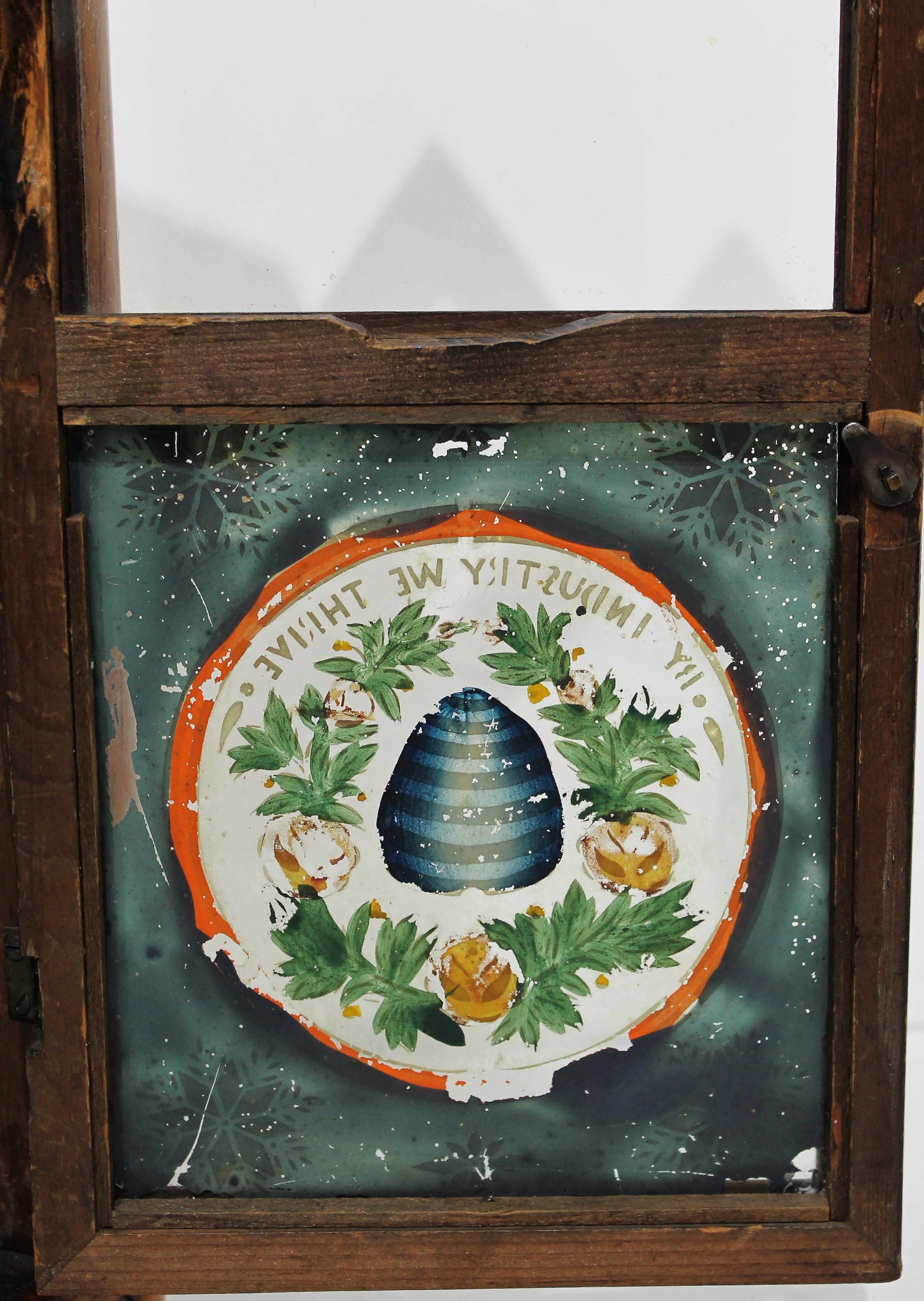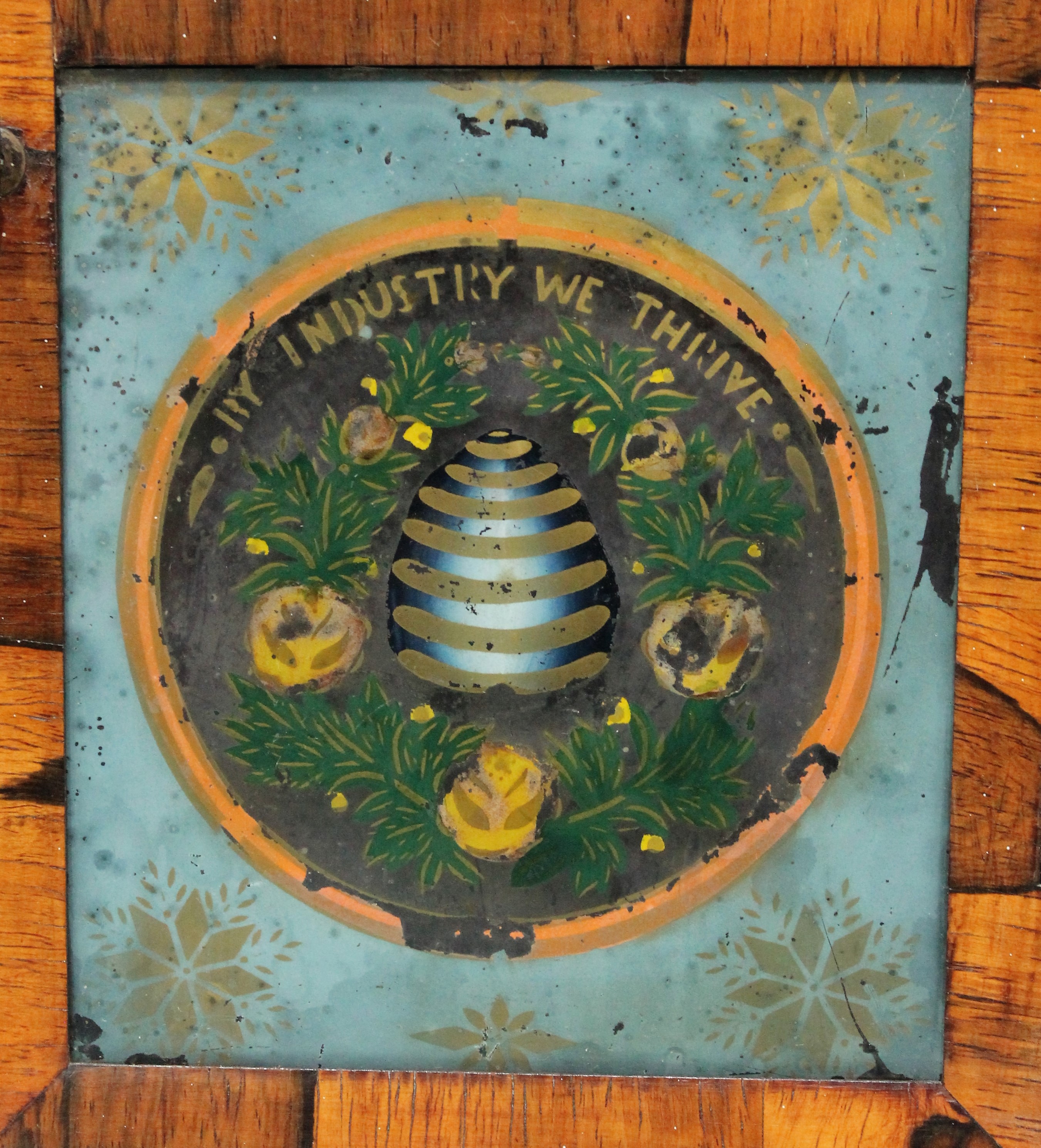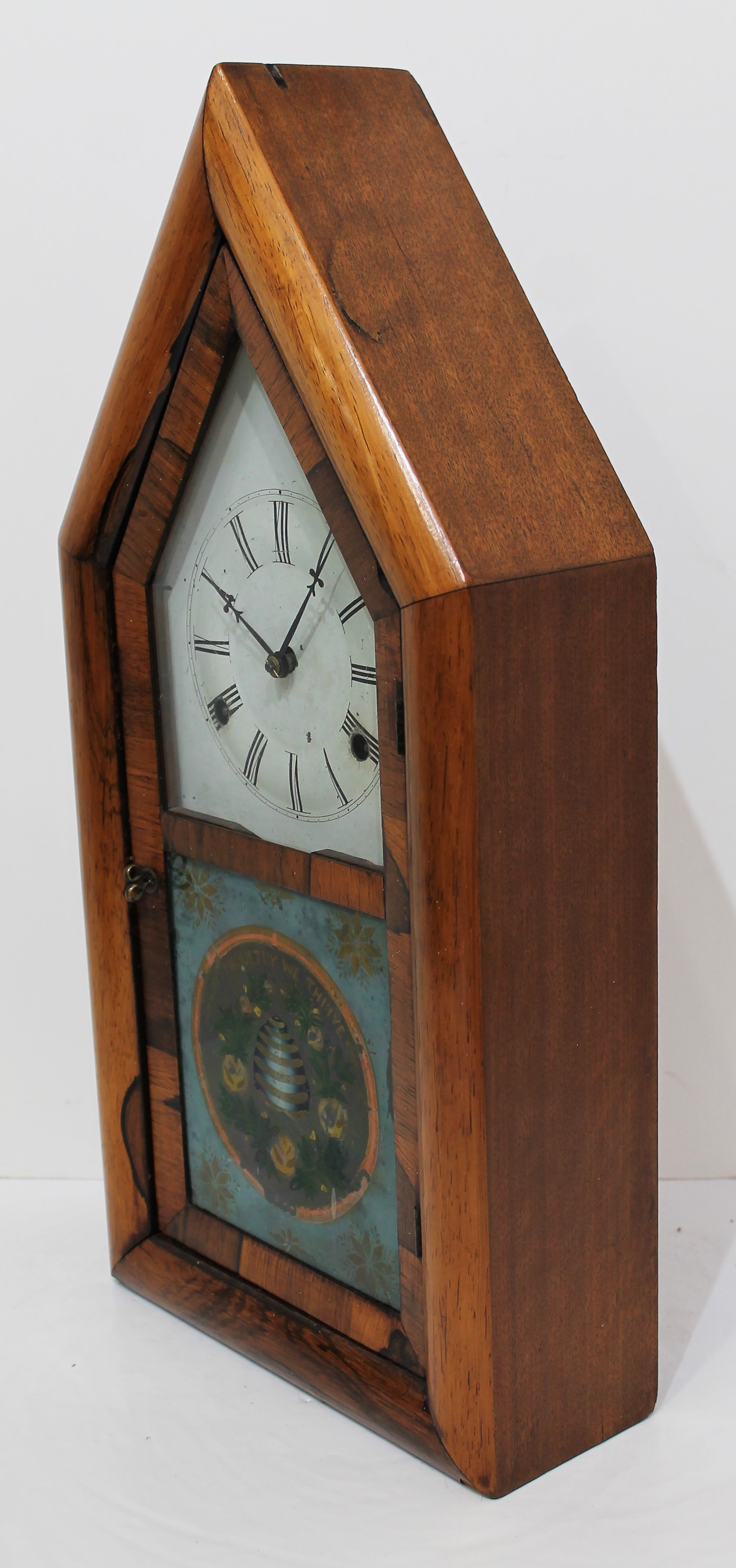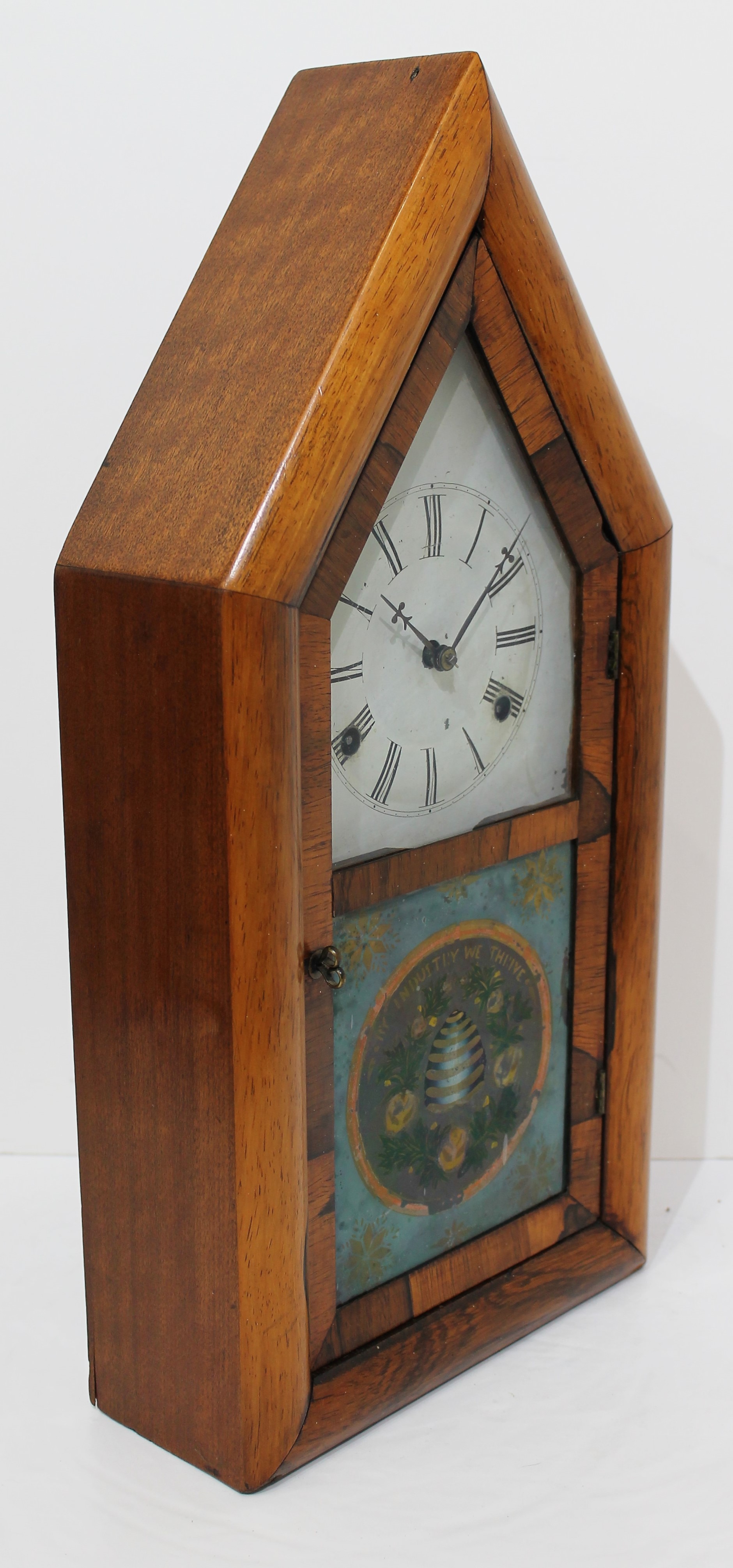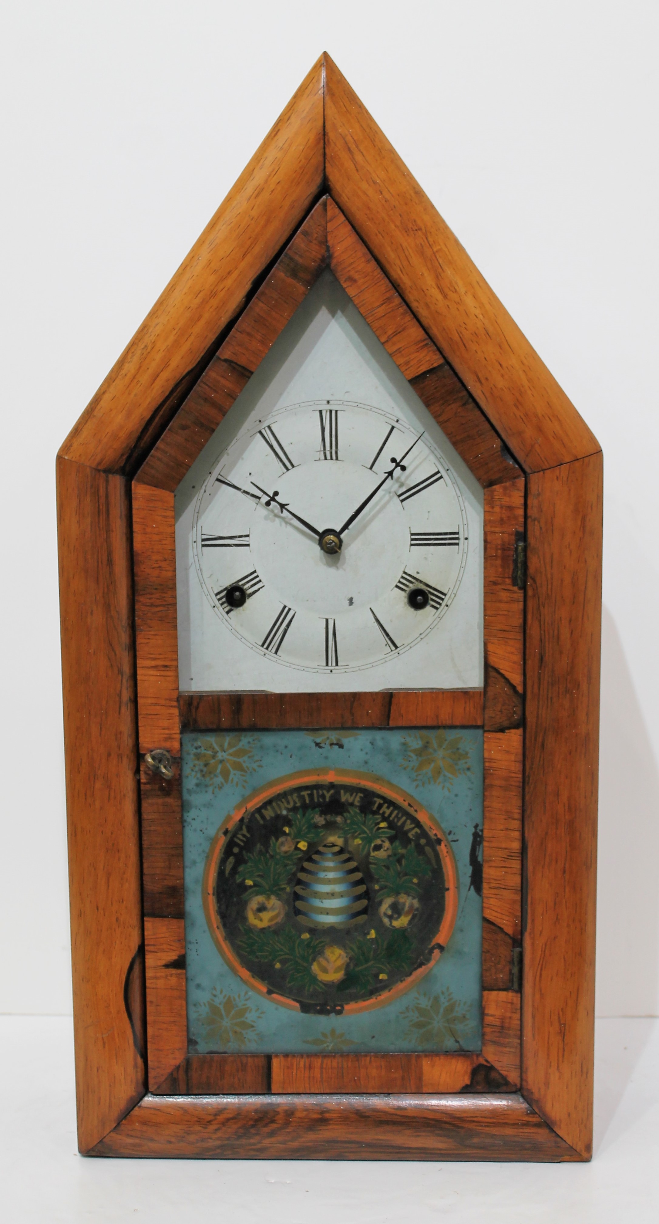a well-preserved beehive with the motto “By industry we thrive” over the top. The case has been thoroughly cleaned. The painted dial is old with some chipping, the hands period replacements. The 30-hour time-and-strike brass movement is unsigned,