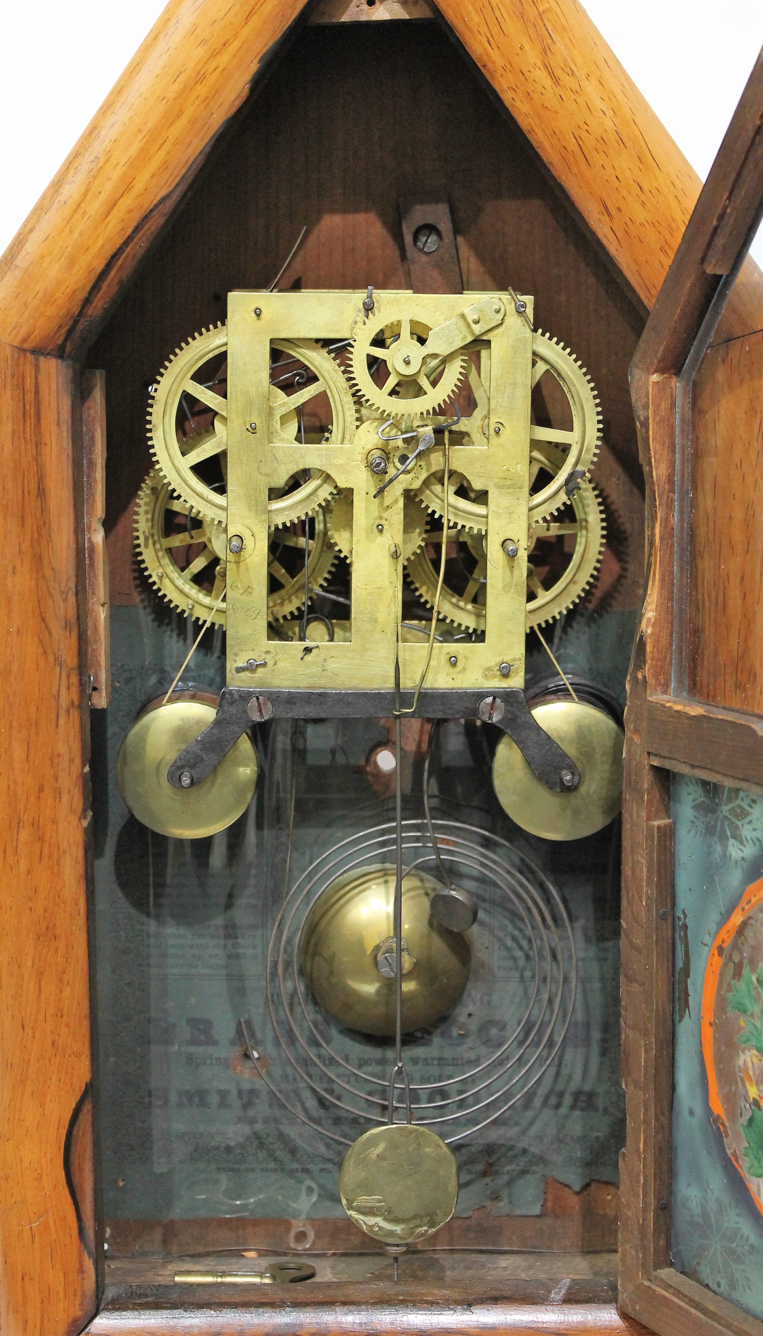 running and striking on the wire gong; the springs are located behind the attached wooden fusees. There is a green label behind