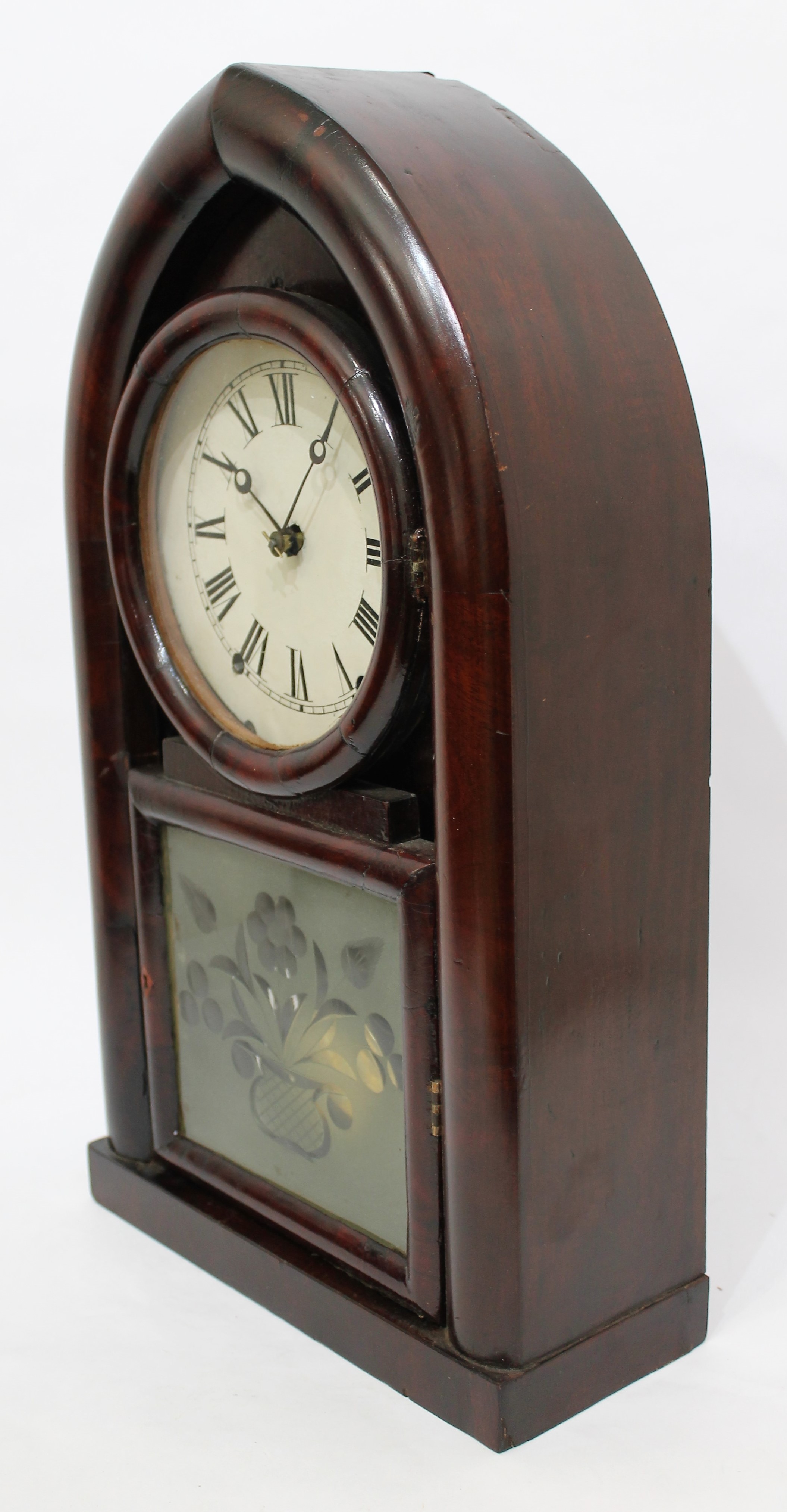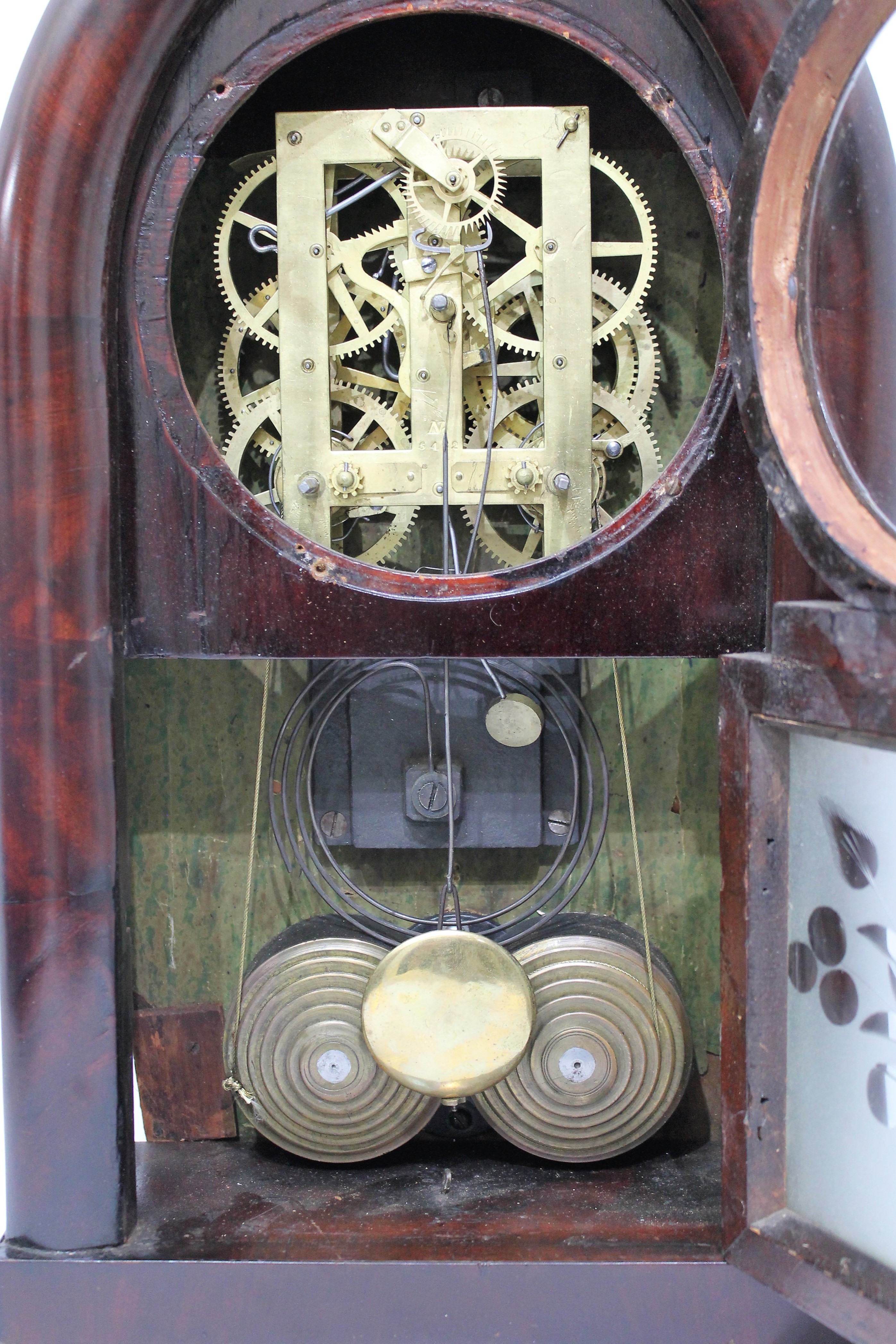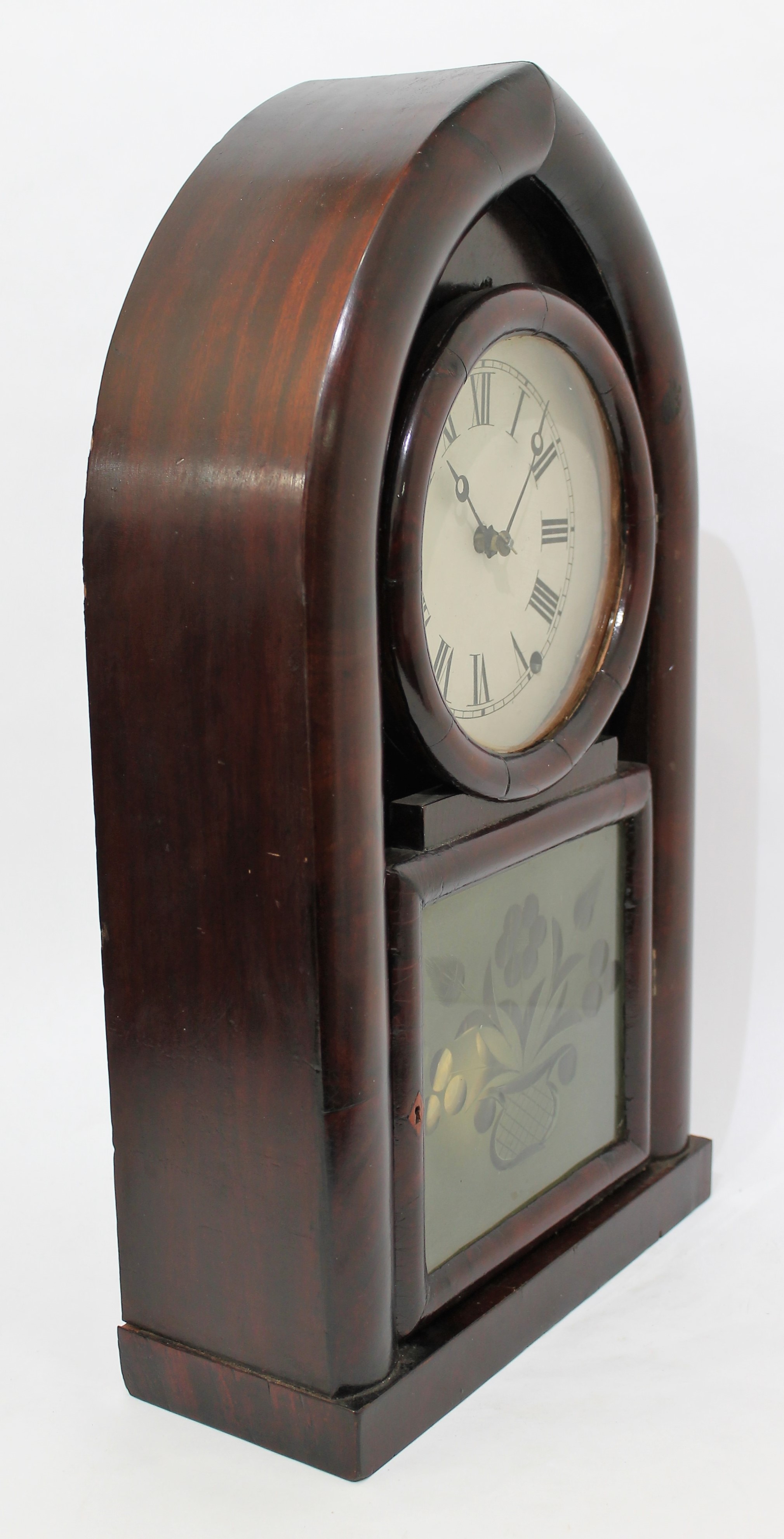 the door frame. The dial glass appears to be a replacement, with newer putty, while the cut glass tablet is original. These clocks usually had wooden dials, but here it is a metal dial that was repainted by Kathi Edwards. The hands are replacements. The movement is numbered 5452, making it a late production; it is not signed as was typical, and is the second generation of this