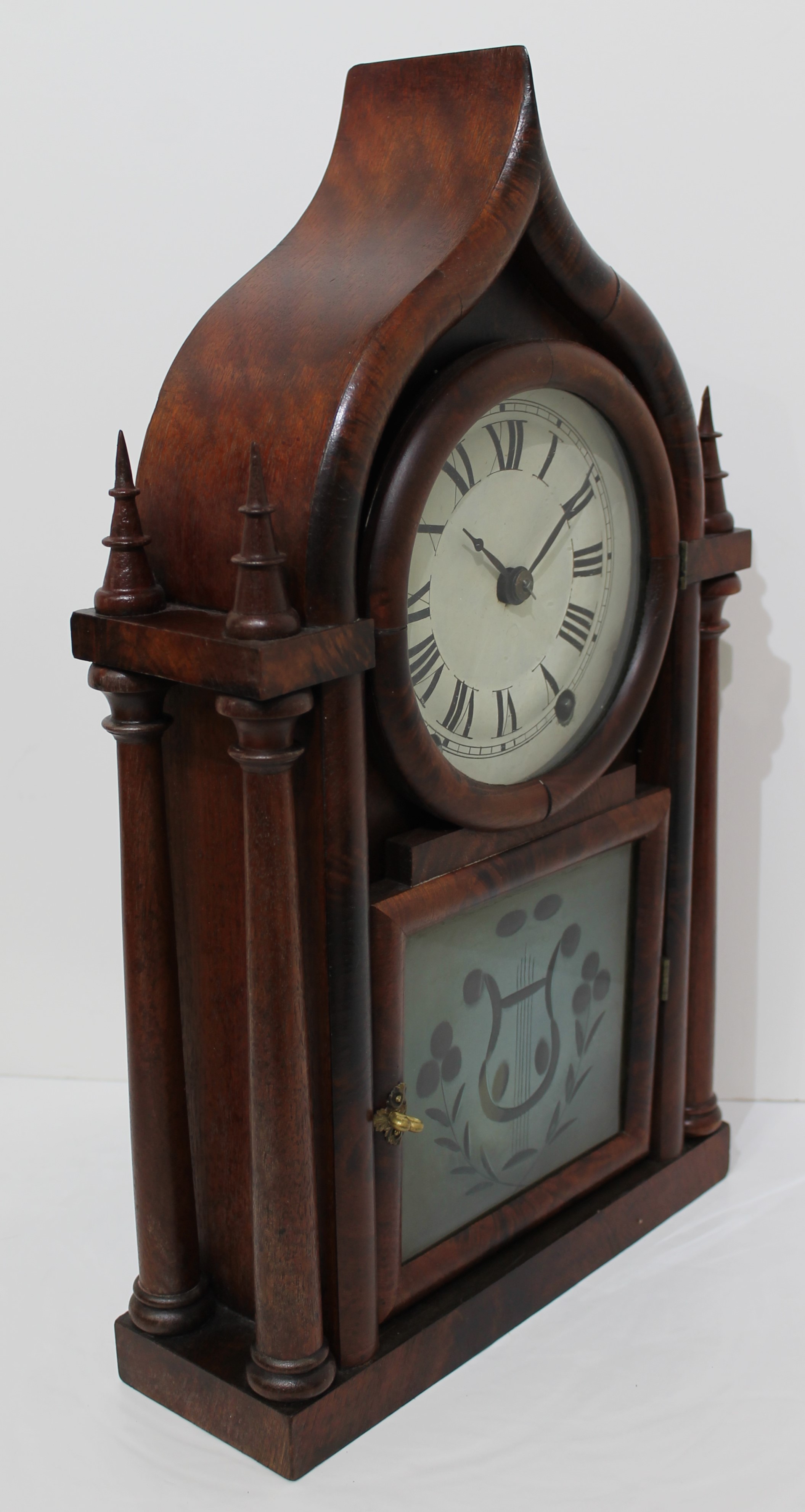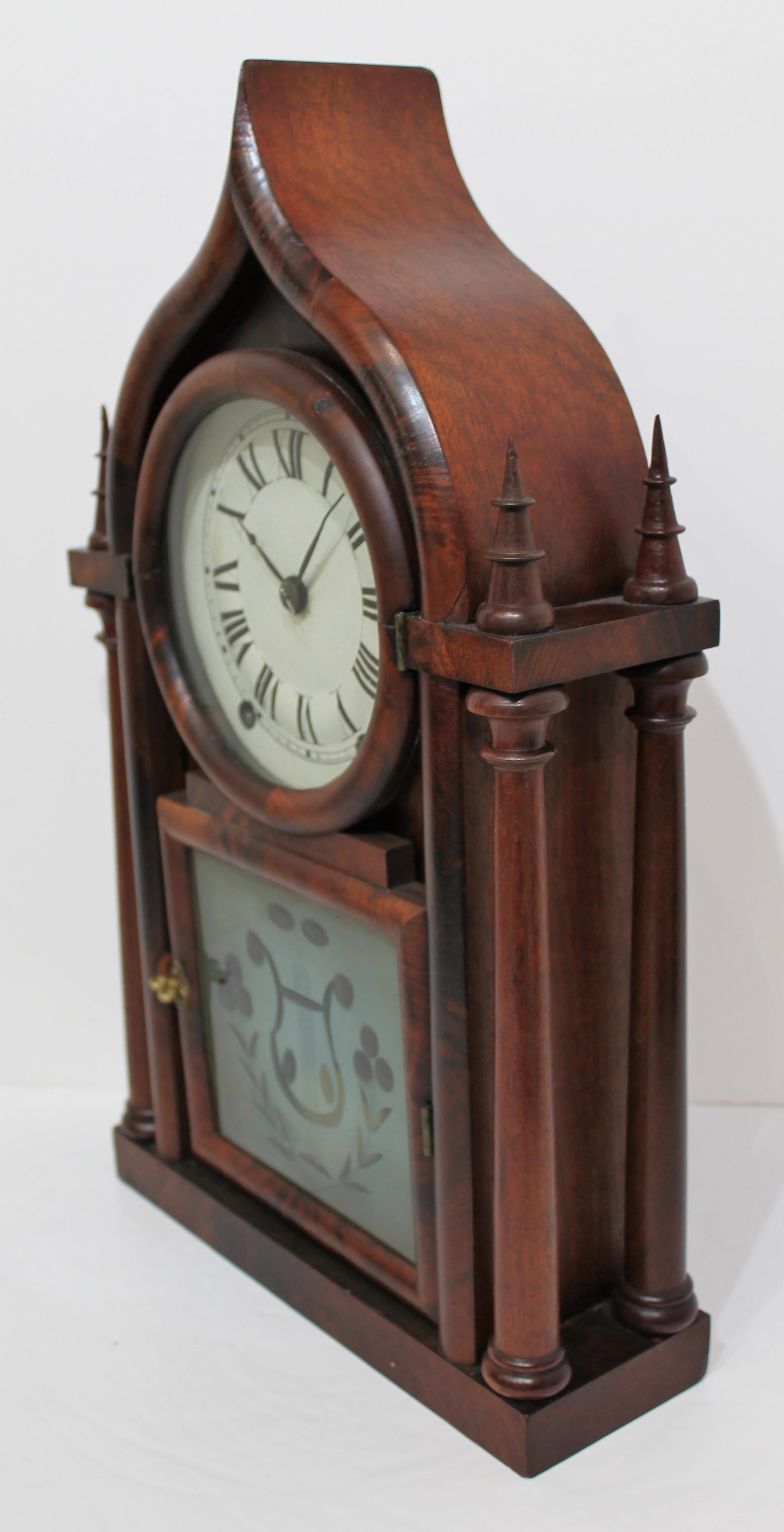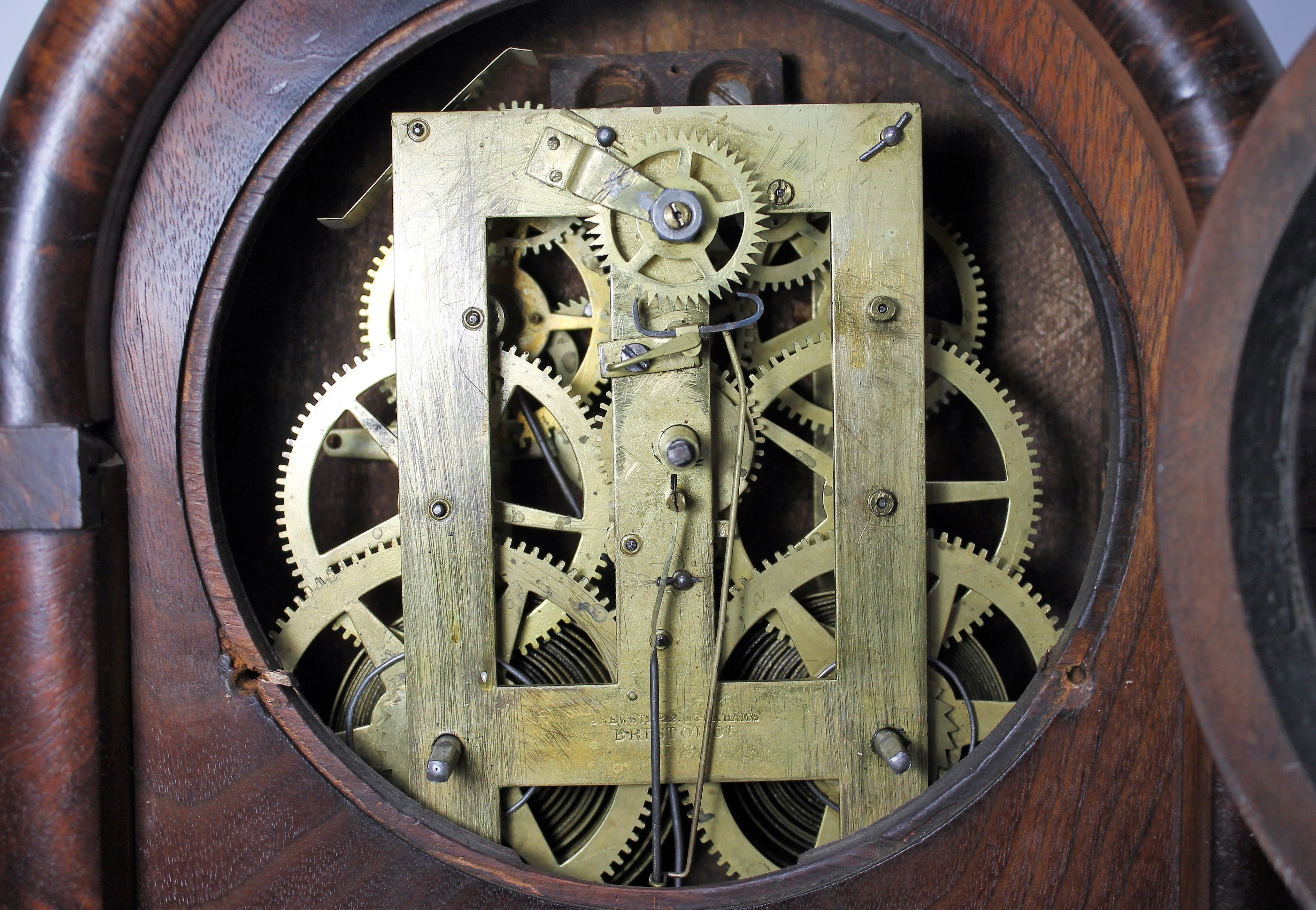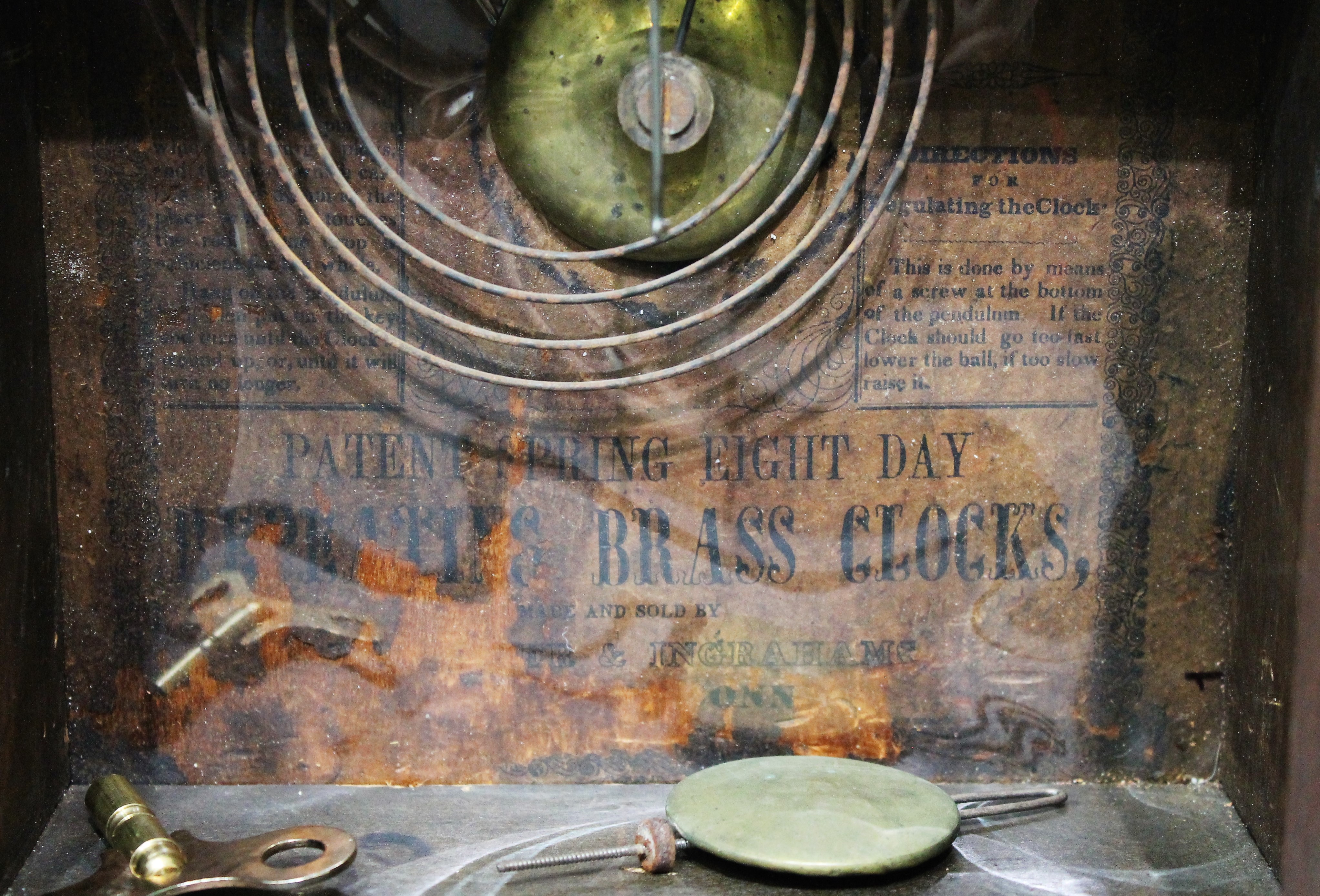 both springs are brass, and it is die-stamped with the makers. You can see the rack strike in the back of the movement. There is a dark label with some losses inside behind plastic. Schmitt Horan sold a very similar example last year for $550. I’d call that a steal. $500–$1200.