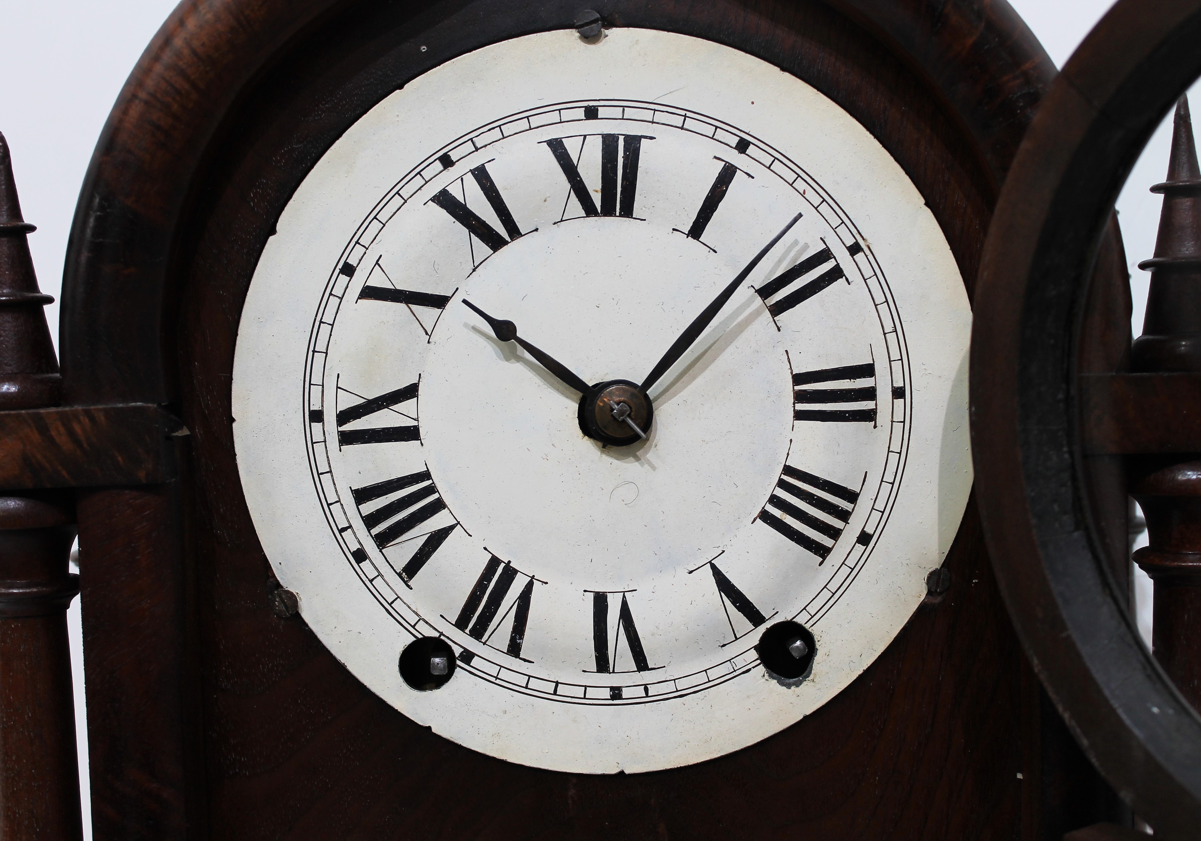 an old repaint, the hands are likely original. The 8-day, time-and-strike movement is running and striking on the wire gong;