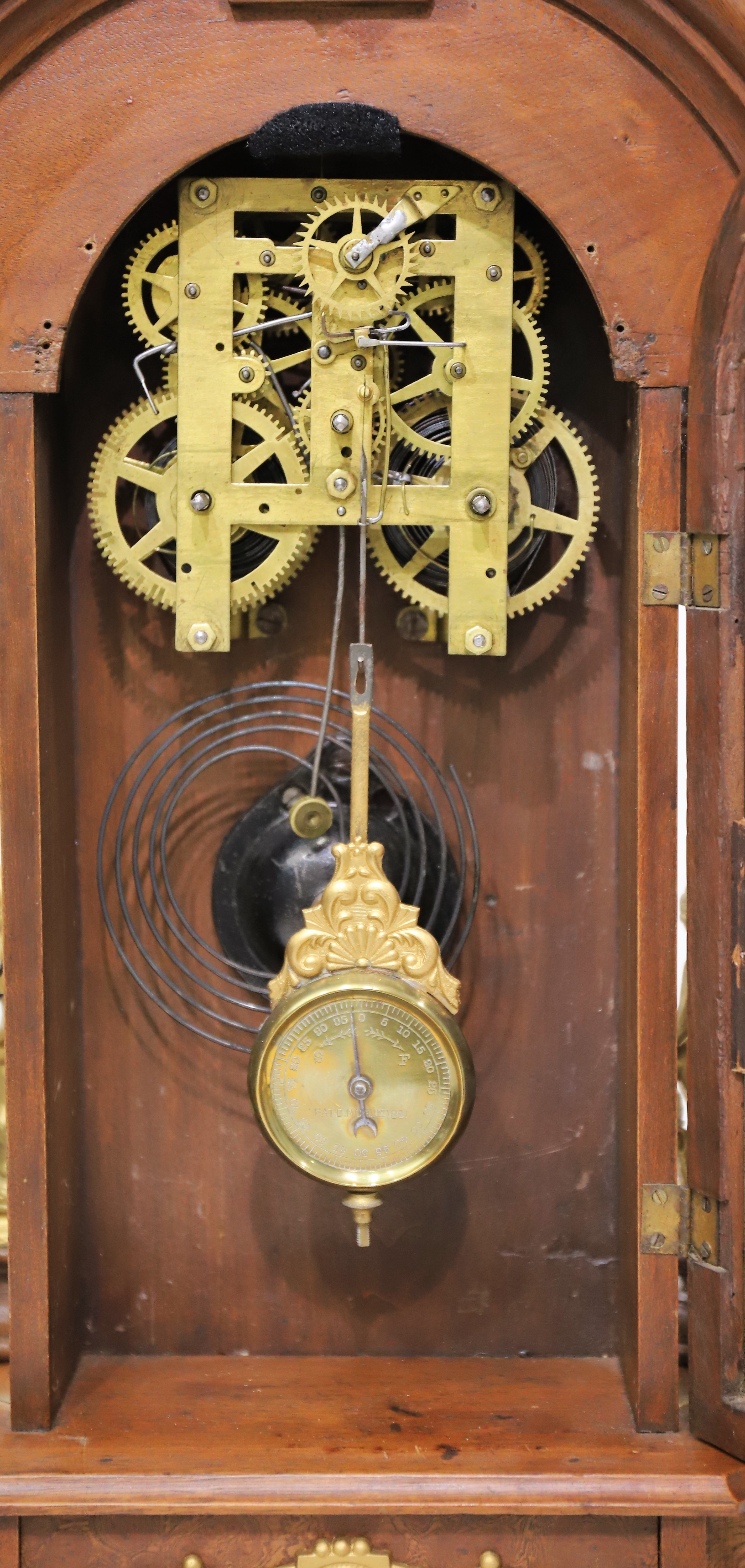 time-and-strike movement is running and striking on a wire gong; there is a fancy adjustable pendulum. The label on the back
