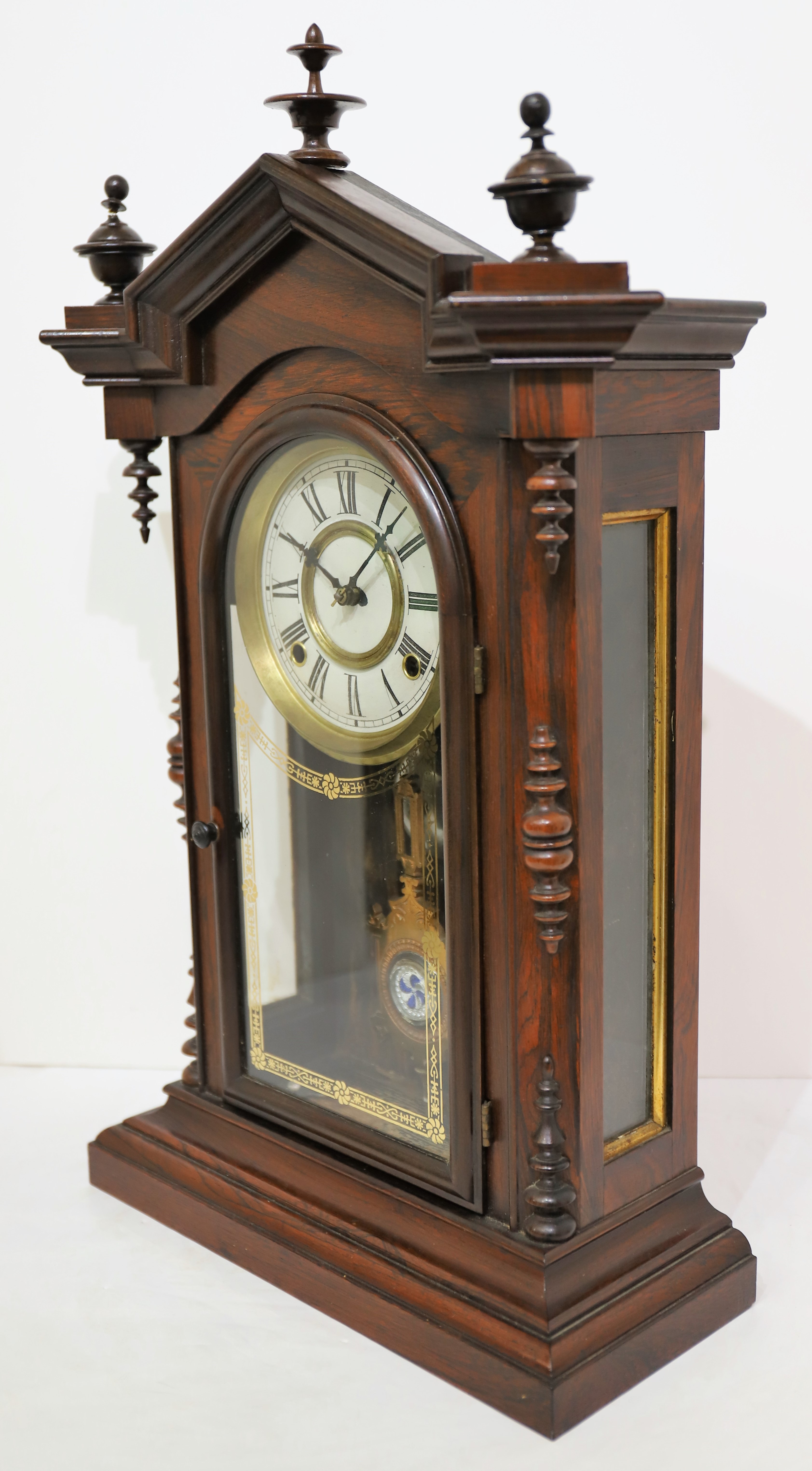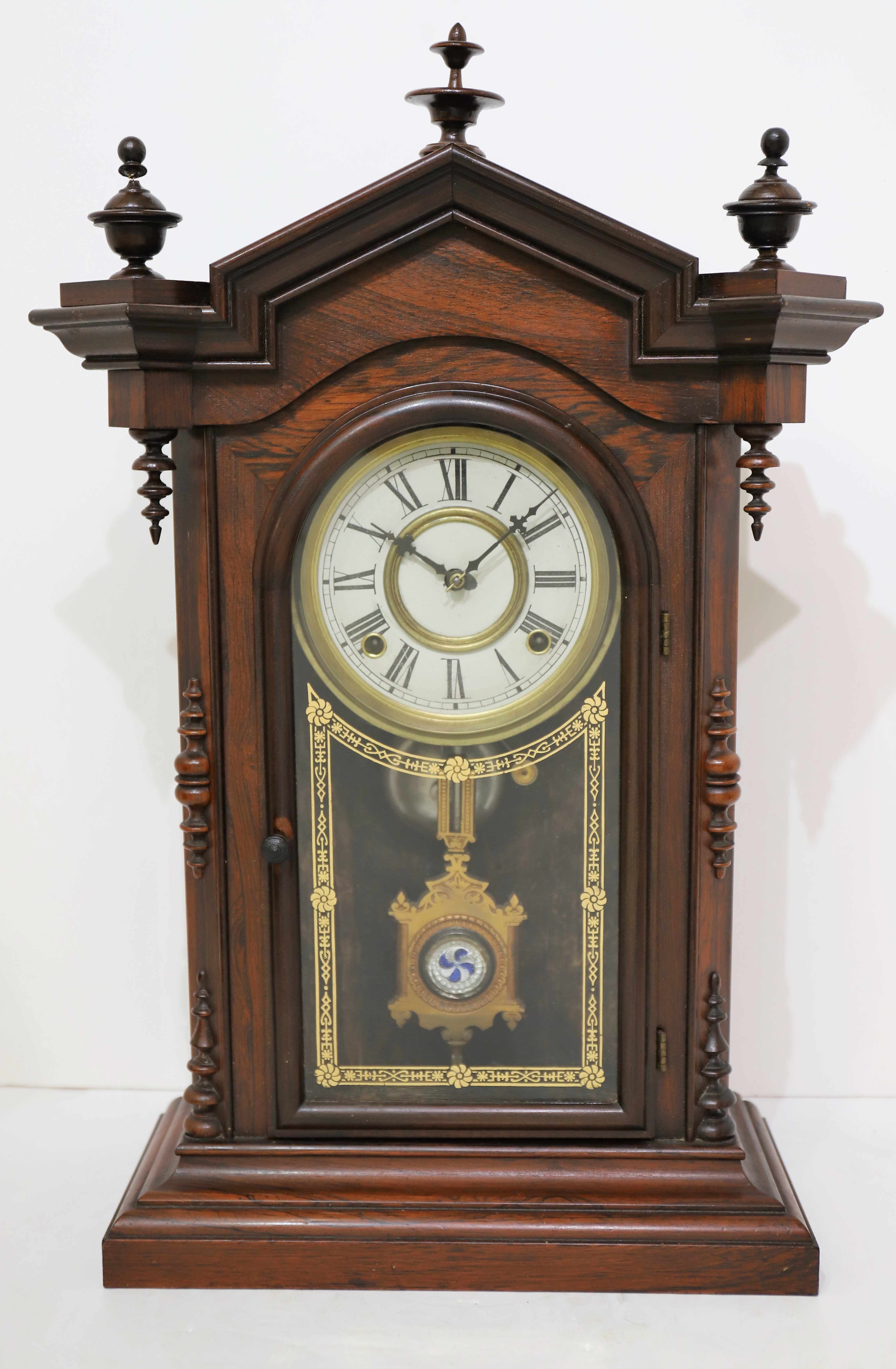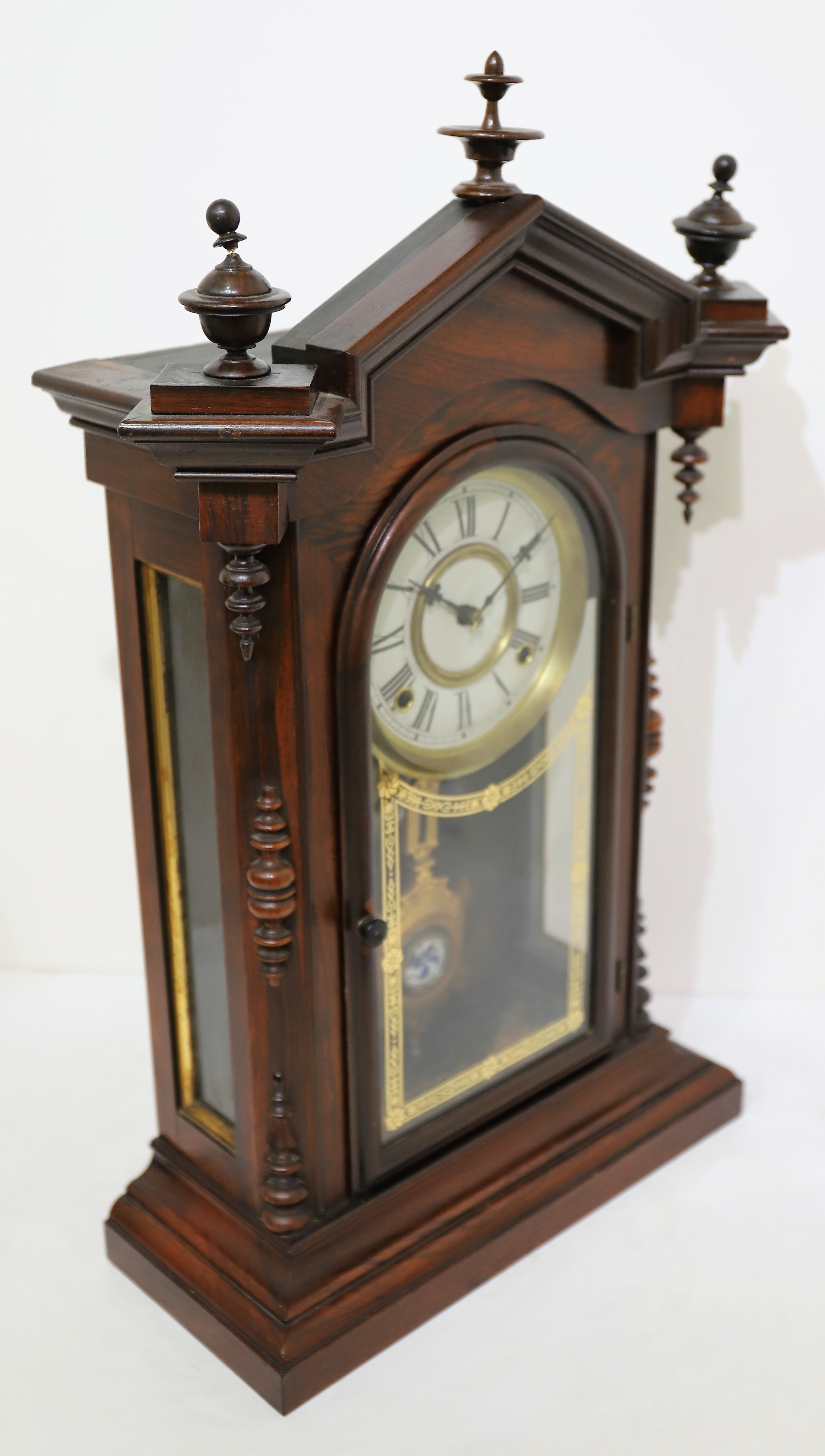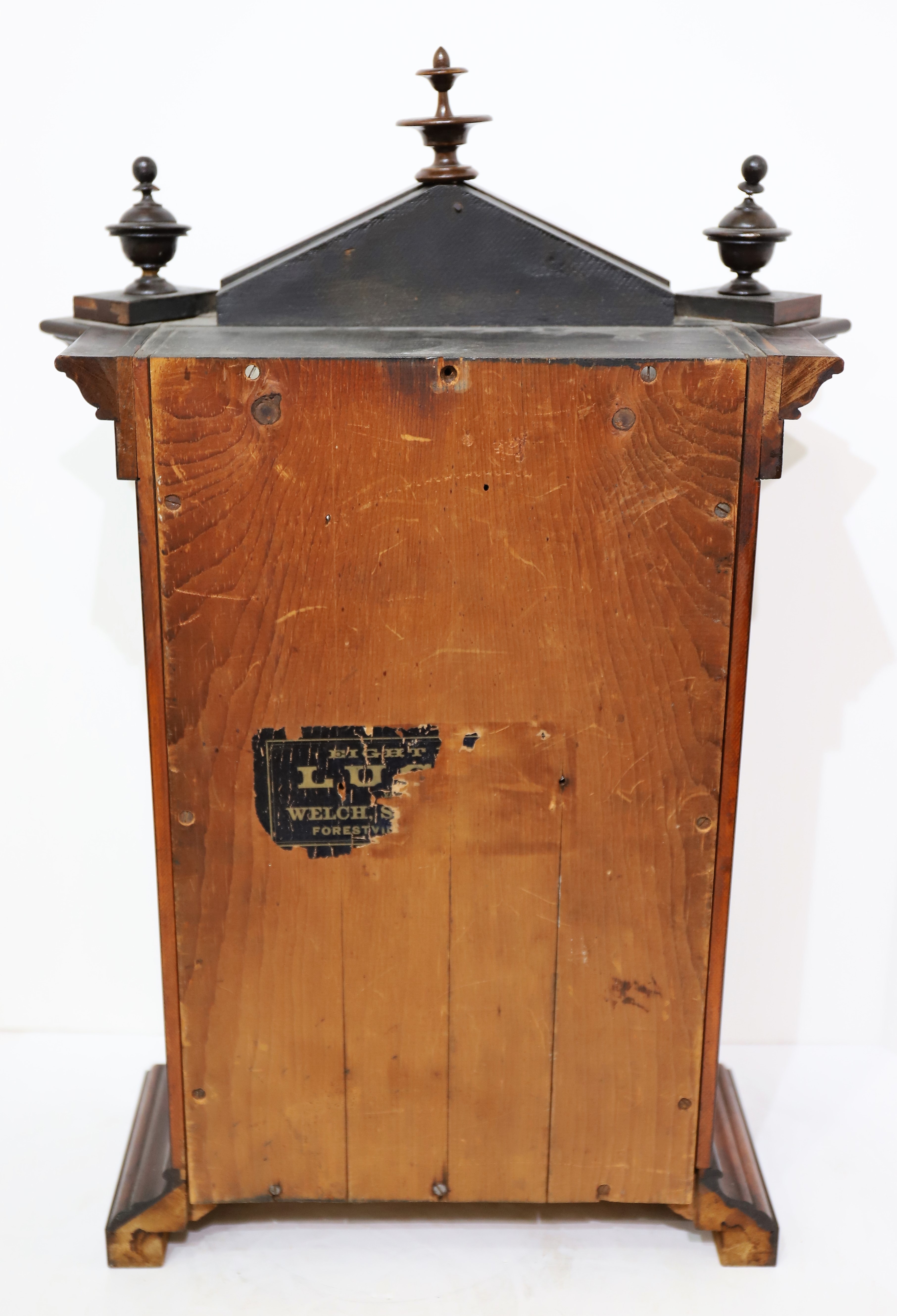 parlor clocks. The two side finials are correct for this model but both have been broken and repaired; the center finial is