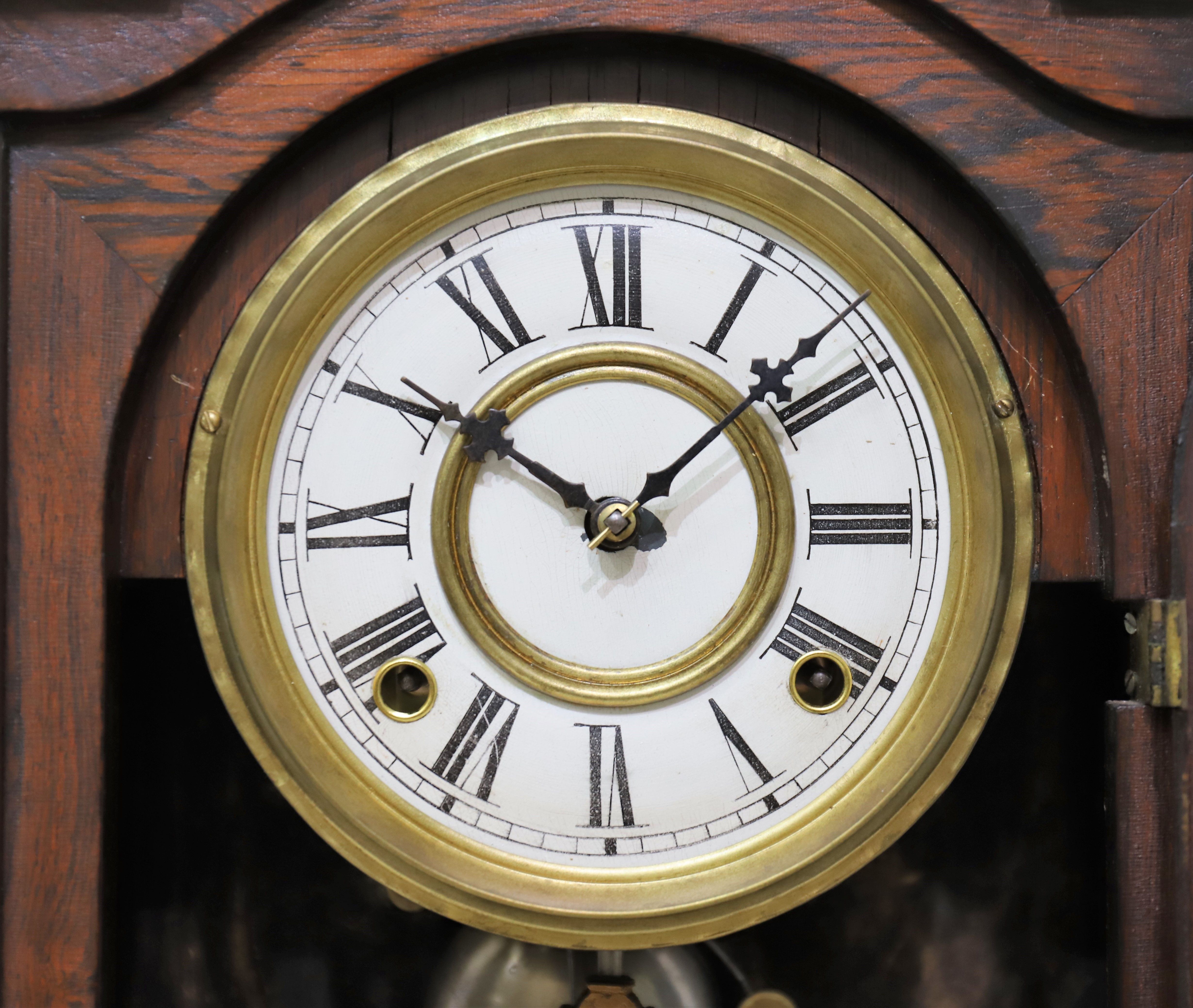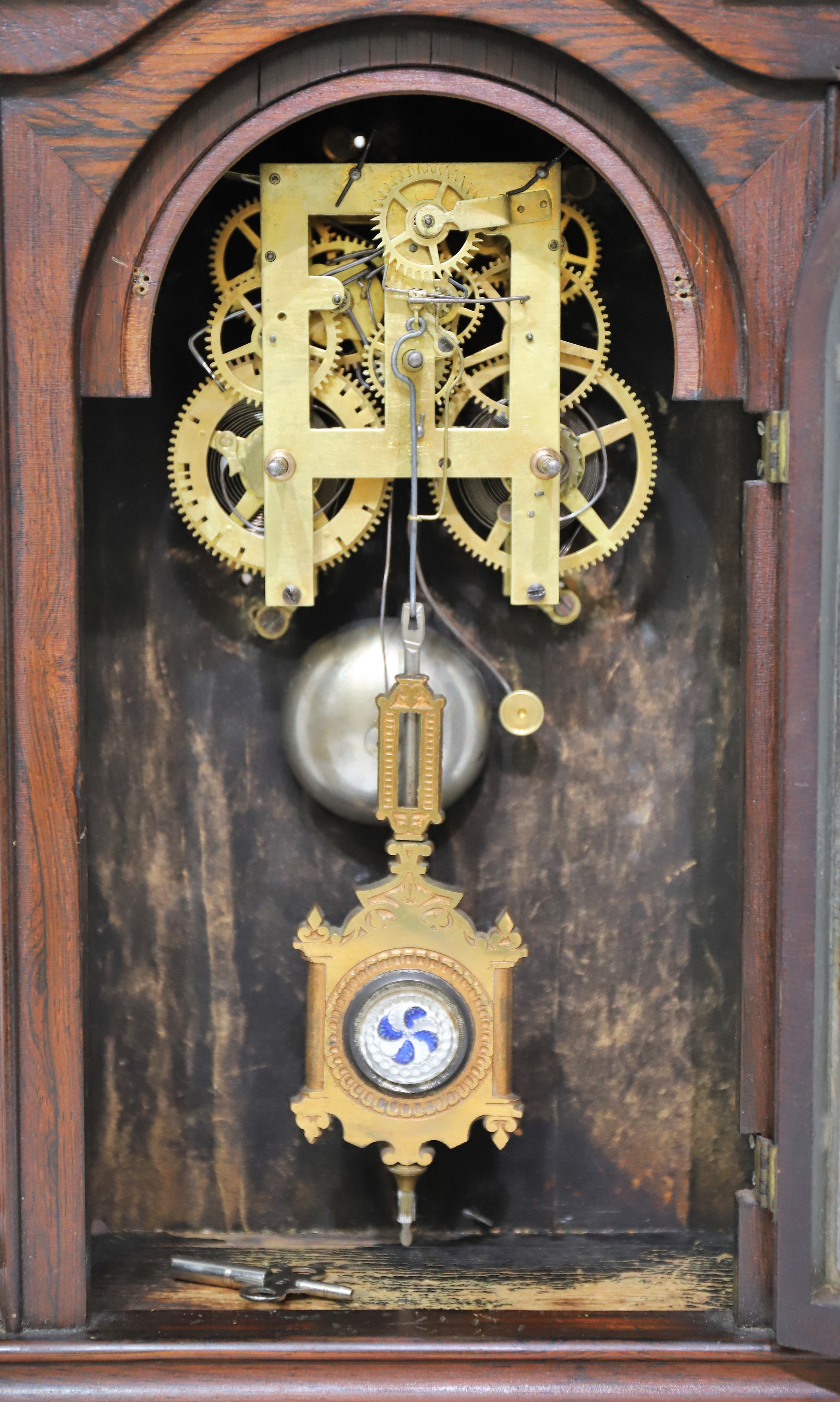 the hands are appropriate. The 8-day, time-and-strike movement is signed E.N. Welch M.F.G. Co and is running, not strongly,