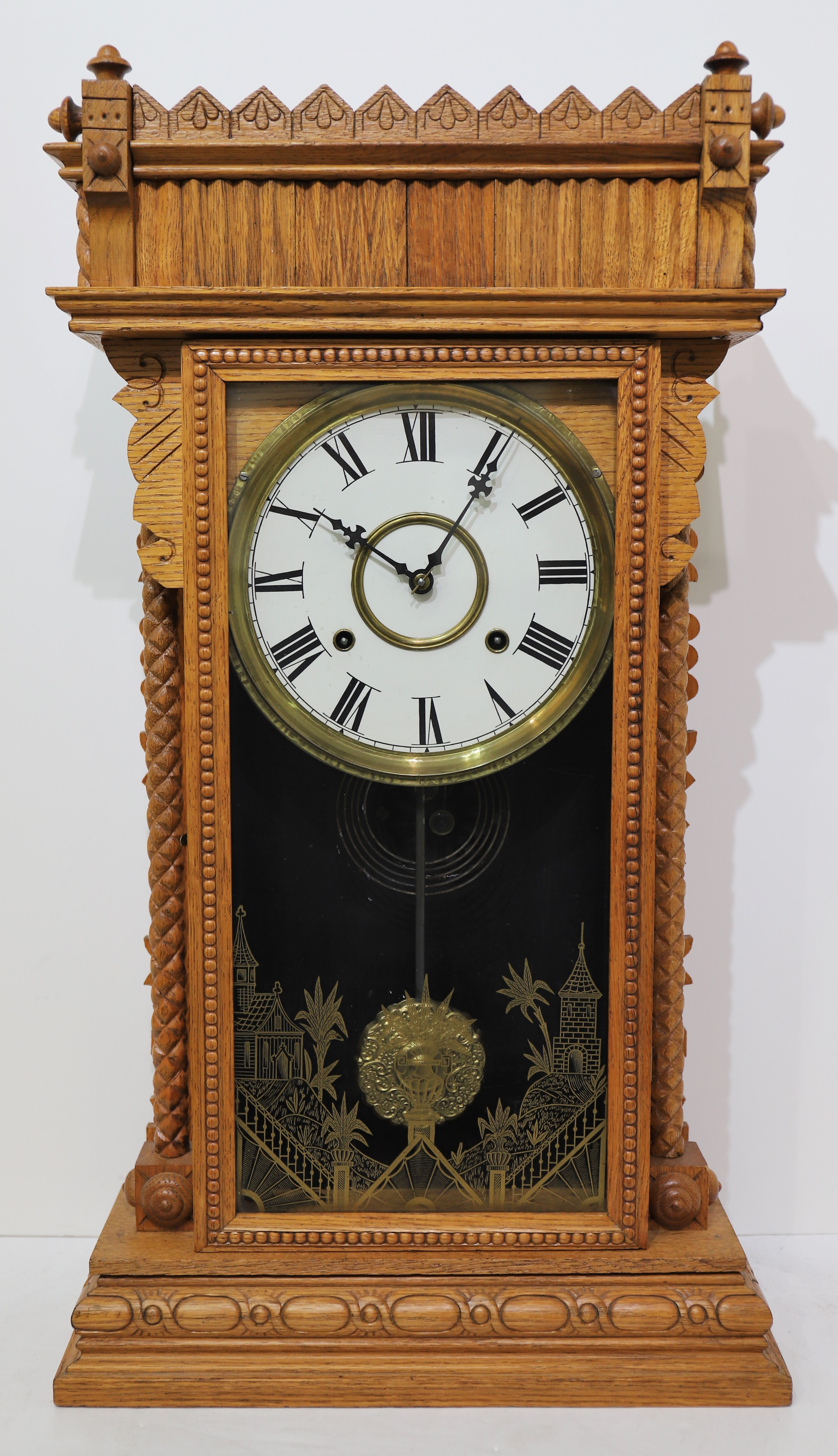 27-inch oak case is as clean as a whistle; all the carvings and parts are present and look original. The door glass is old with