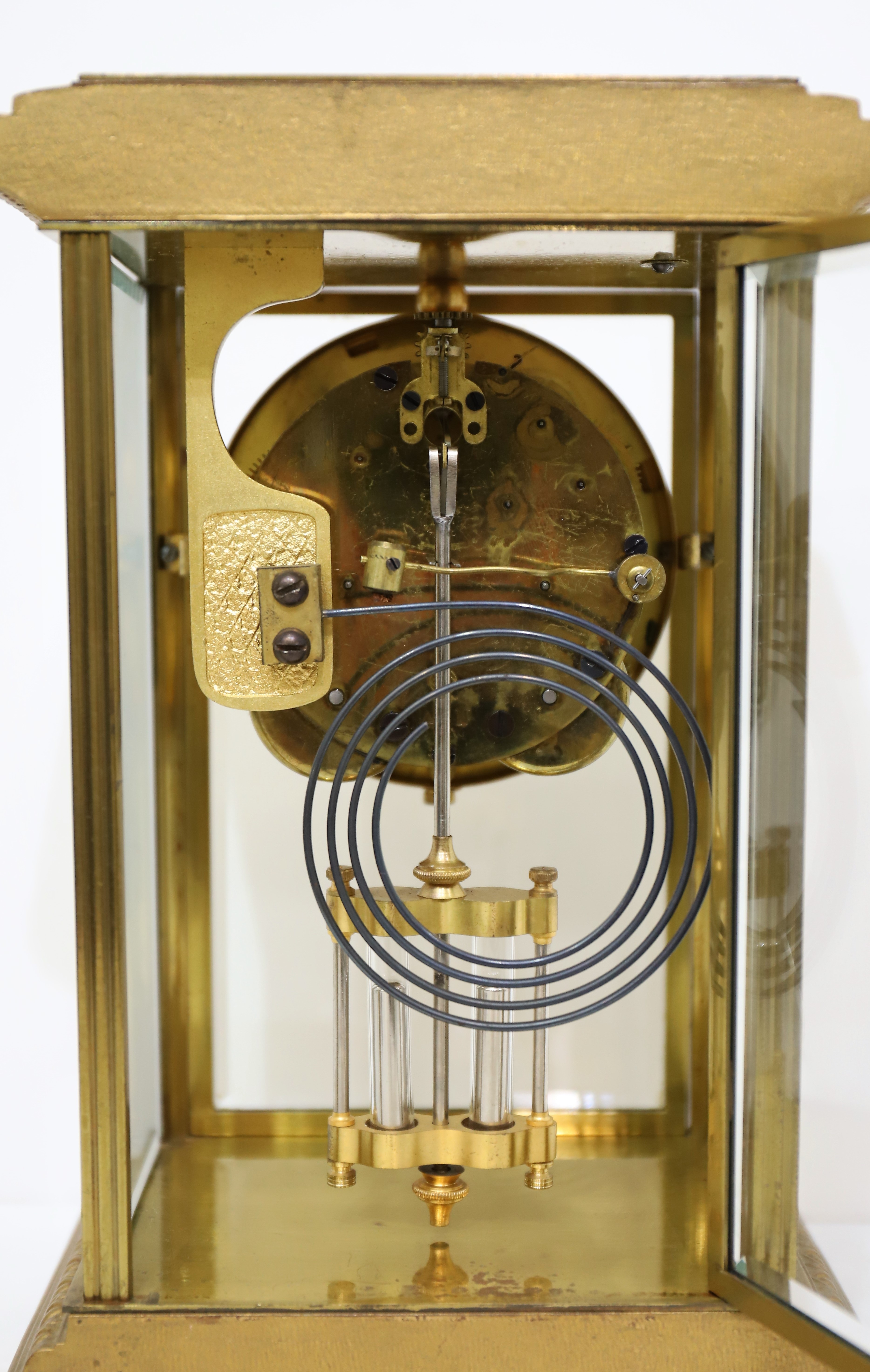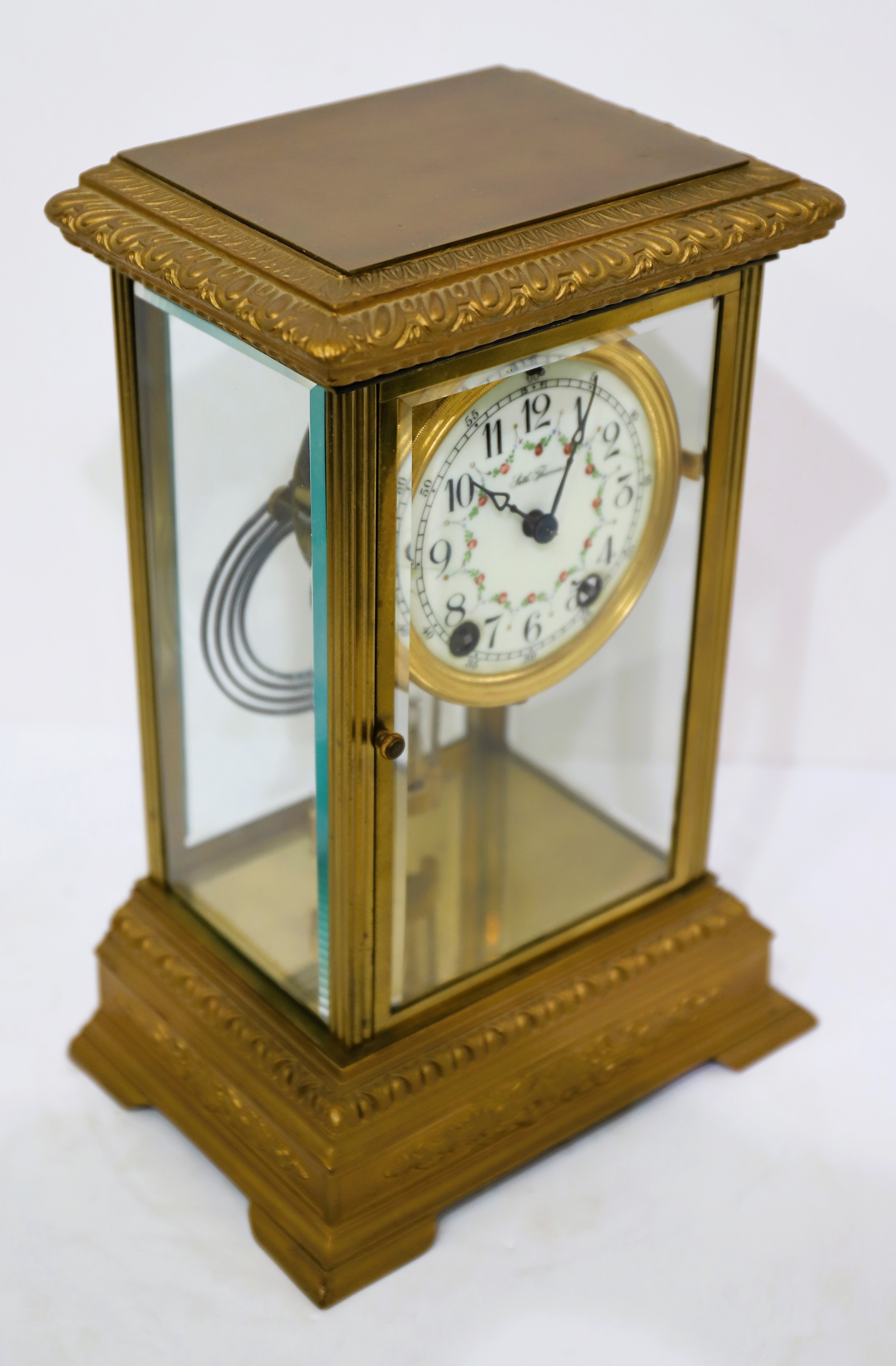 Seth Thomas Clock Co. “Empire No. 18” crystal regulator, ca. 1913. A 12-inch metal case with a dull gold finish and four good beveled glasses. The decorated, signed porcelain dial has some damage