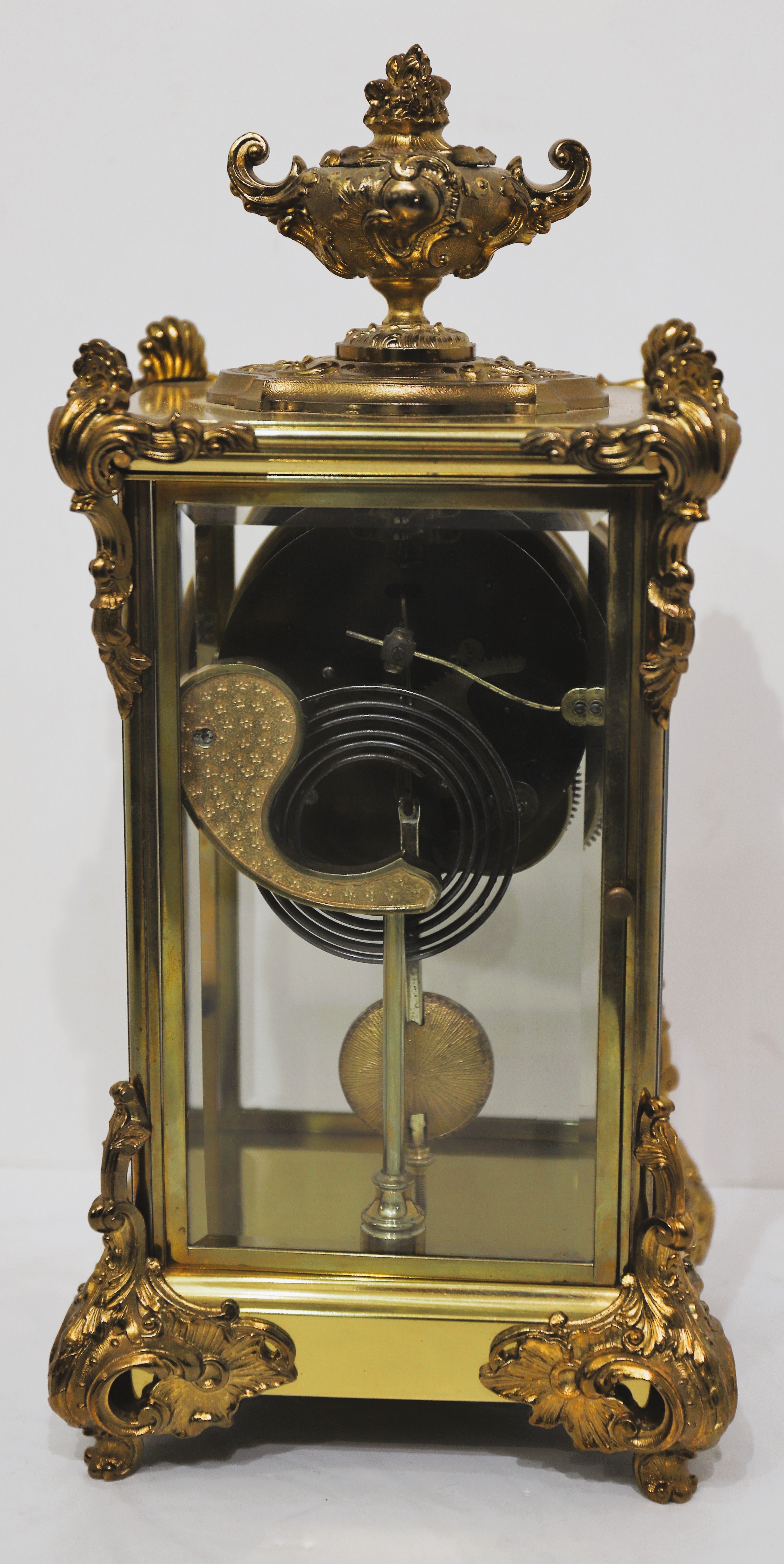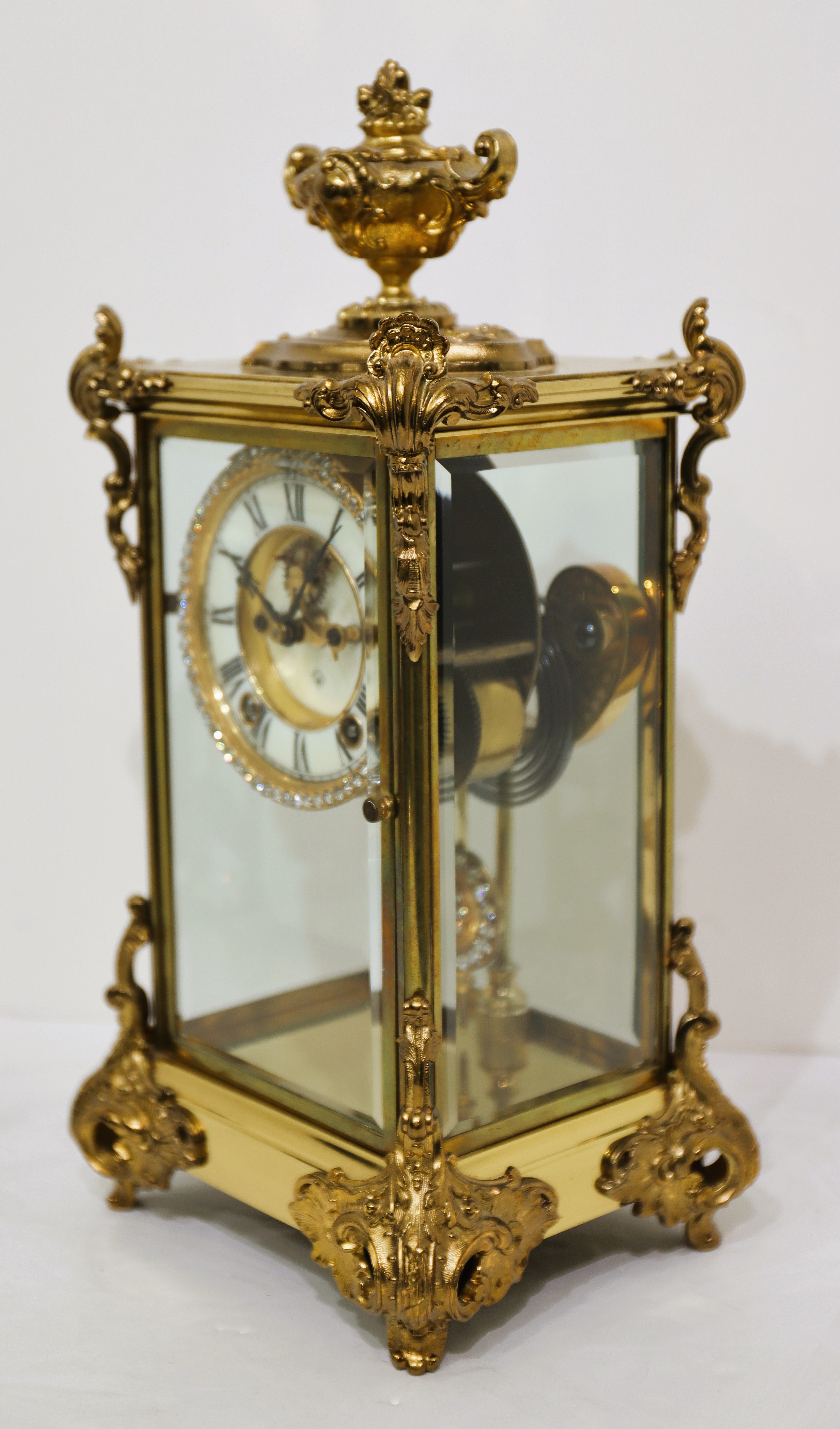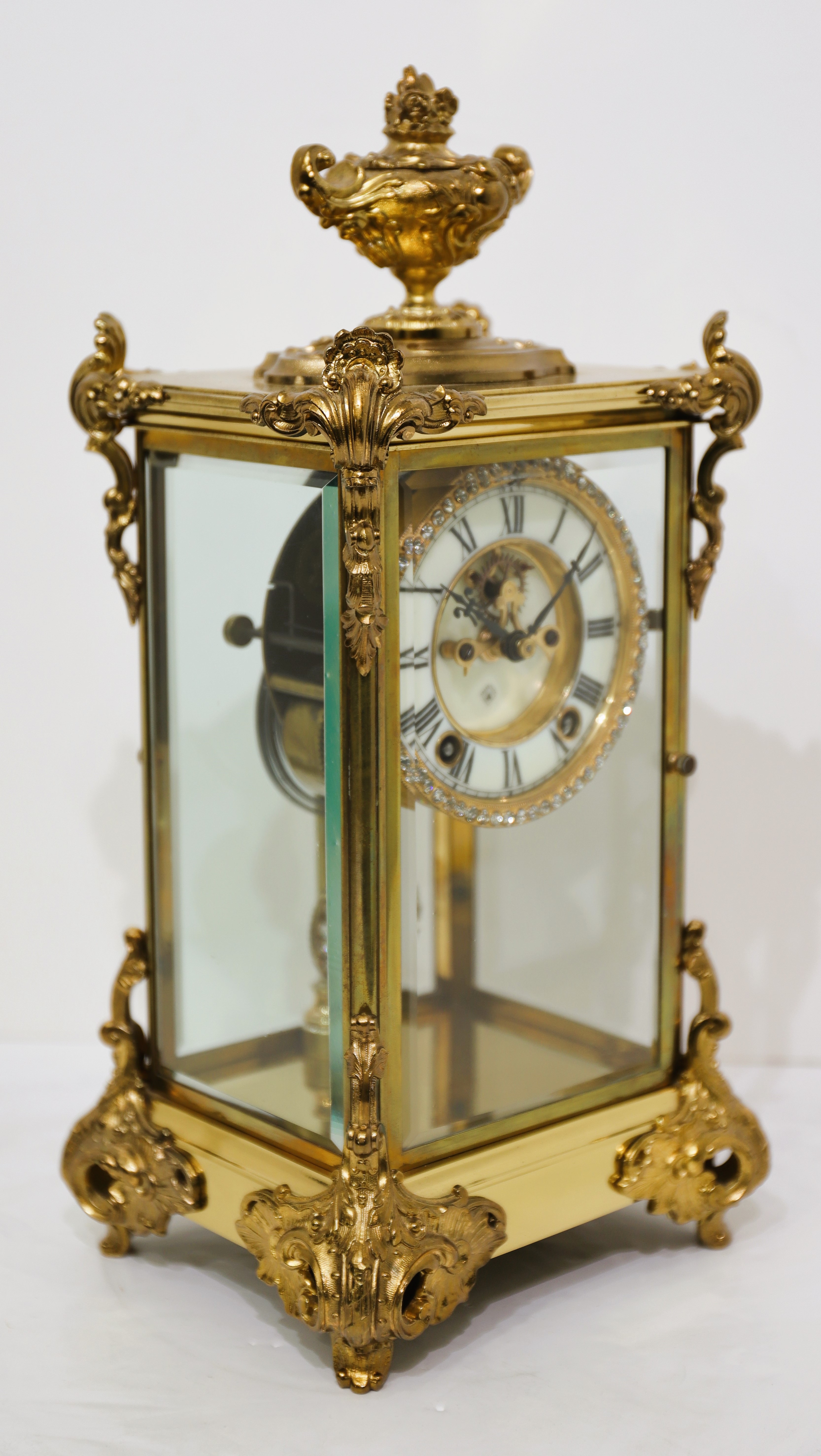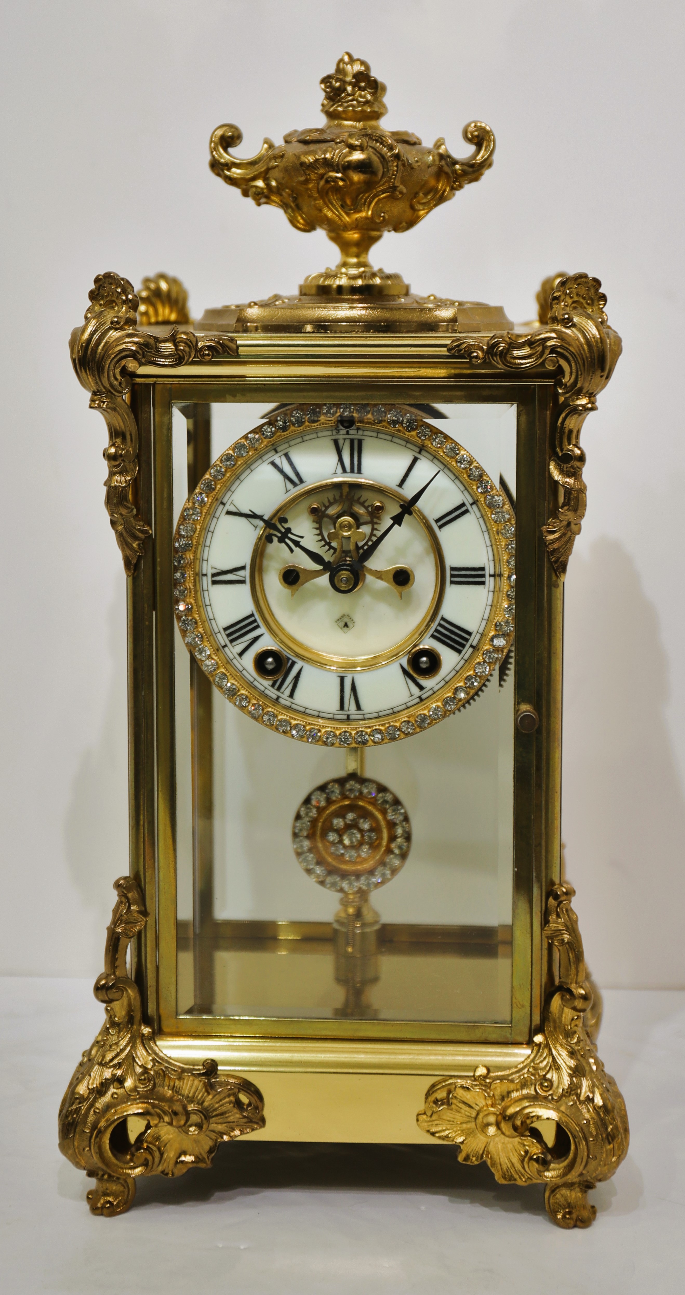 crystal regulator with bright gold ornaments on the sides, top, and bottom, and a jeweled sash and pendulum. It stands 15 inches