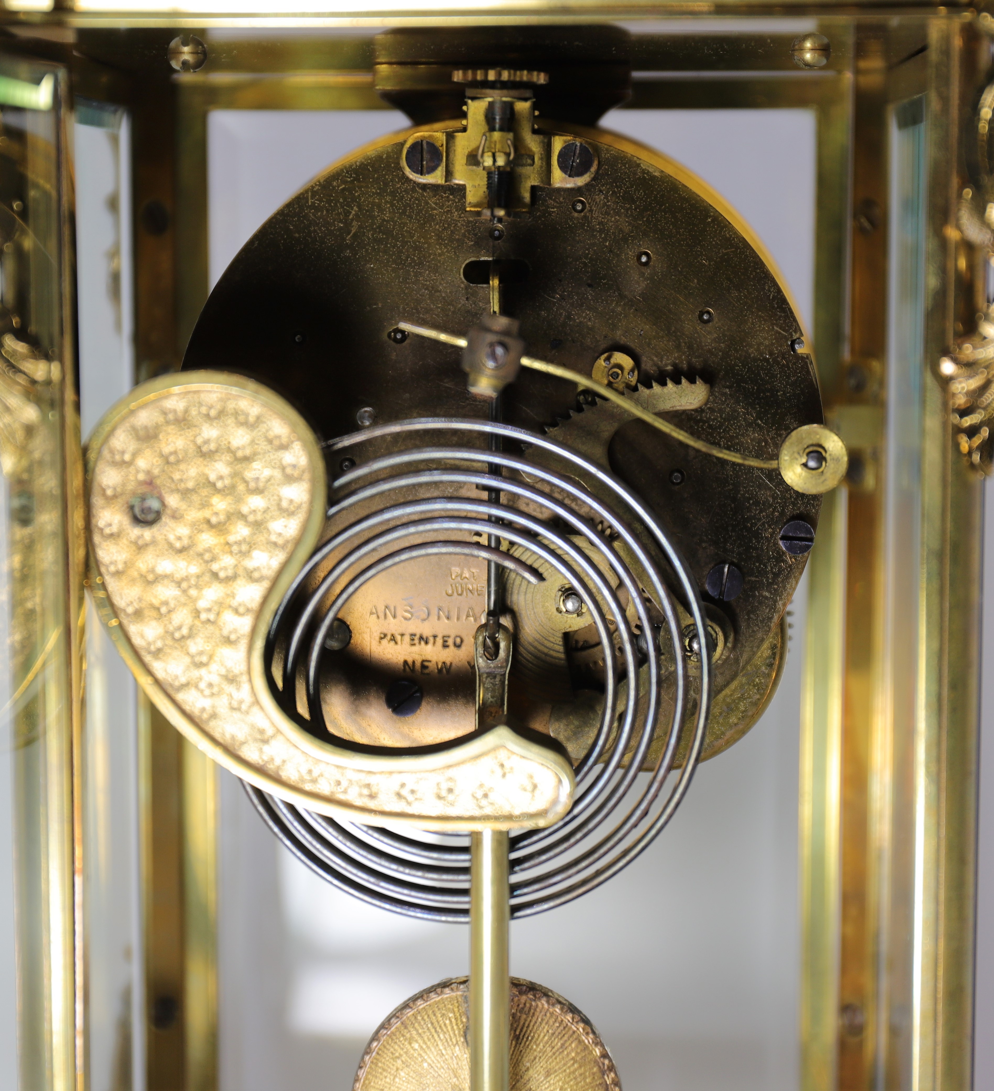 tall with four beveled glasses, a two-part porcelain dial with the Ansonia logo in the middle, proper hands, and a visible escapement
