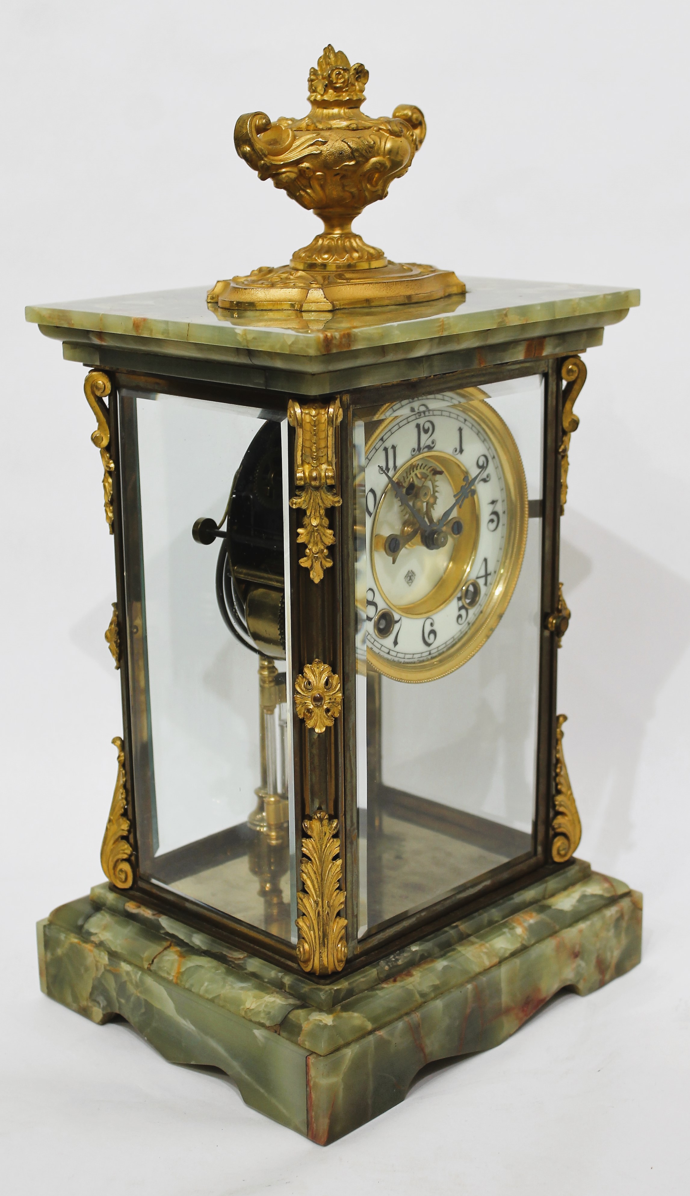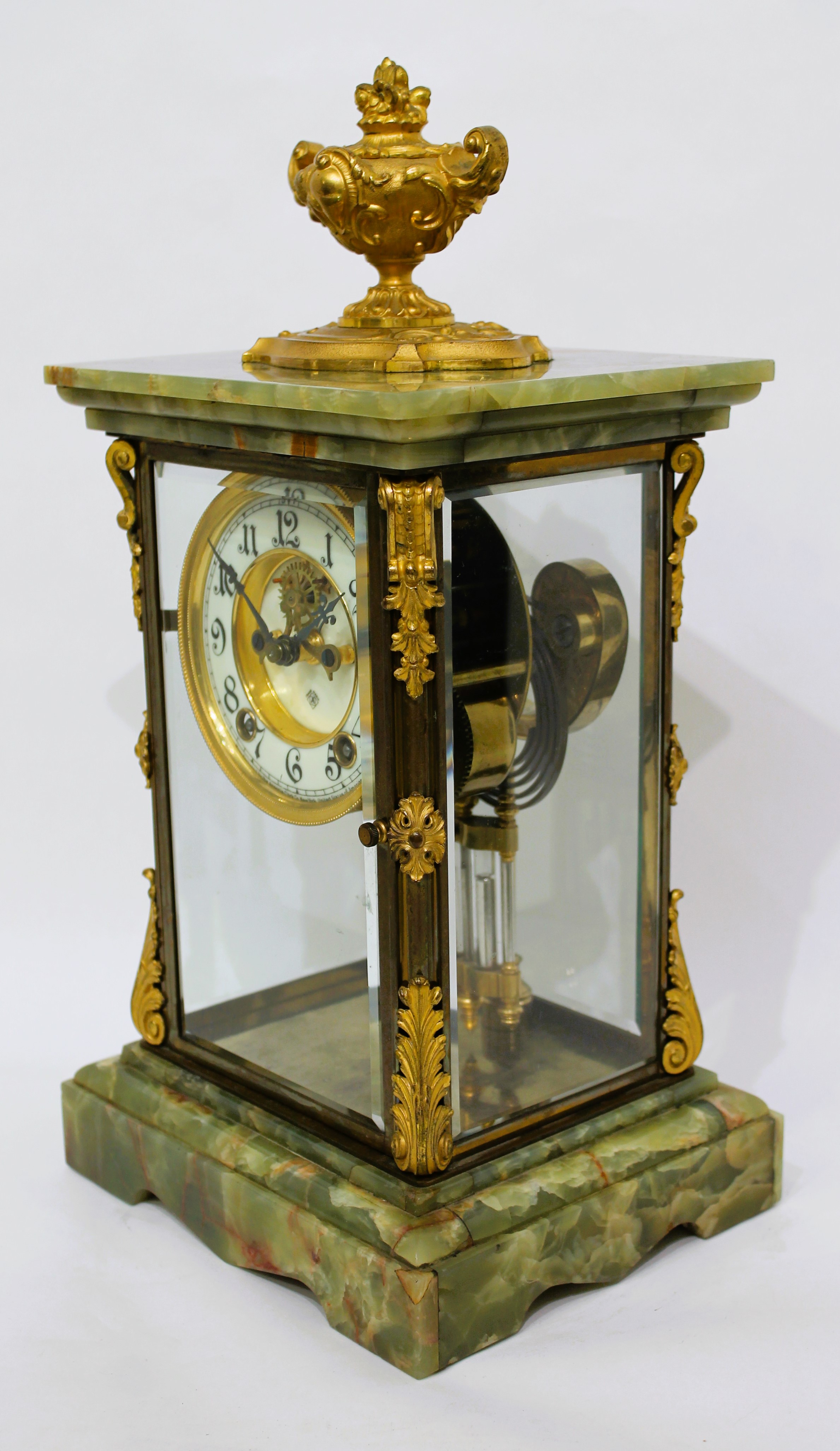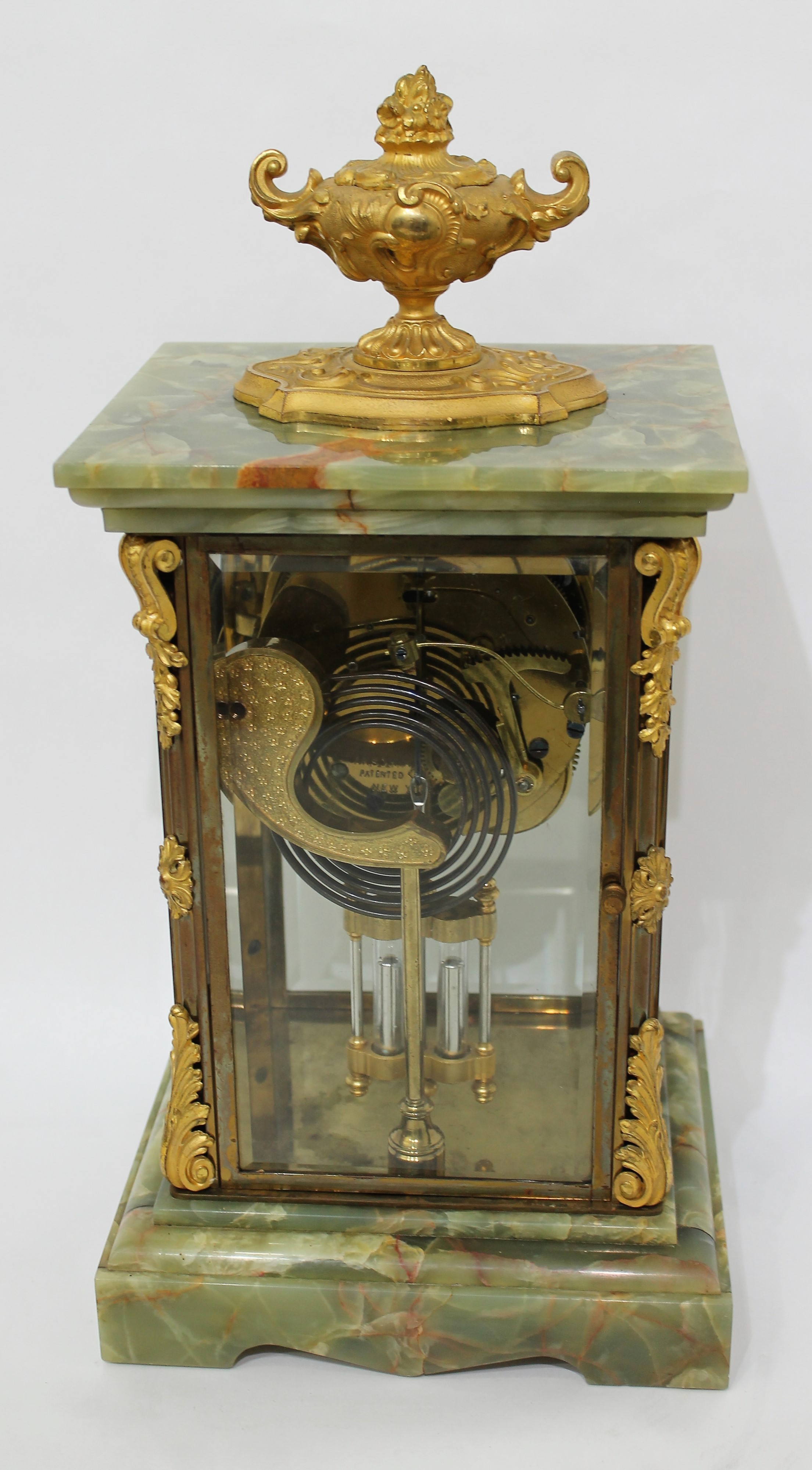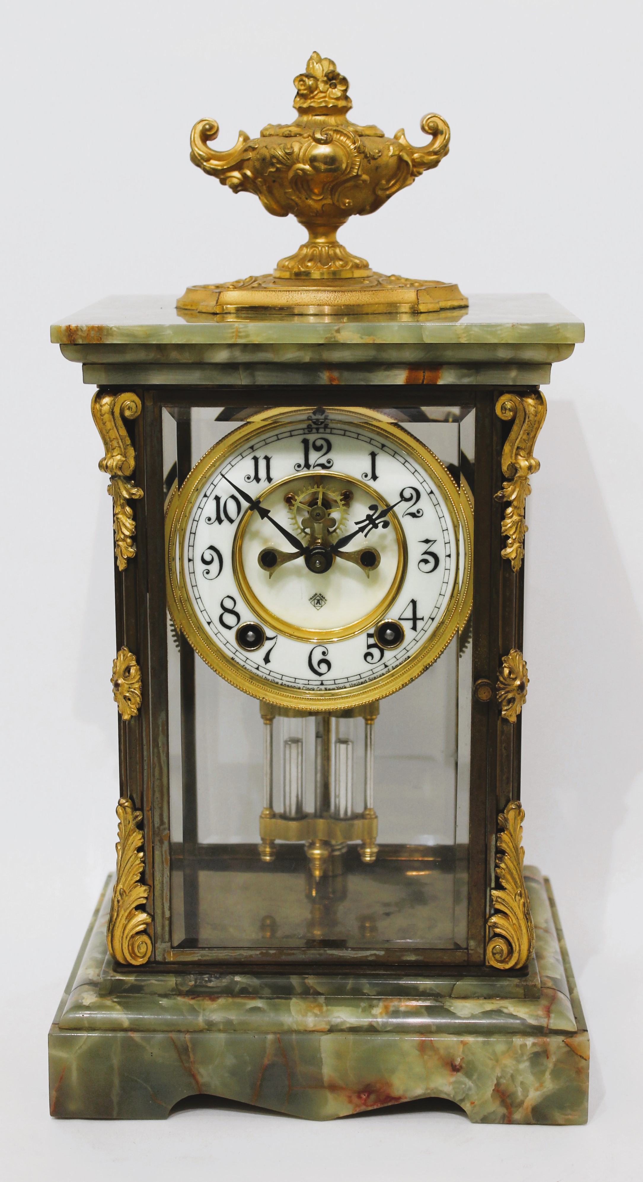 Ansonia Clock Co. “Cosmo” green onyx crystal regulator, ca. 1914. A 15-inch-tall crystal regulator with a green onyx top and base. There are four good, beveled glasses and a brightly gilded
