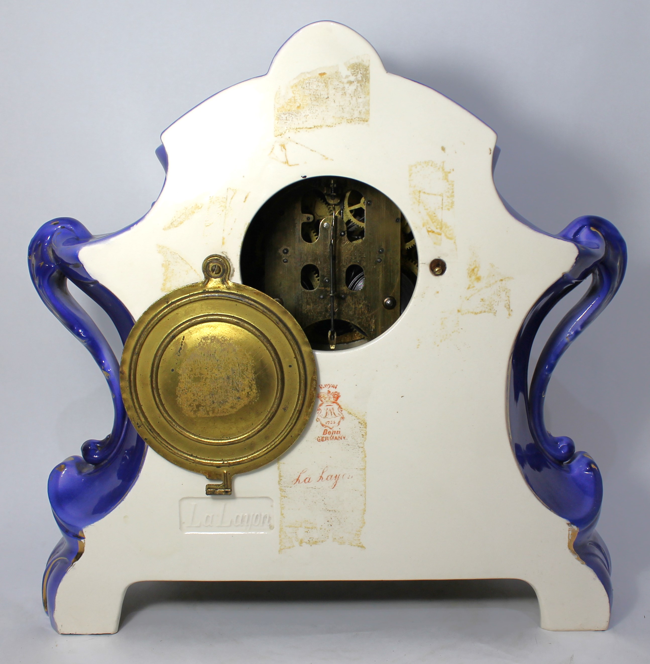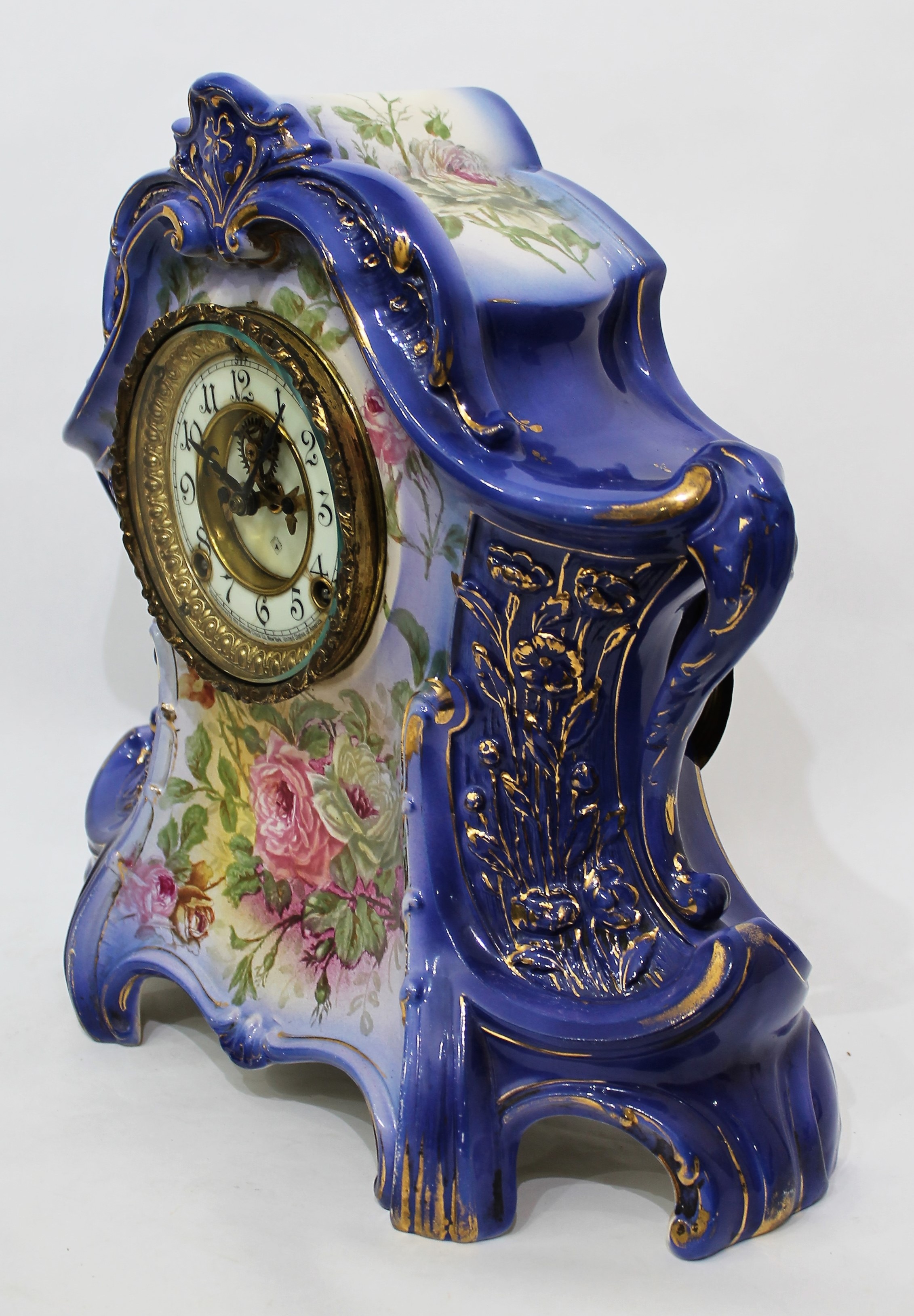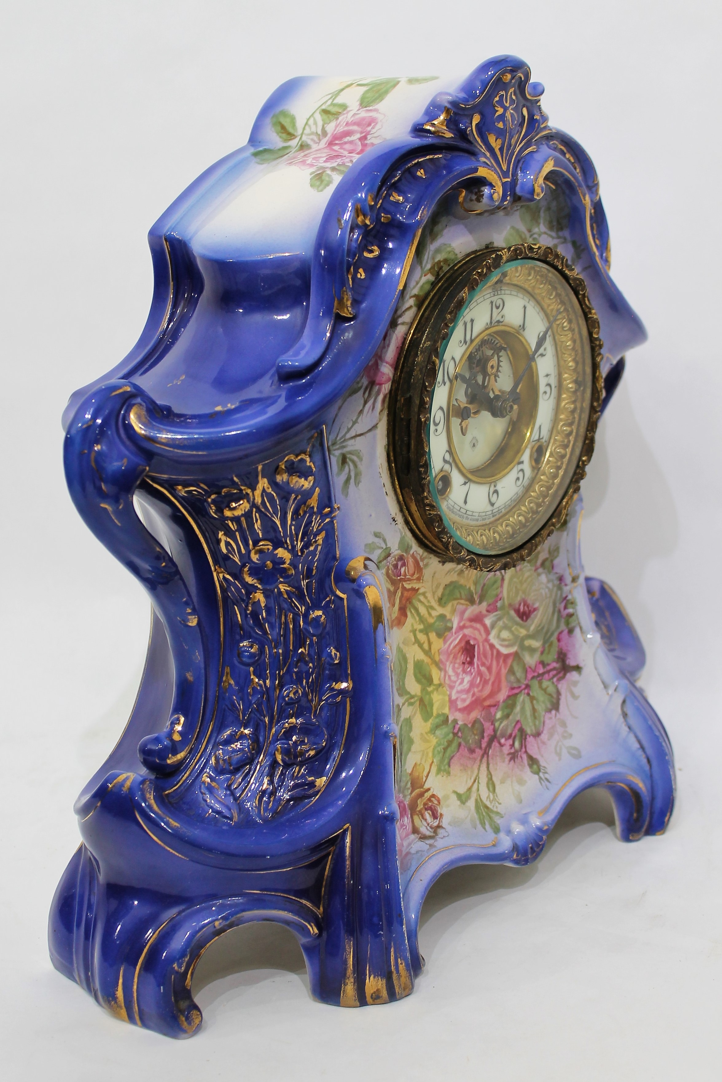 porcelain case in New Art Blue with modest loss of gilding. There are hand-painted roses on the front below the dial and on