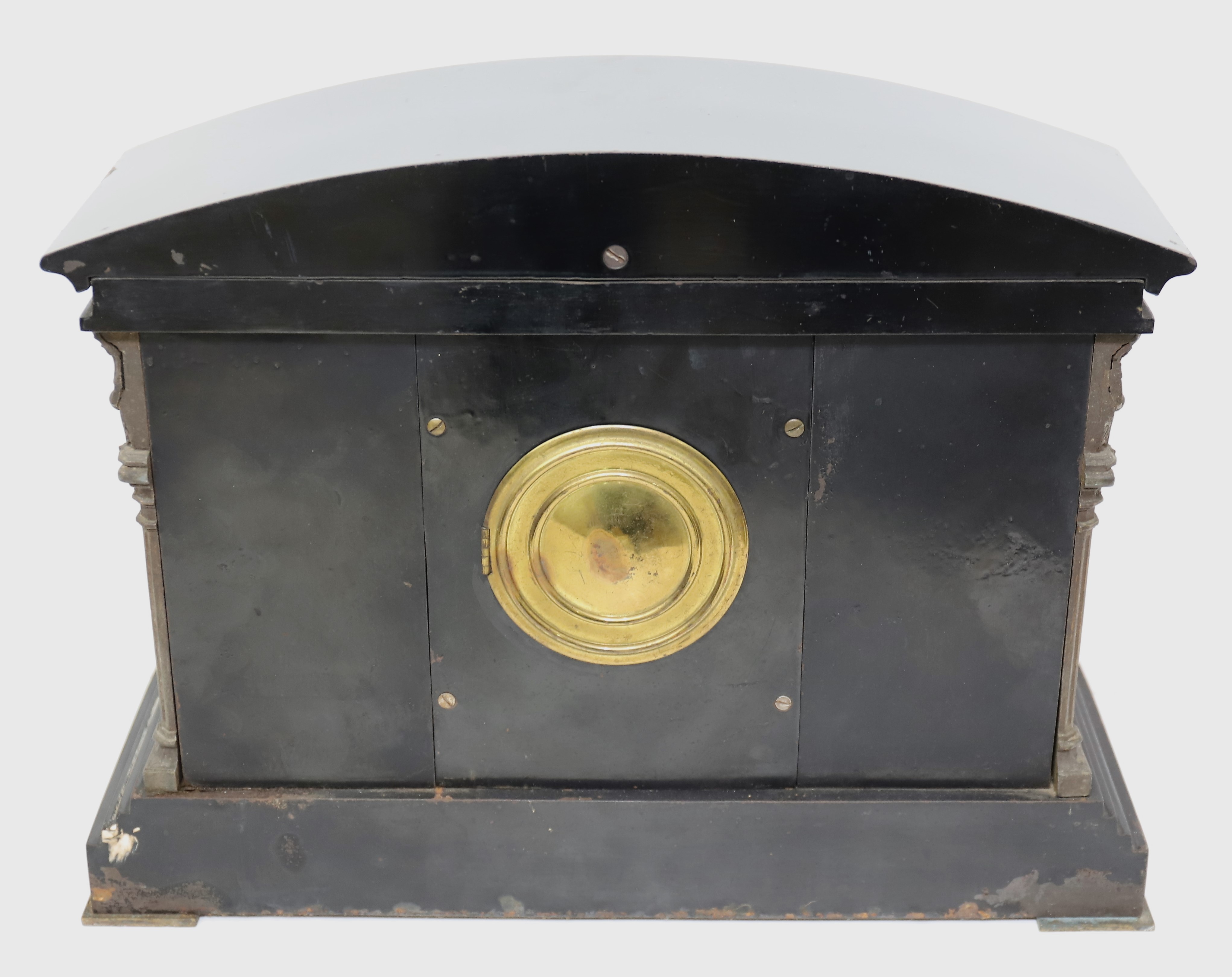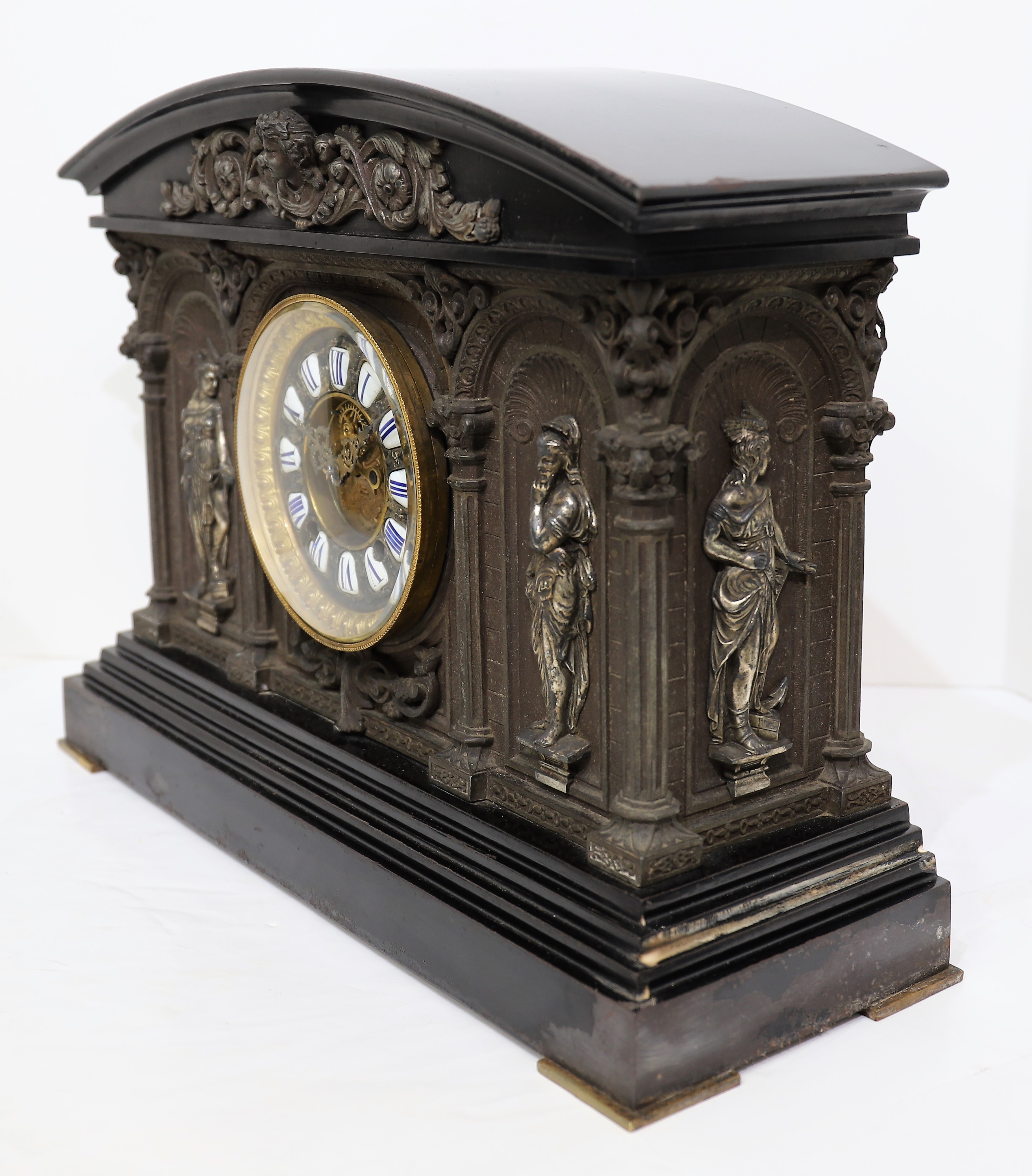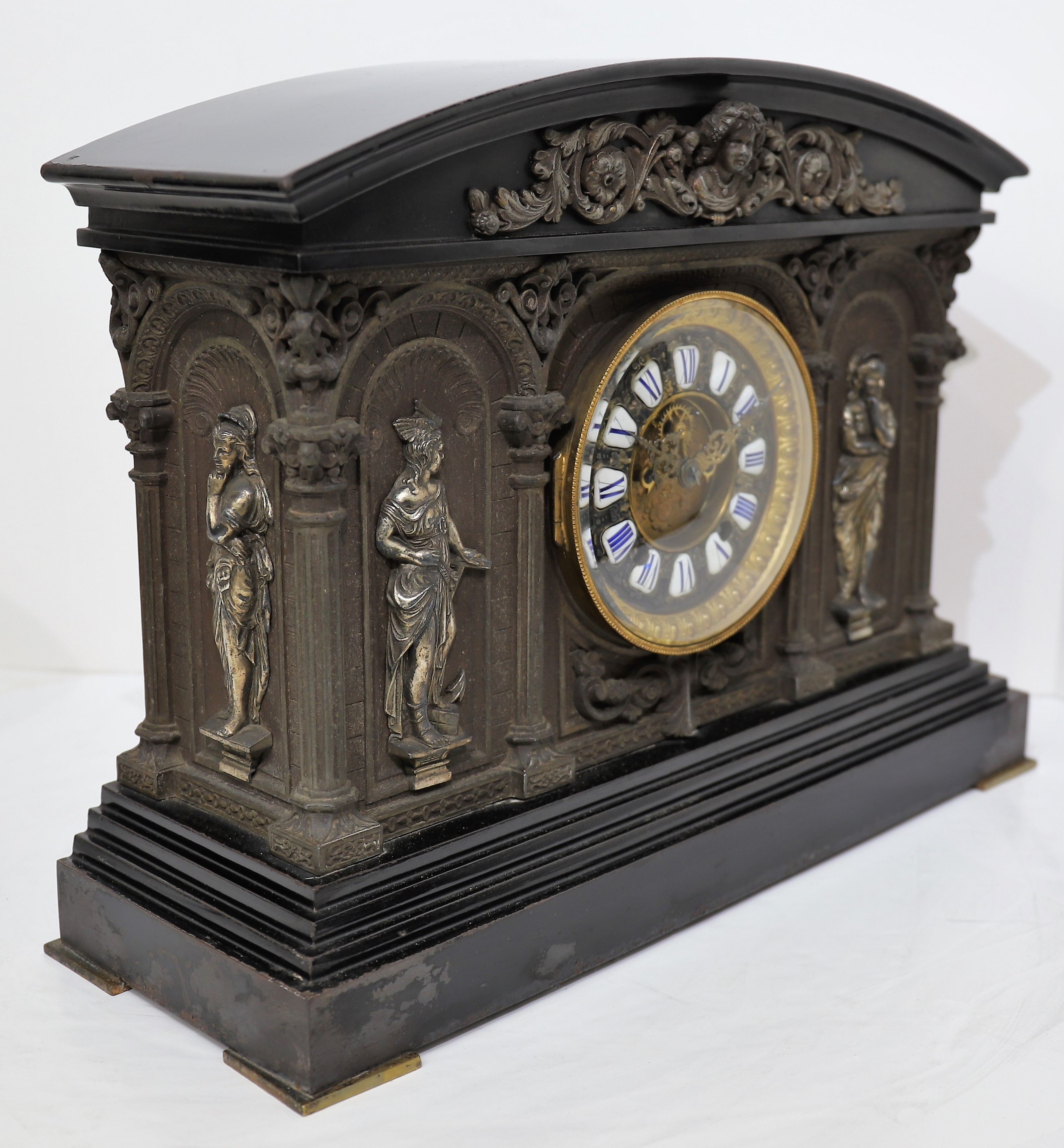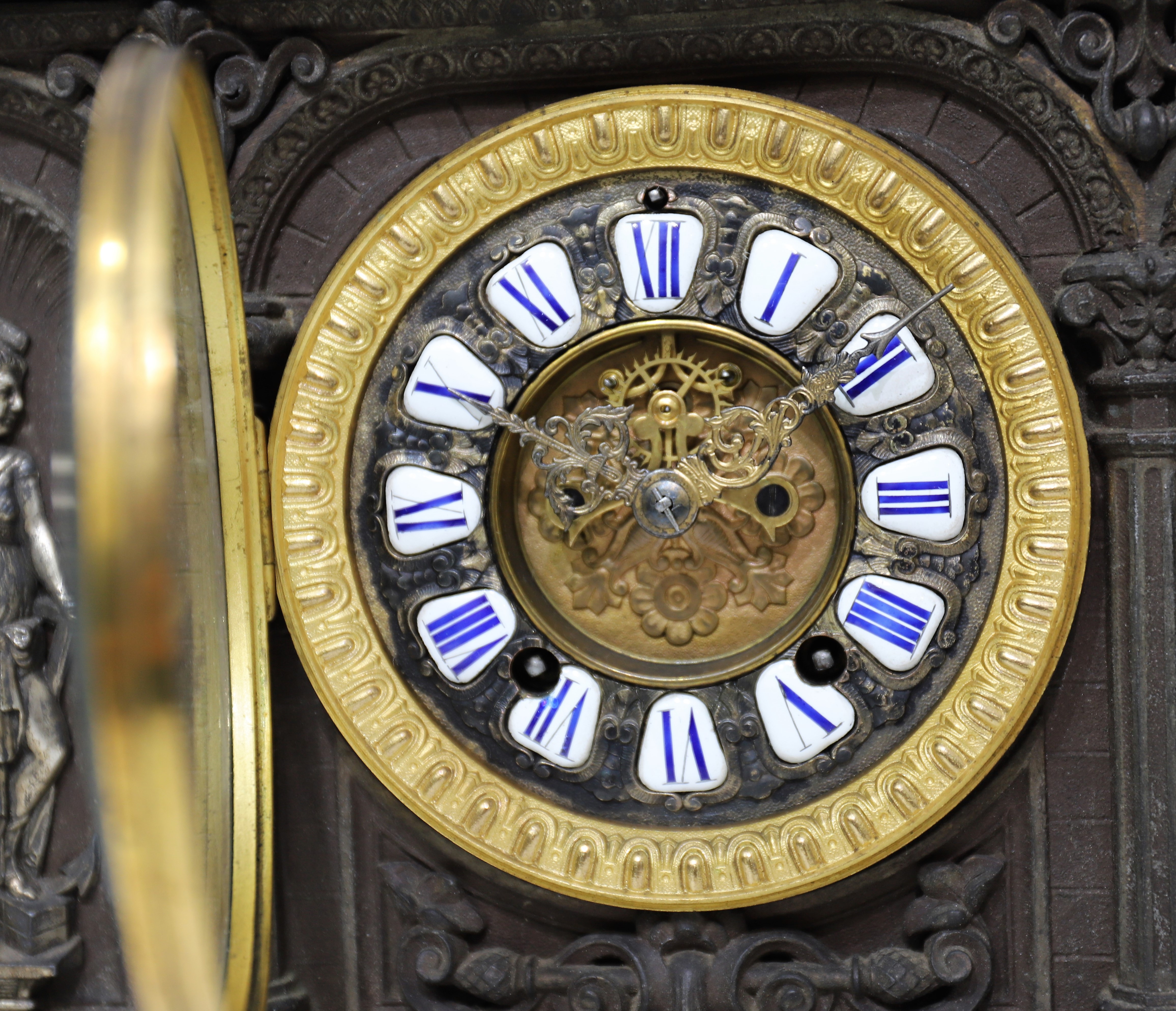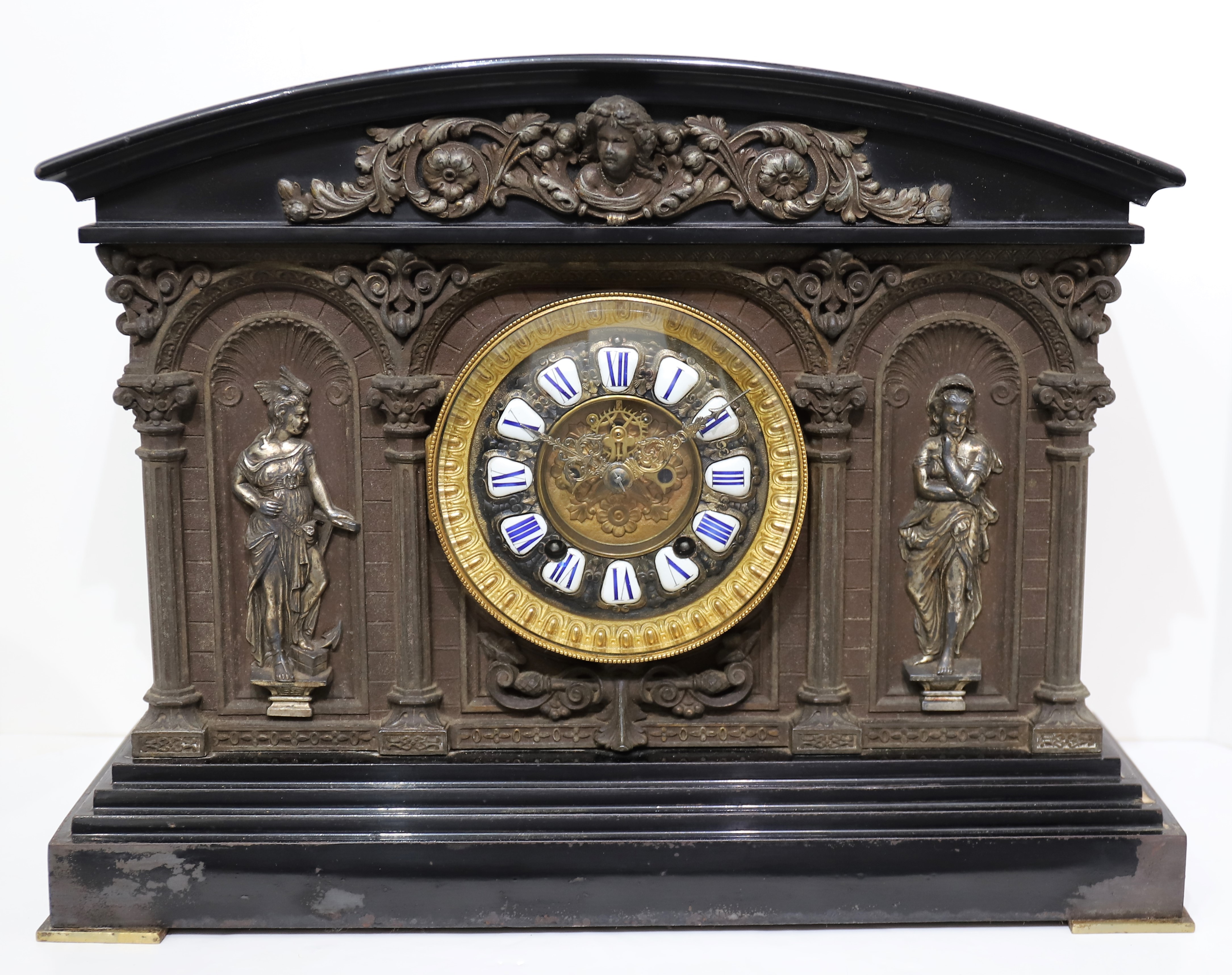 iron case with embossed metal panels holding gilded figures in standing poses. The finish is original. The case is 17.5