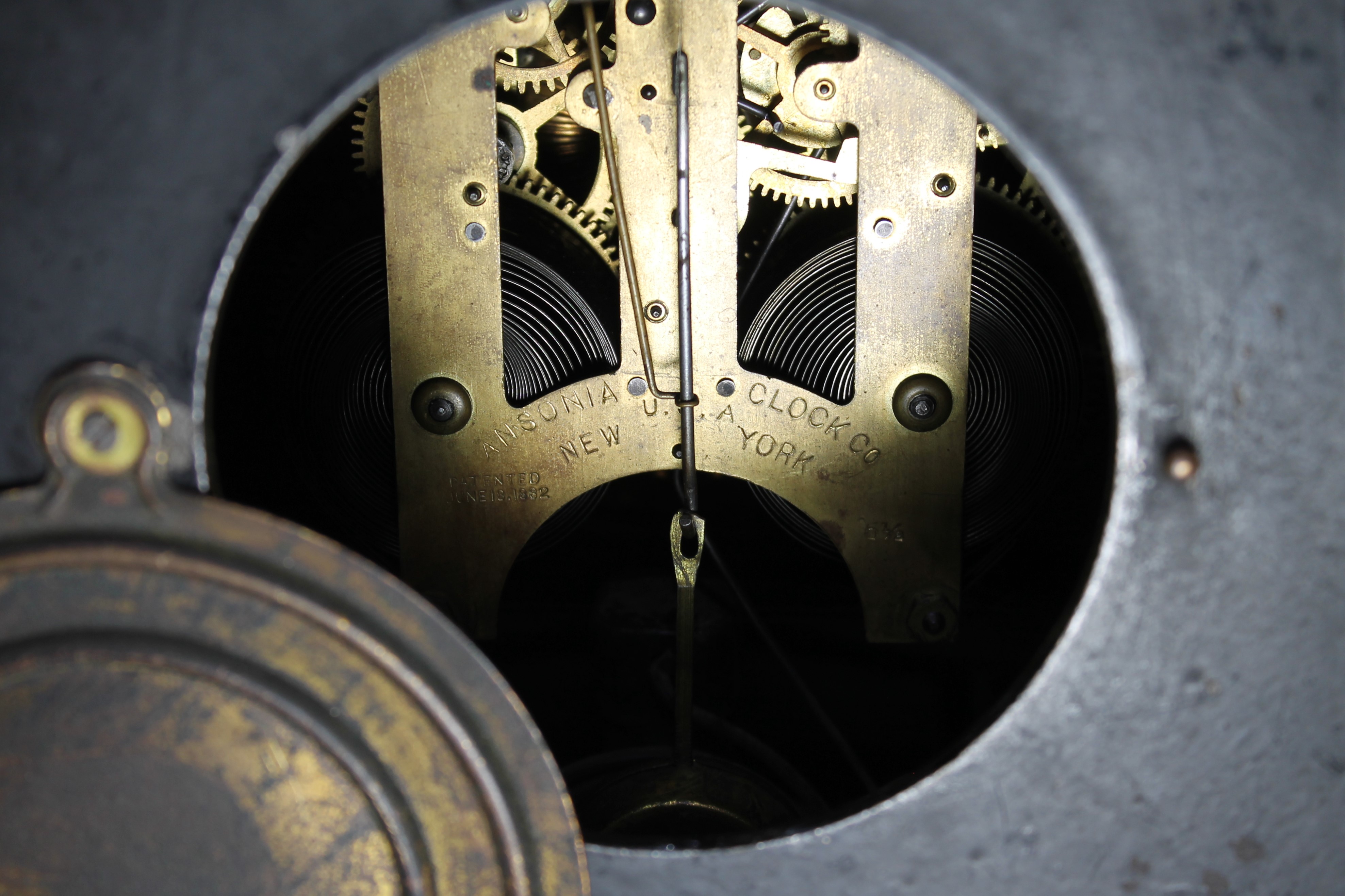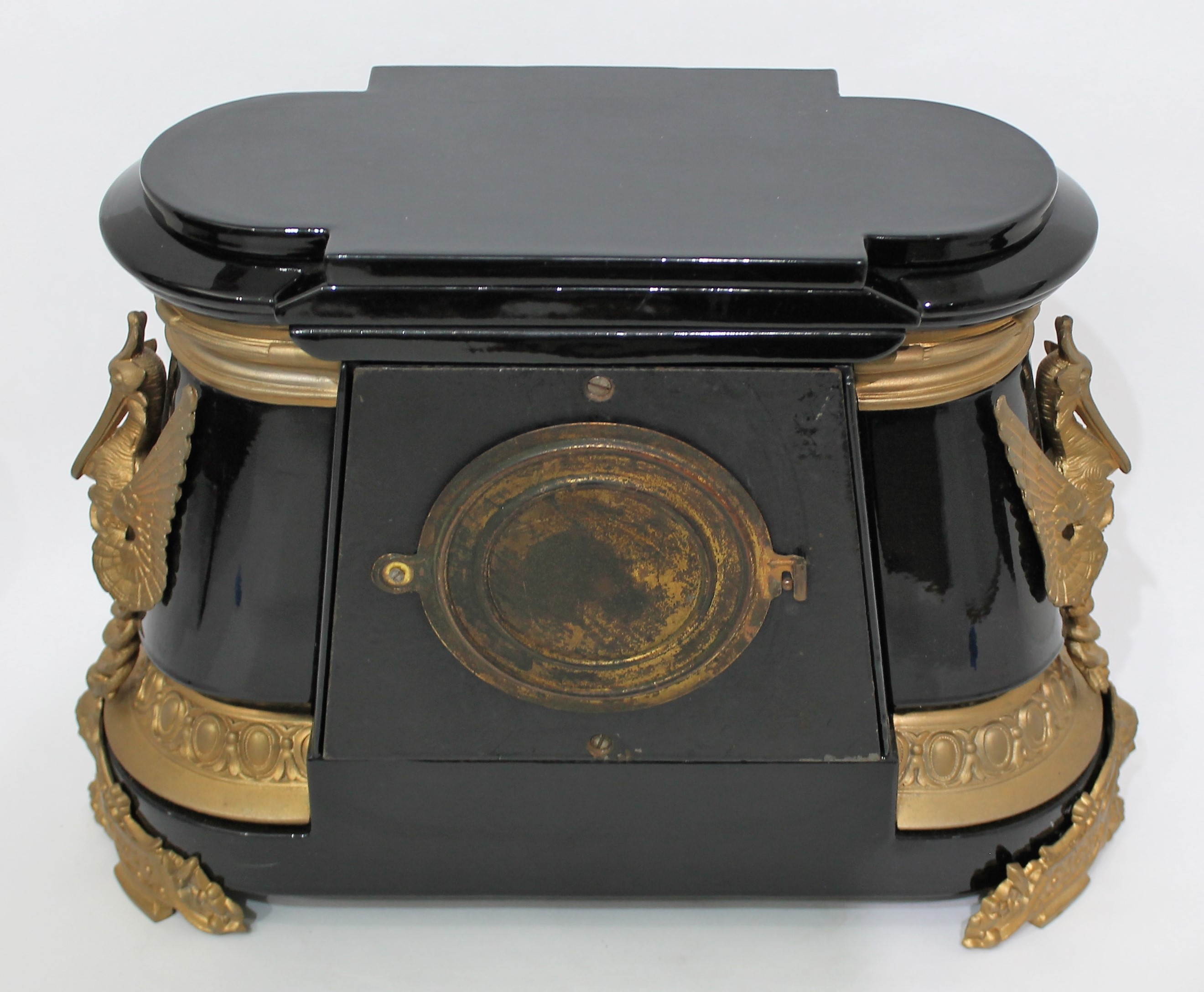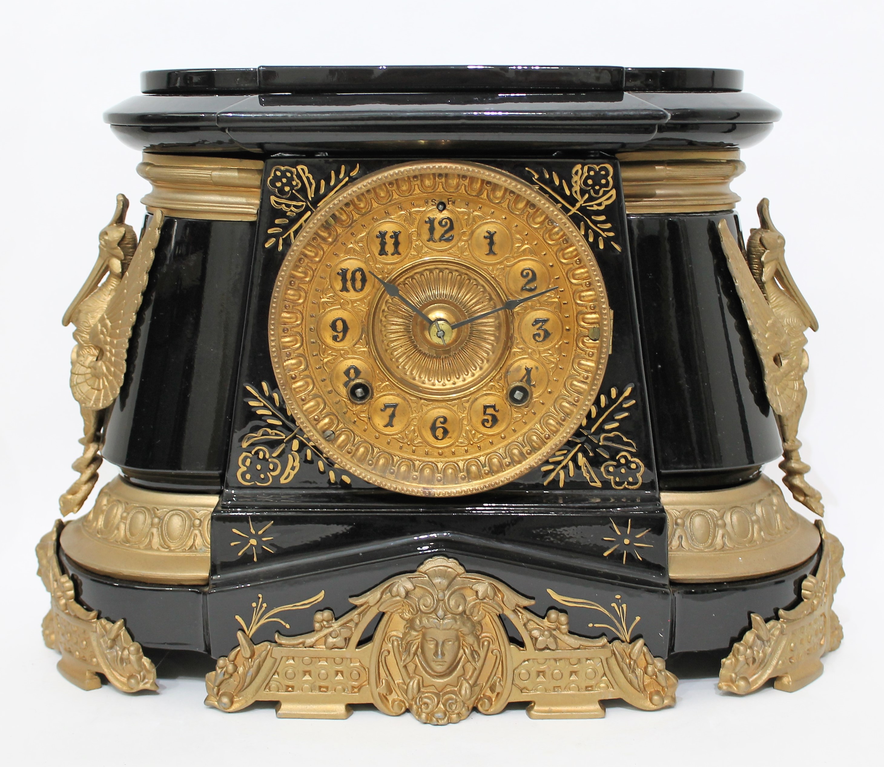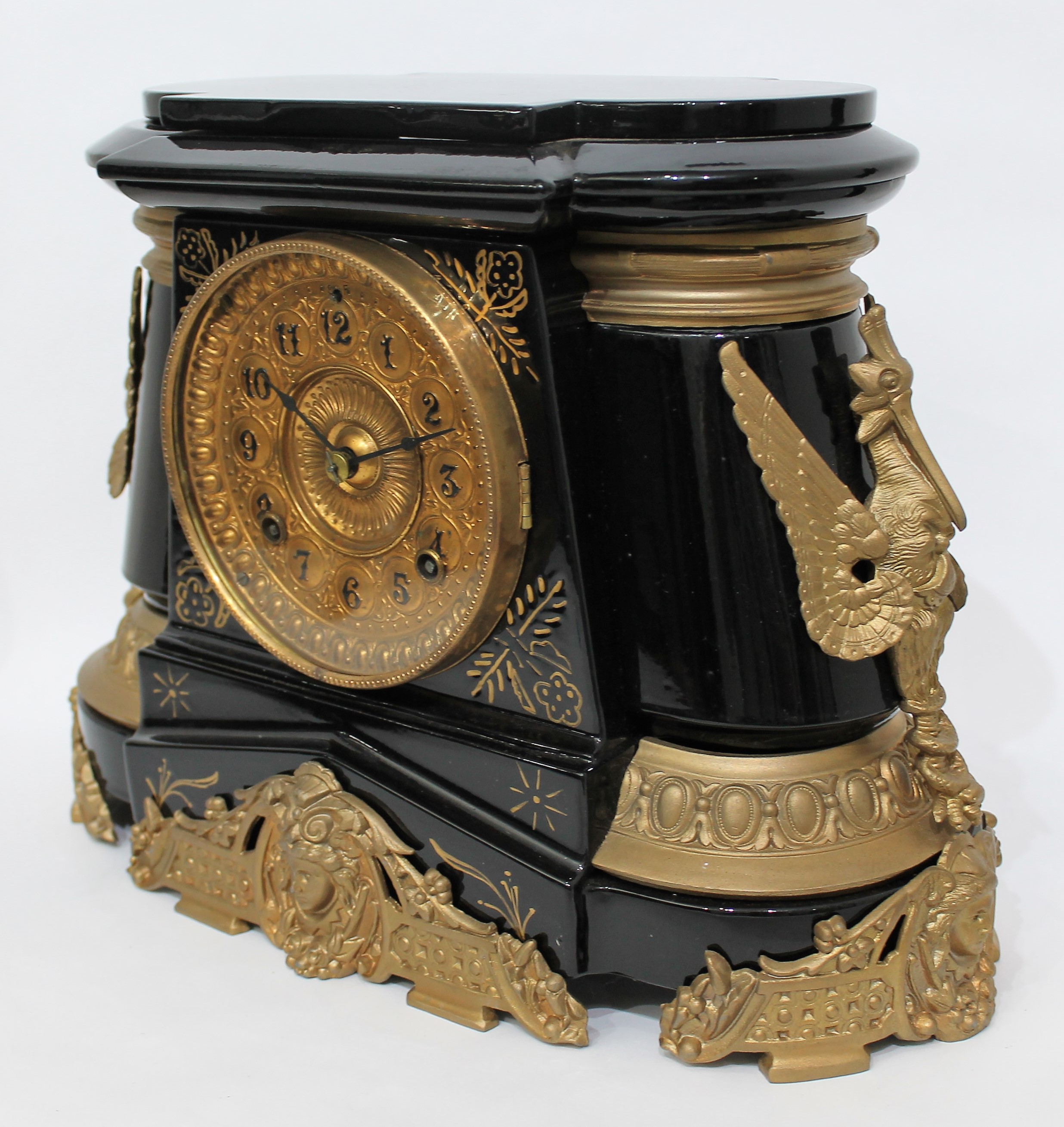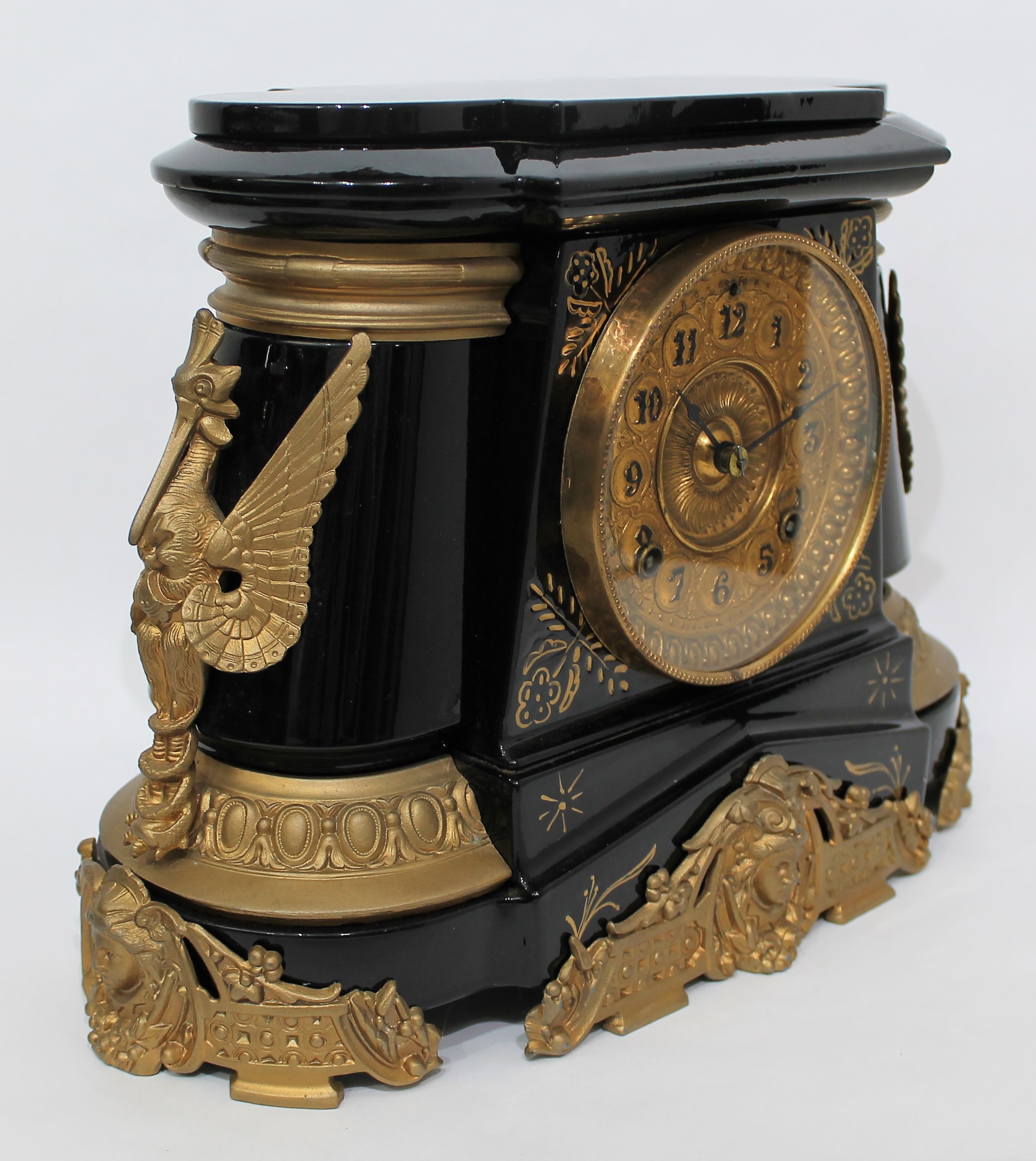 glossy black enamel and the ornaments with antique gold; the hands are replacements. The Ansonia 8-day, time and half-hour strike