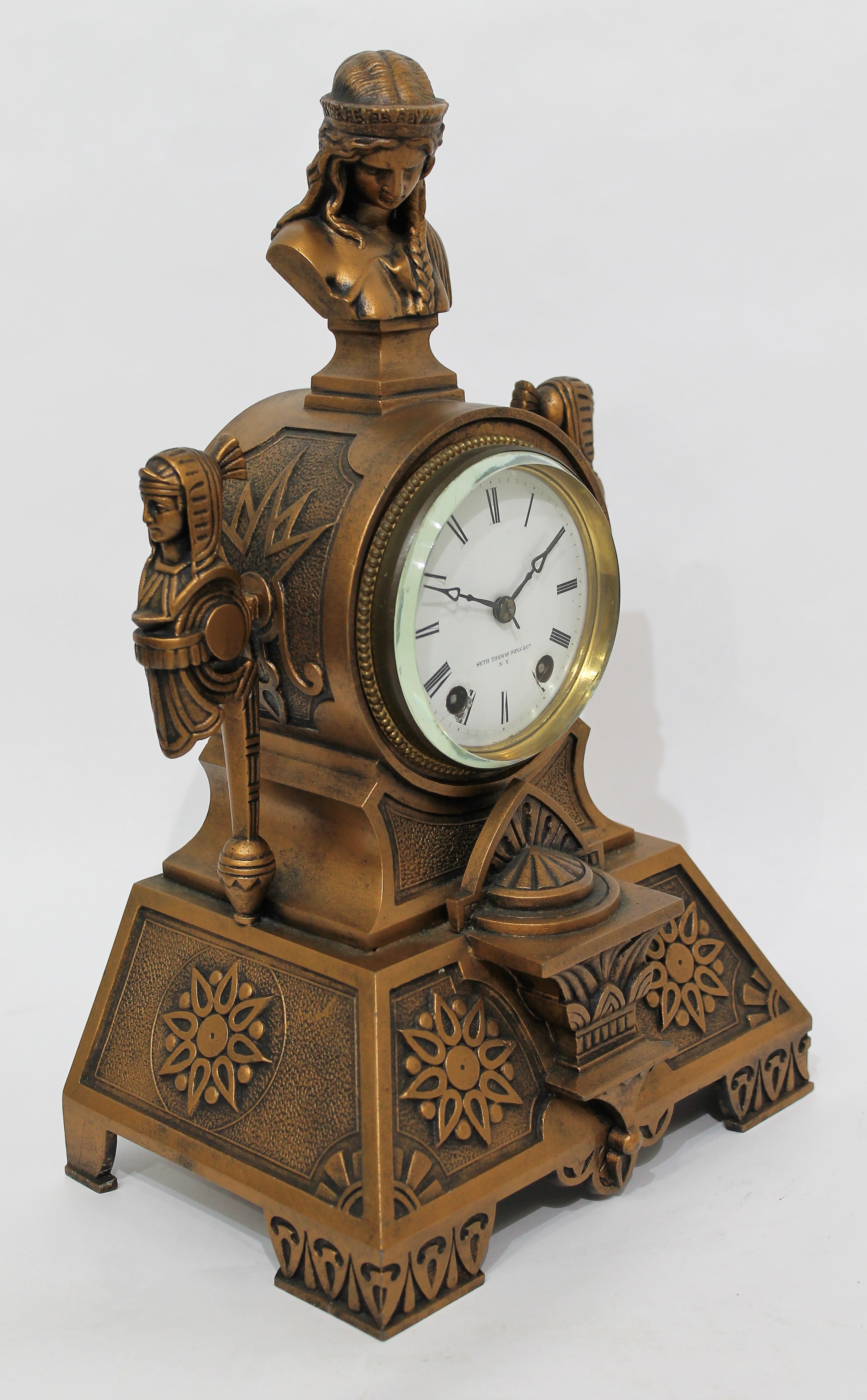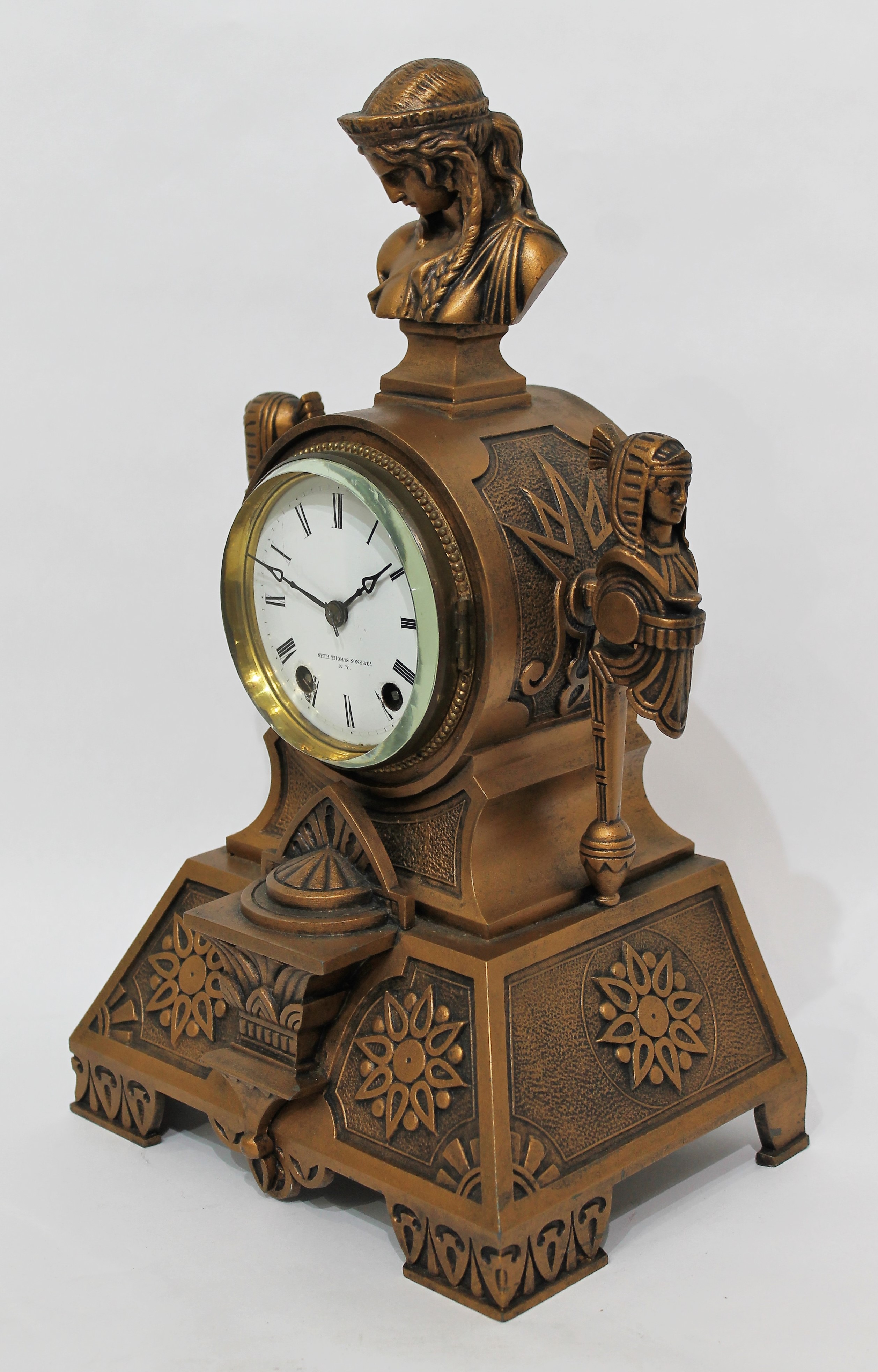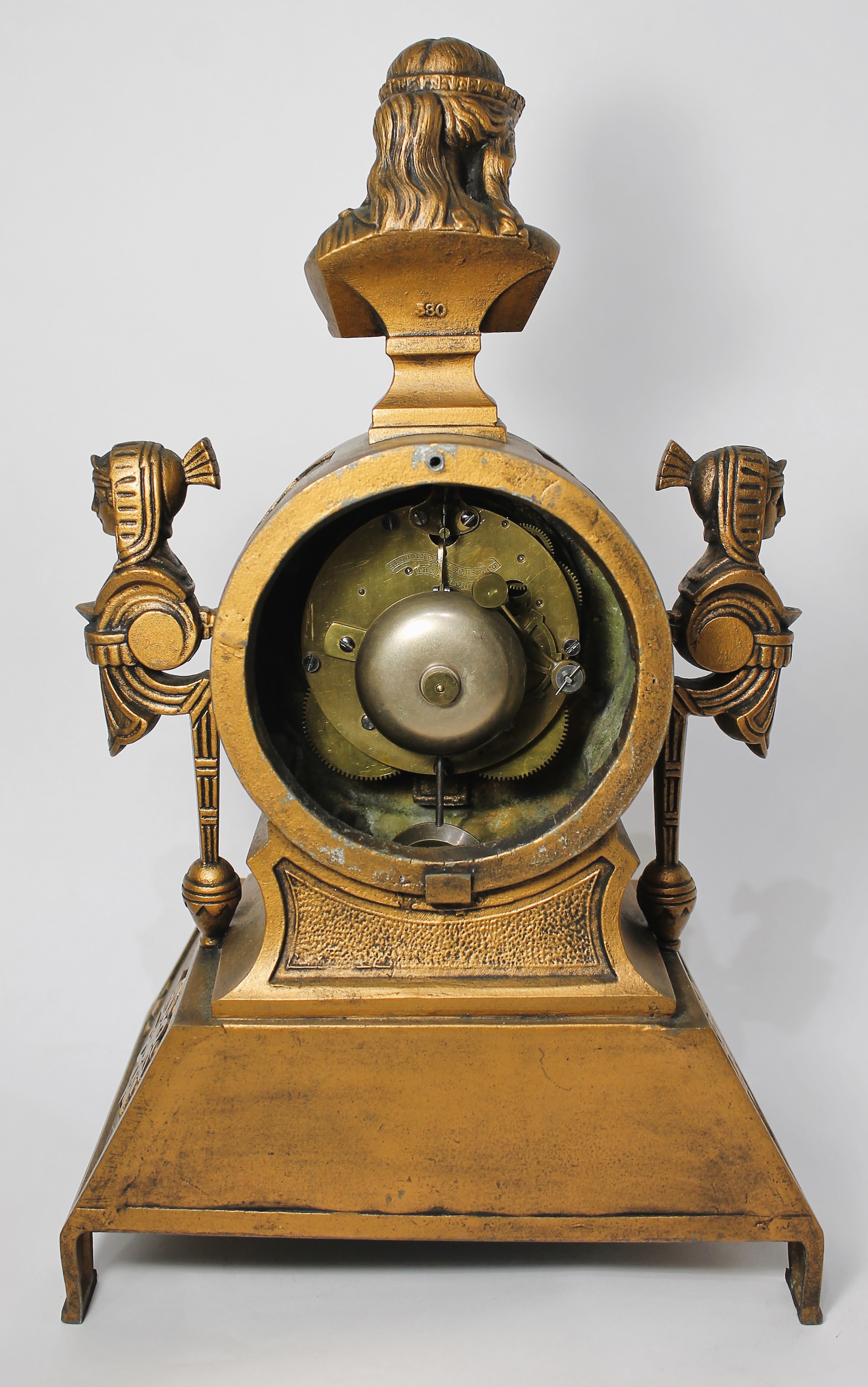 was the intent. It is finished in French Bronze, 15 inches tall with a well-preserved finish. The porcelain dial is behind
