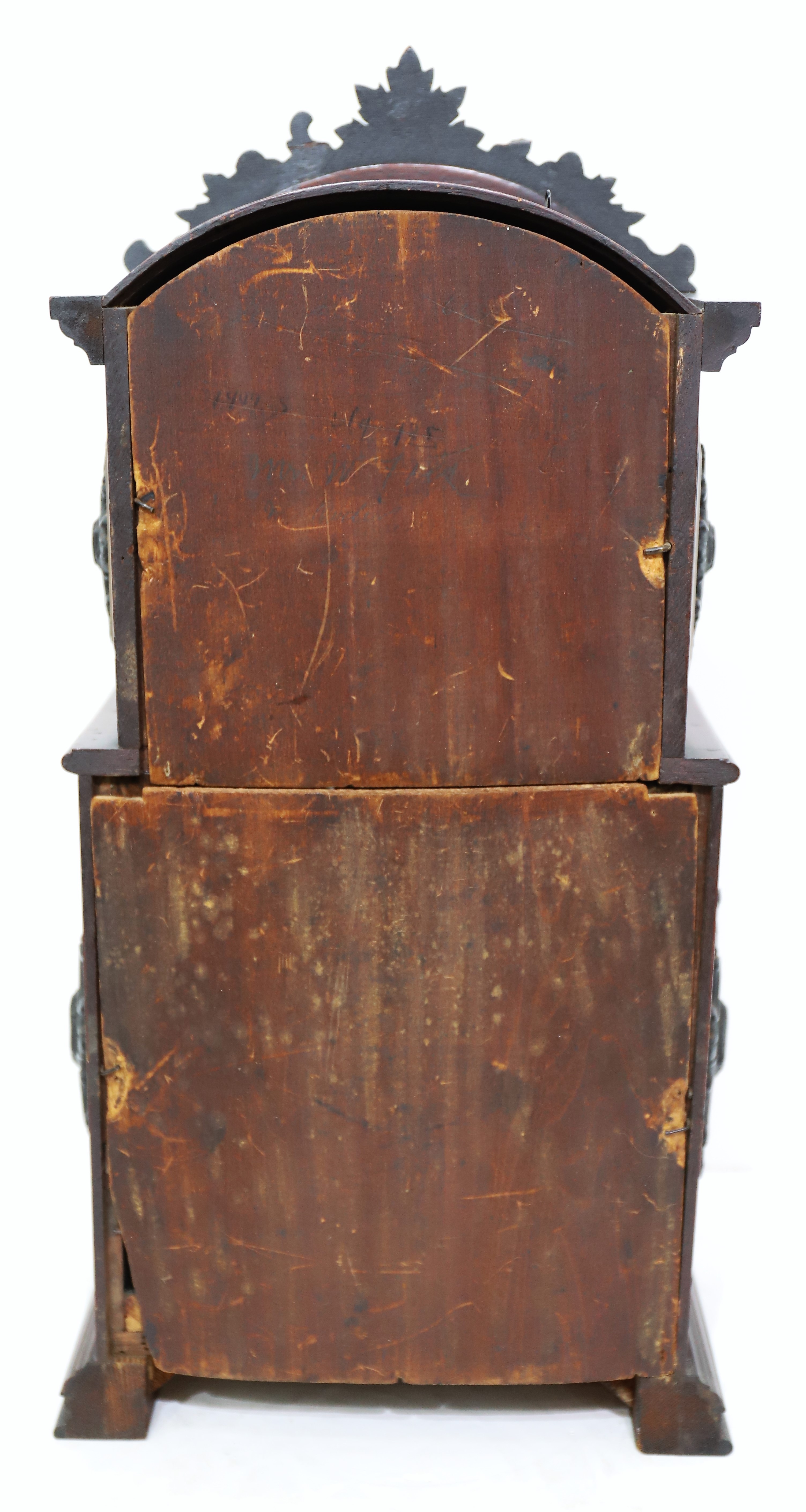 and the trim pieces show wear; a tip on the crest is missing. The dial glass is modern, the two lower glasses are period. The nickel hands on the dials are proper/original. The 8-day, time-and-strike movement is signed Welch and made for the ICCC;