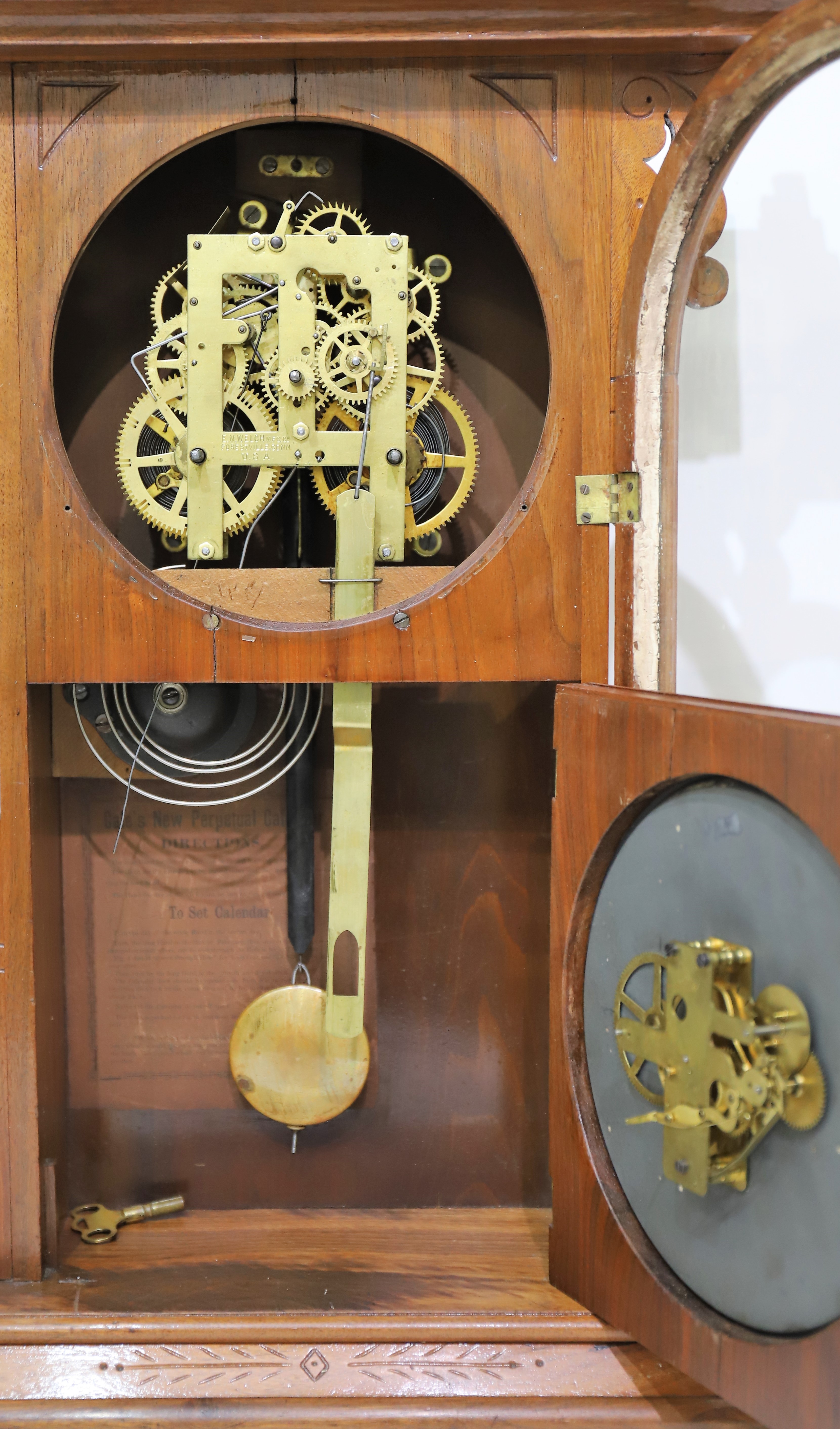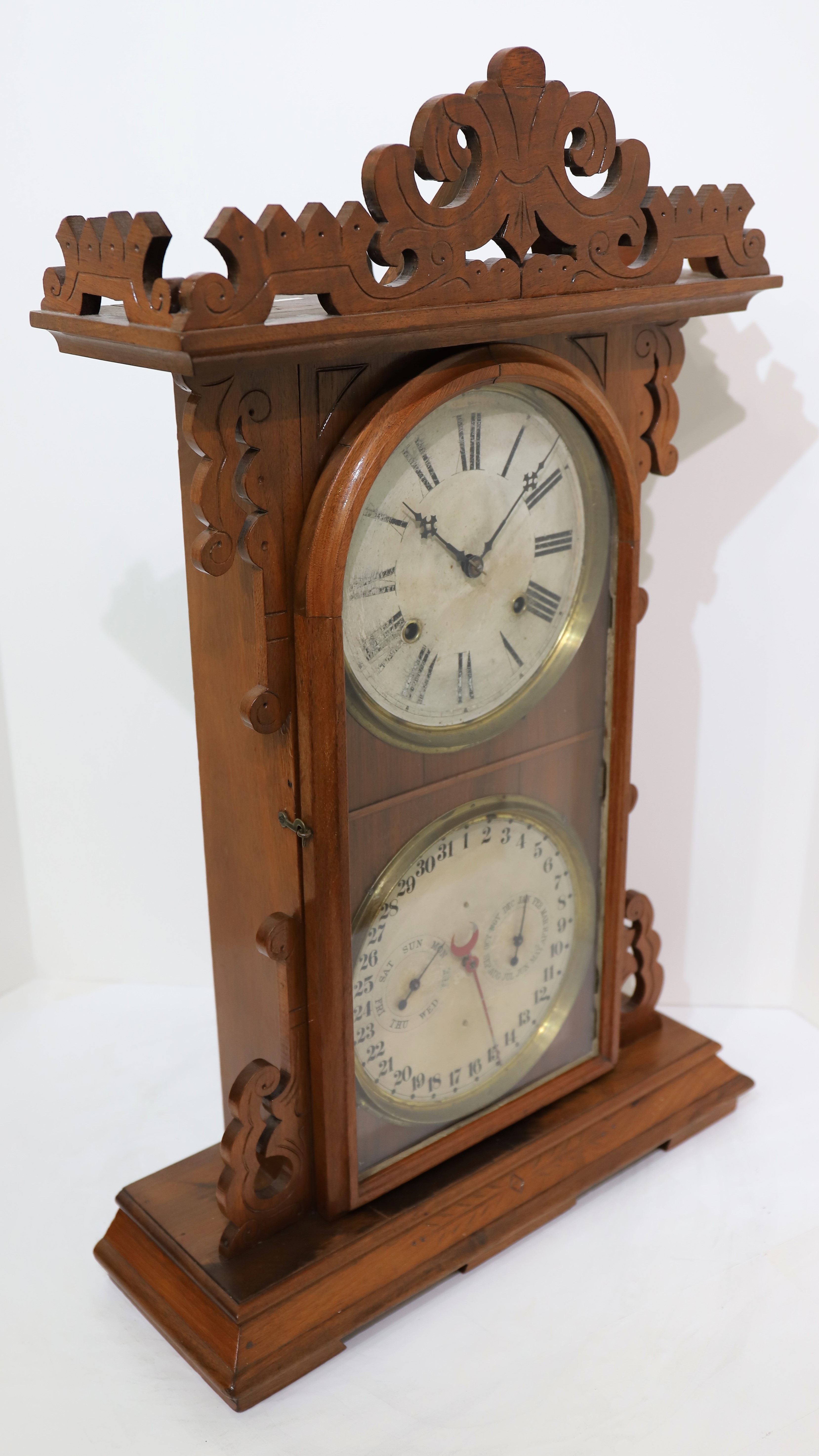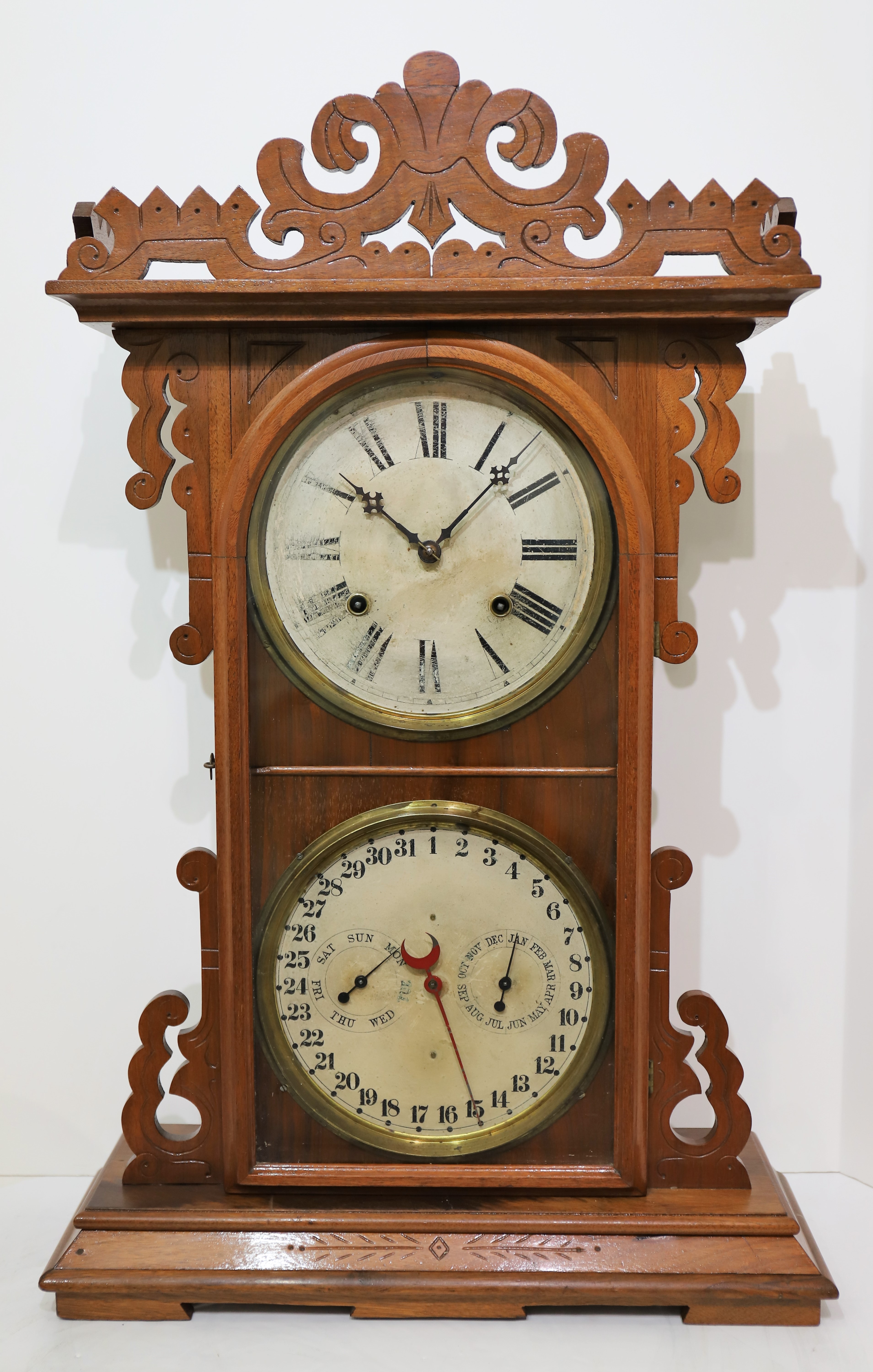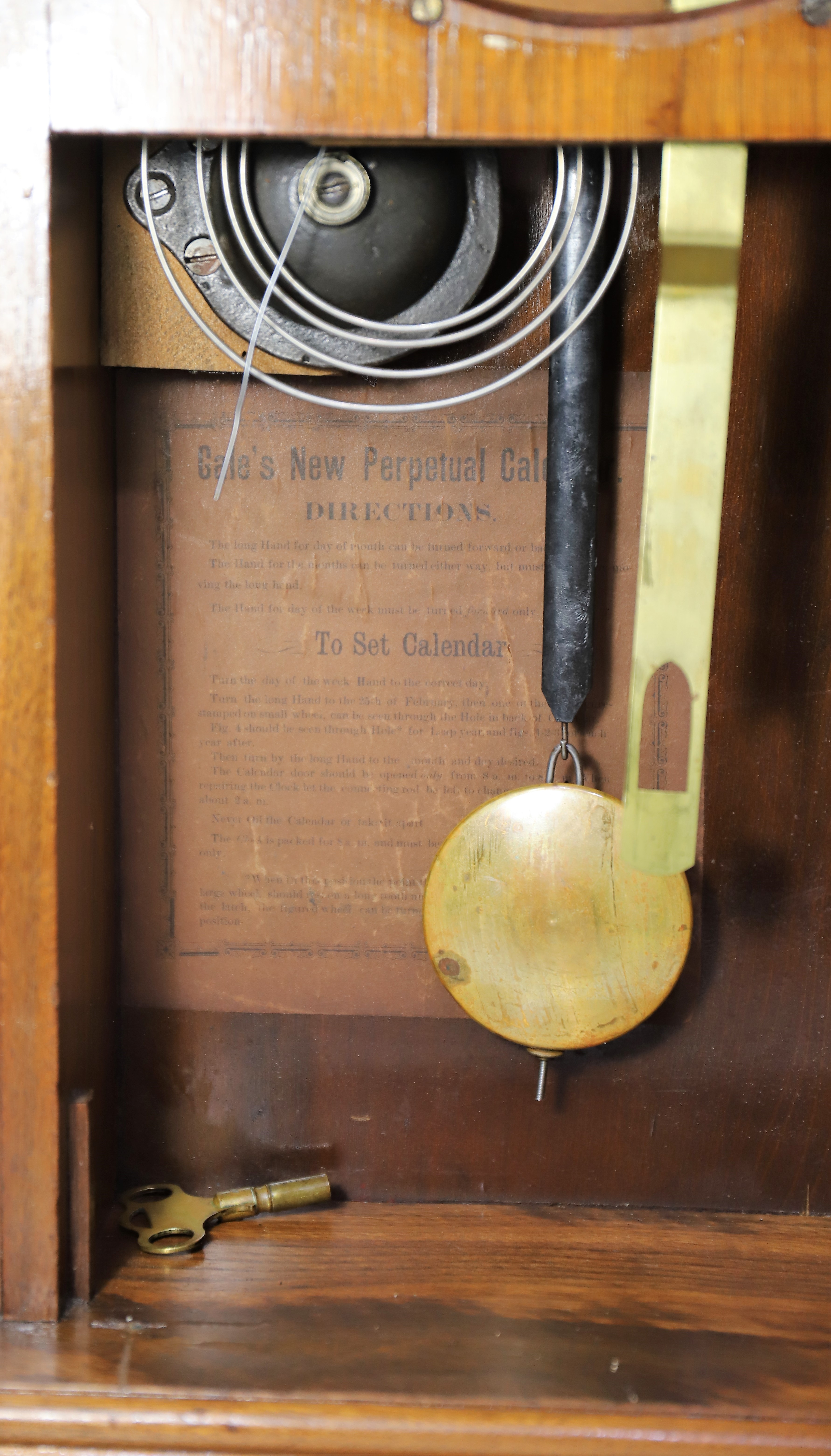 but is period, the dials are paper with considerable wear and discoloration. The hands are proper and likely original. The die-stamped 8-day, time-and-strike movement is running and striking, the calendar is advancing. There is an instruction