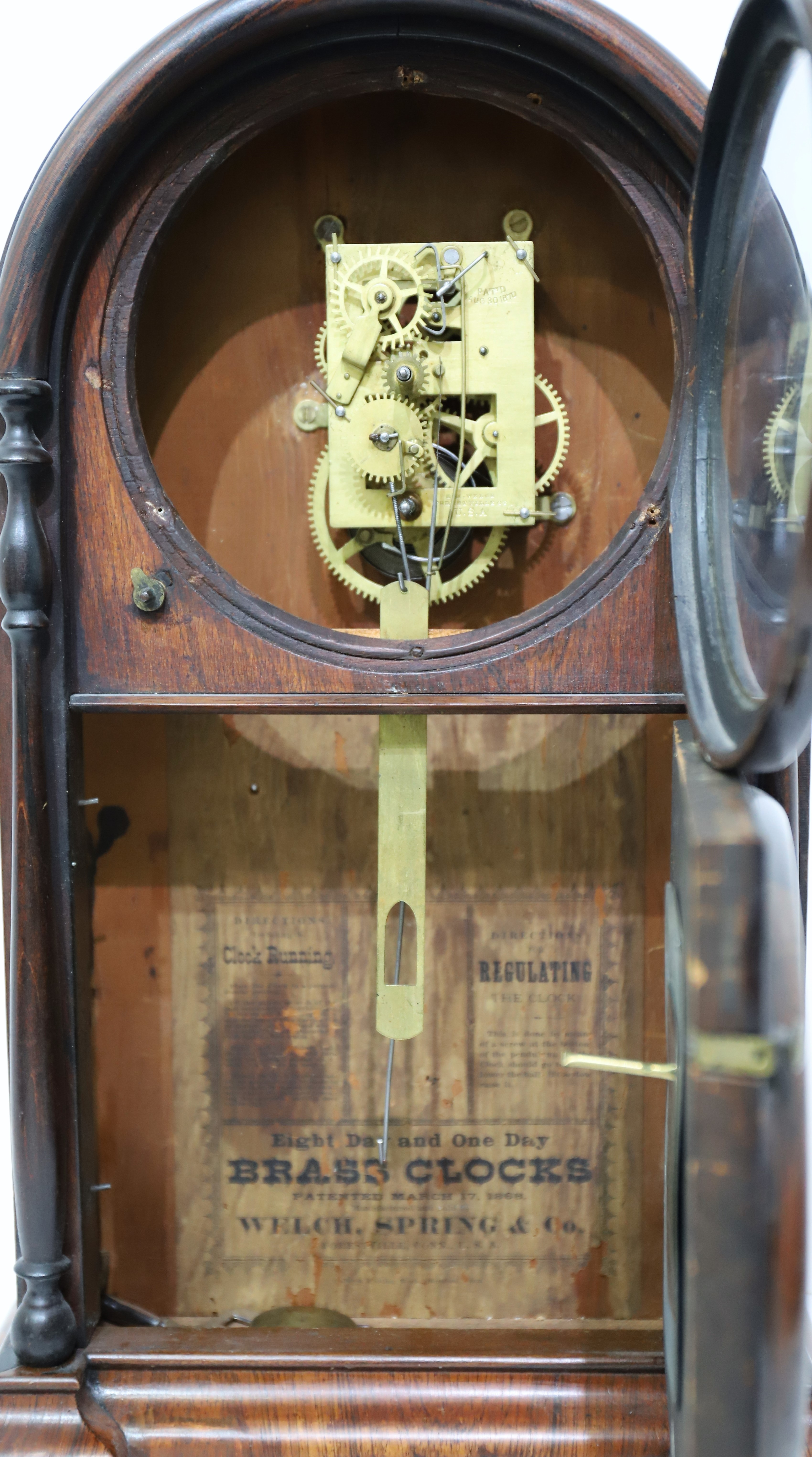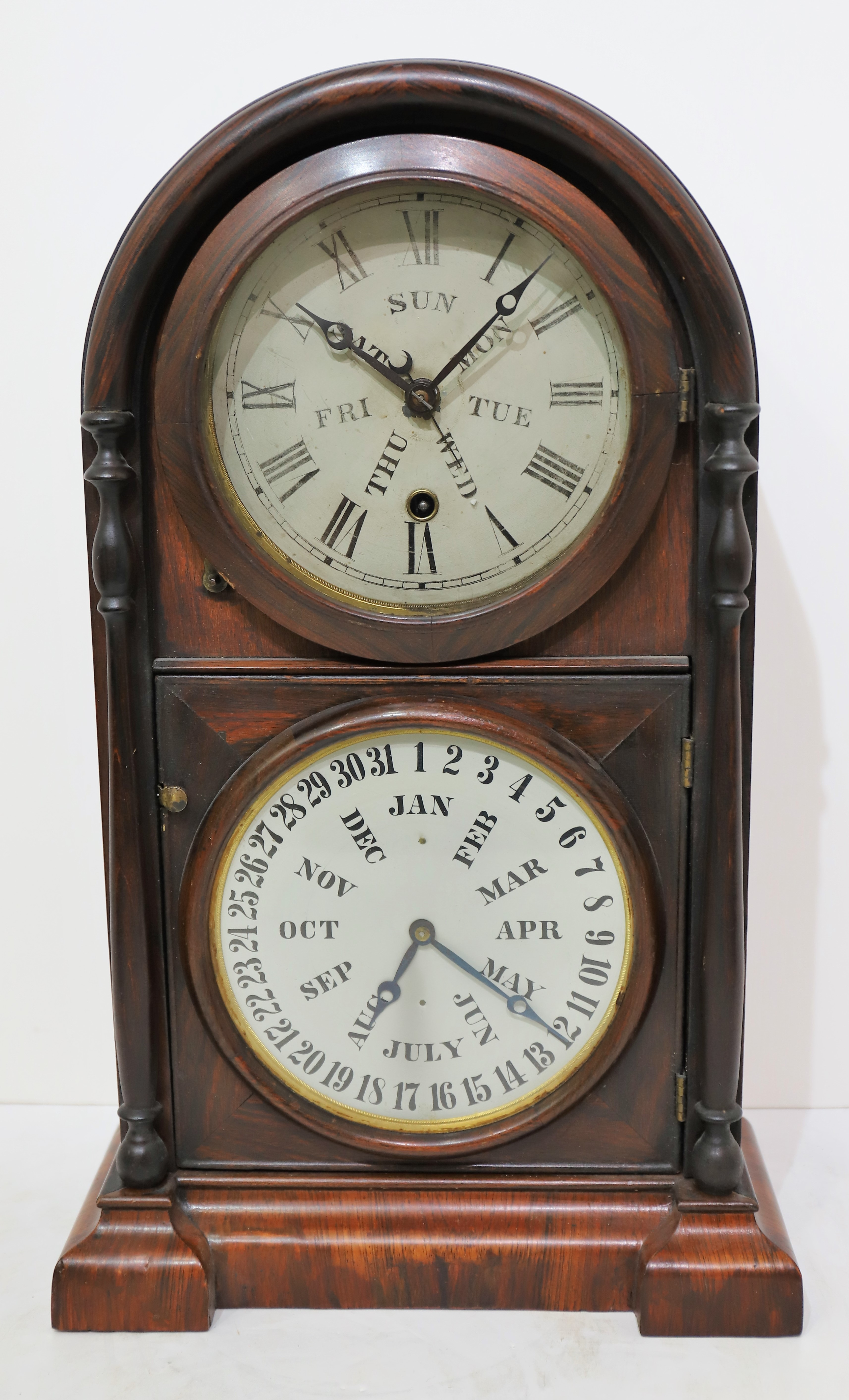 Welch, Spring & Co. “Italian No. 3” calendar, ca. 1870. The 19.75-inch case is veneered in rosewood with an old finish and some patina; I think the wooden bezels are grain-painted to match. Both glasses are old, the time dial is faded and the numbering has been strengthened. The hands are correct all around (see