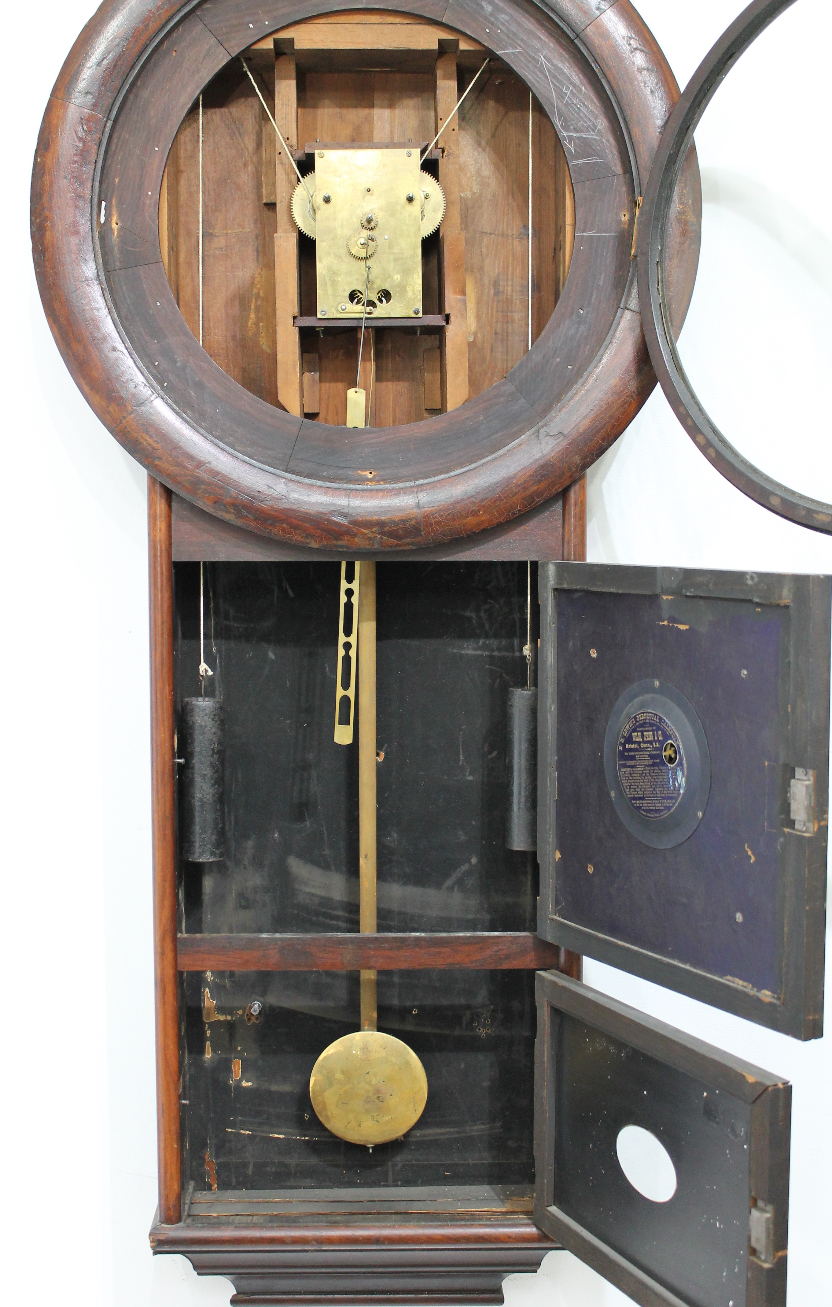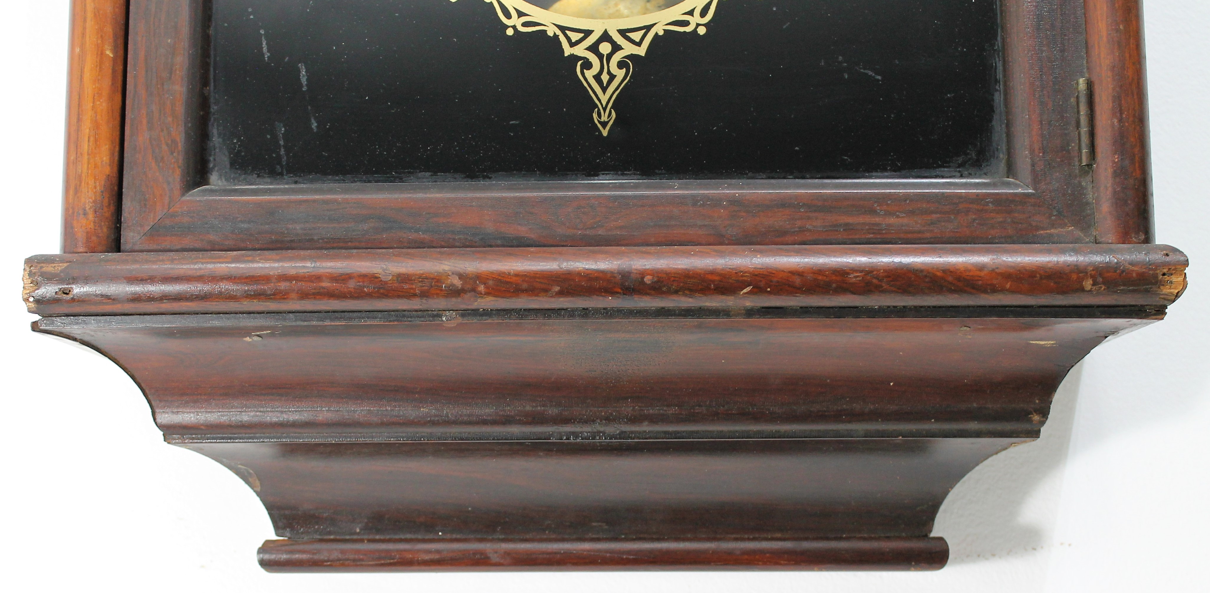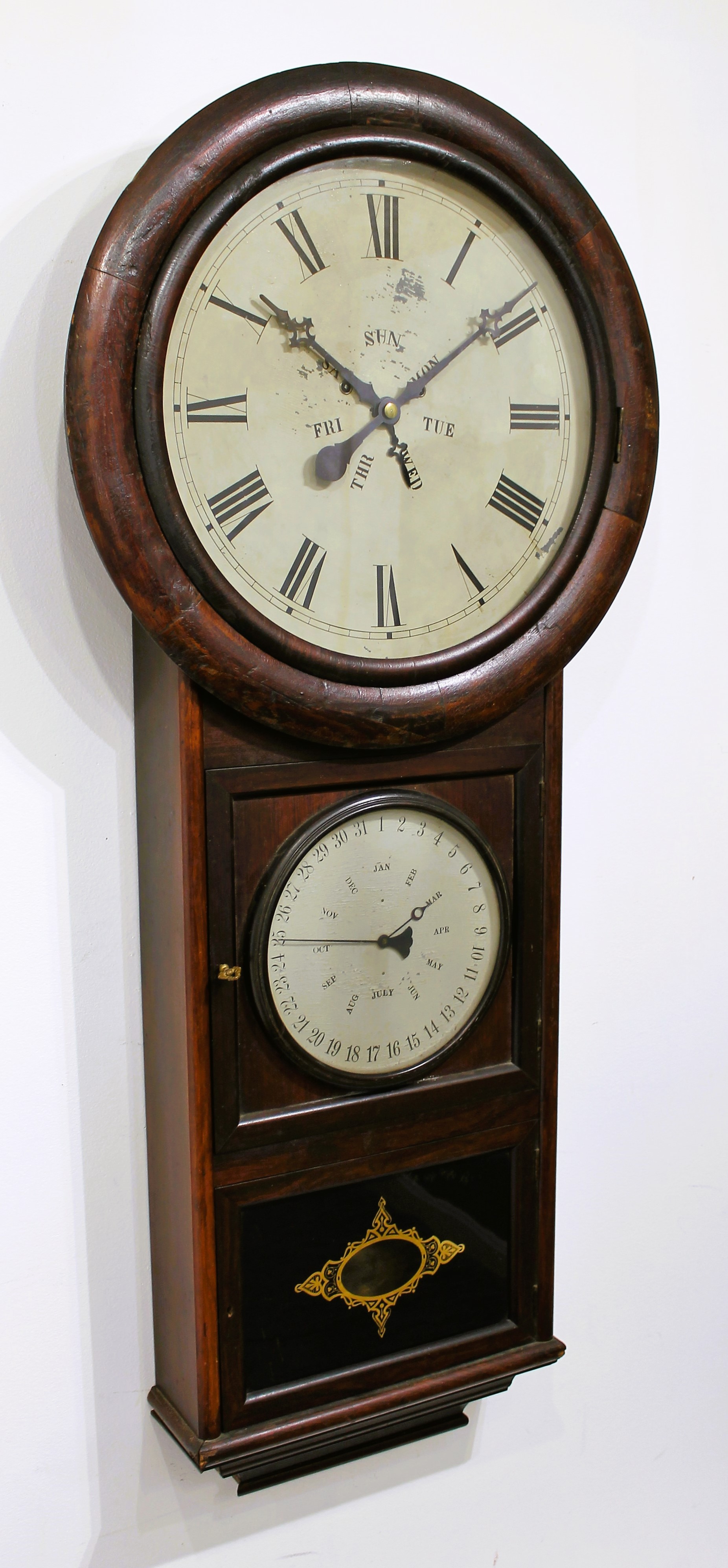 Welch, Spring & Co. “Regulator Calendar No. 1”, ca. 1878. This is an early weight-driven calendar clock, 52 inches long with a very old finish, possibly original. The rosewood veneer