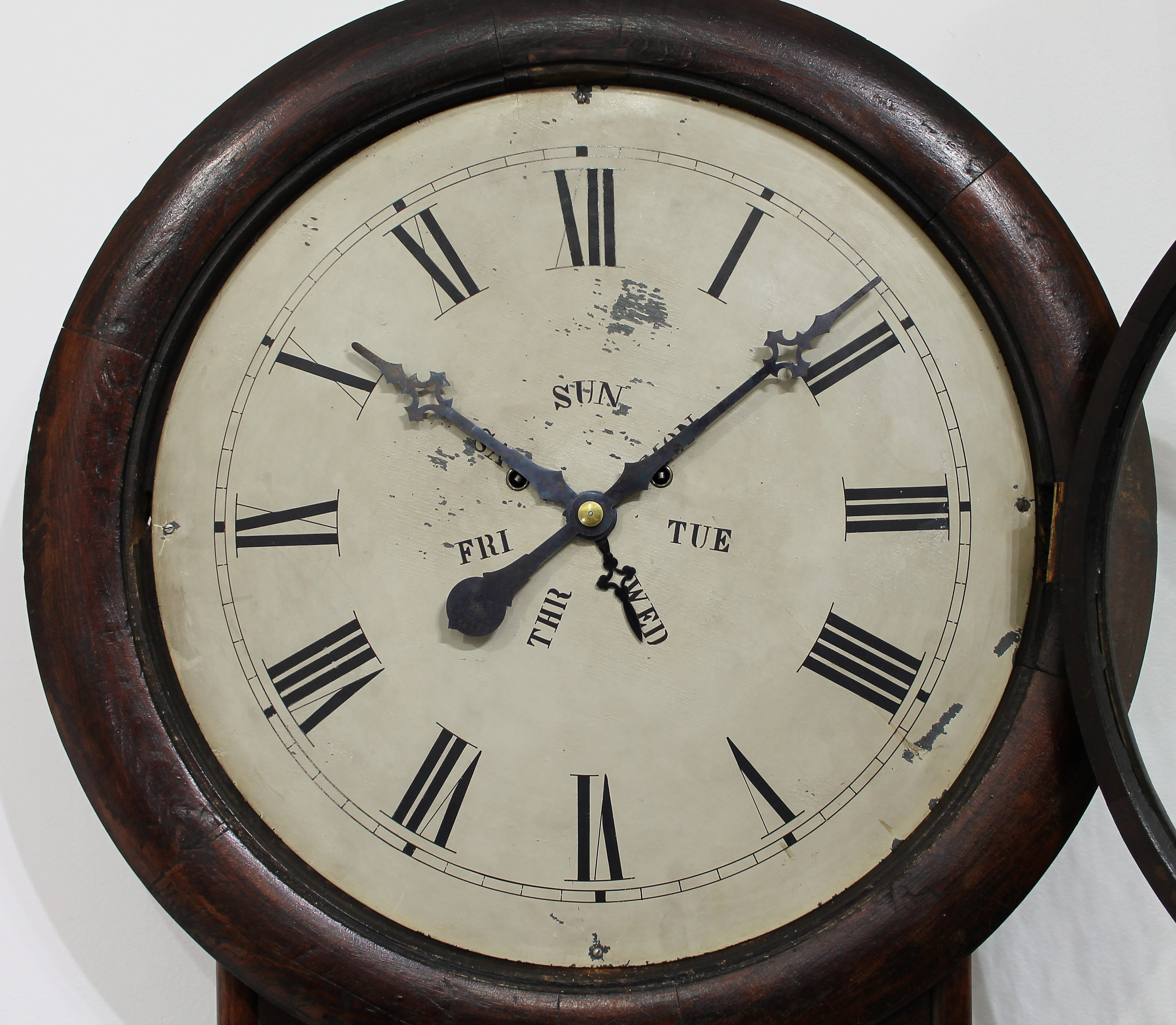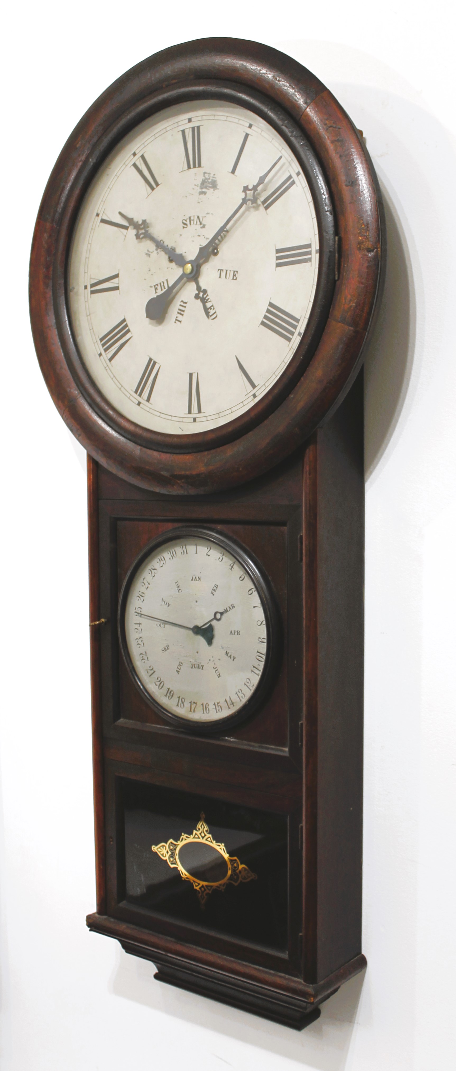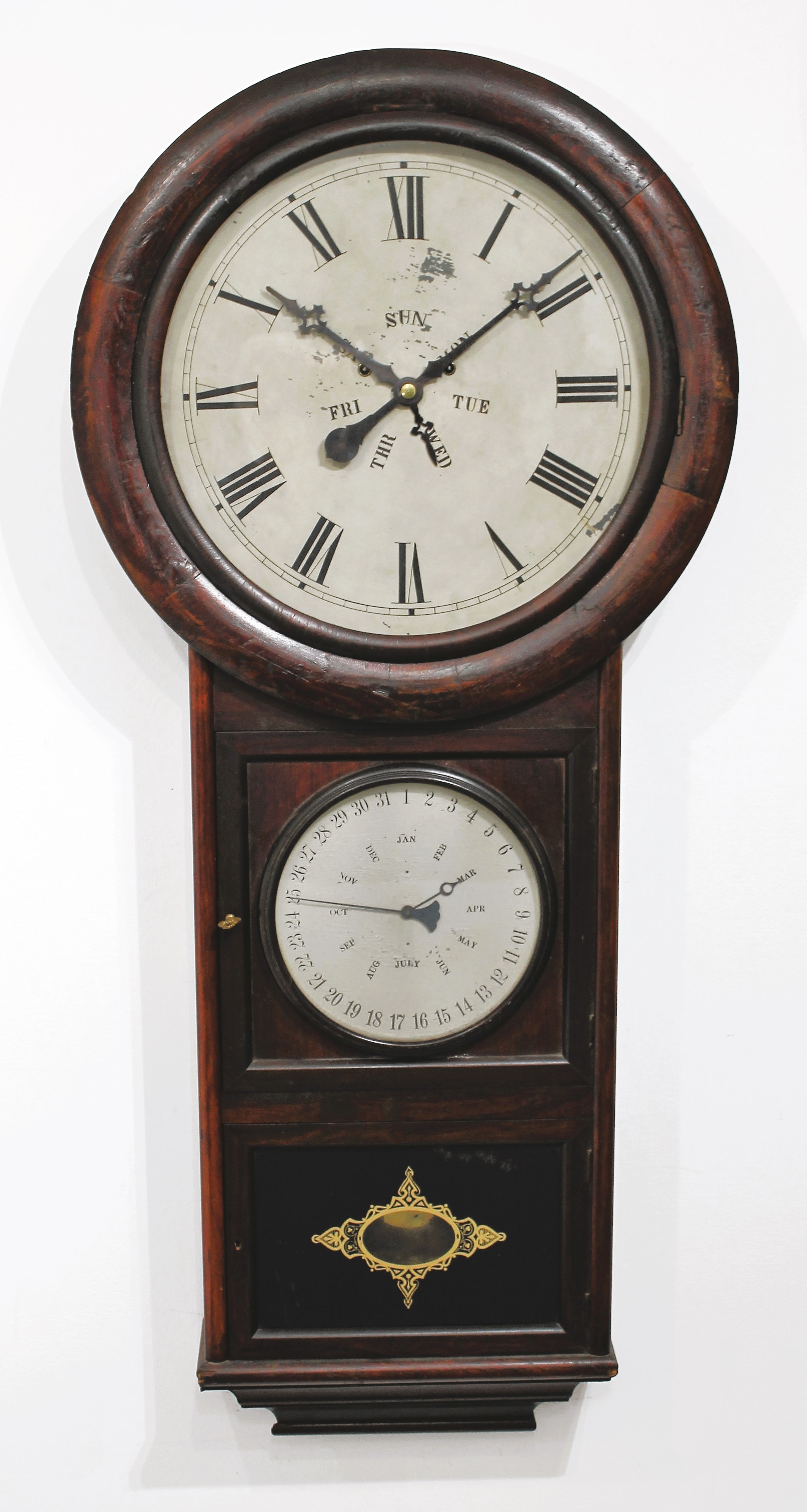 Welch, Spring & Co. “Regulator Calendar No. 1”, ca. 1878. This is an early weight-driven calendar clock, 52 inches long with a very old finish, possibly original. The rosewood veneer