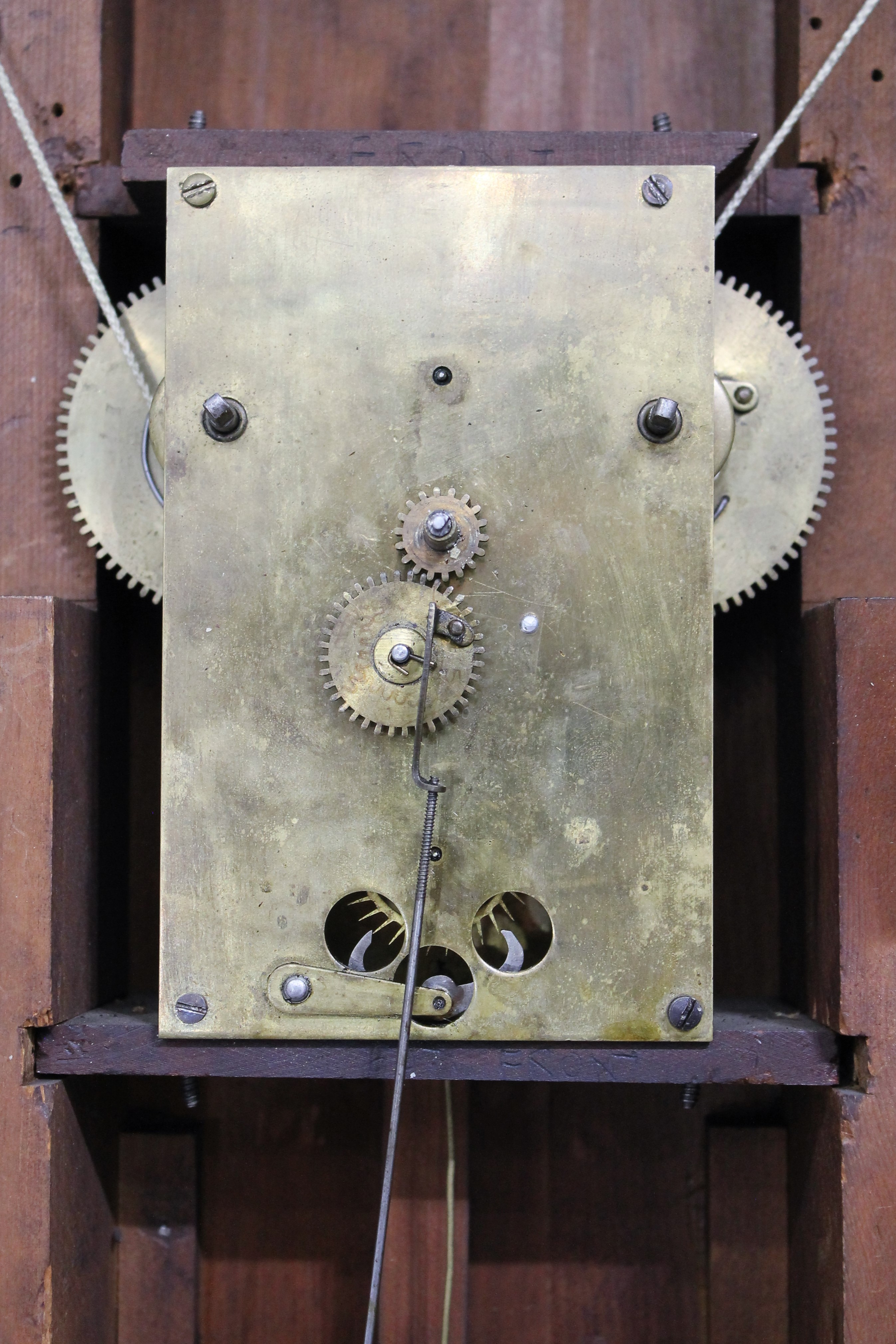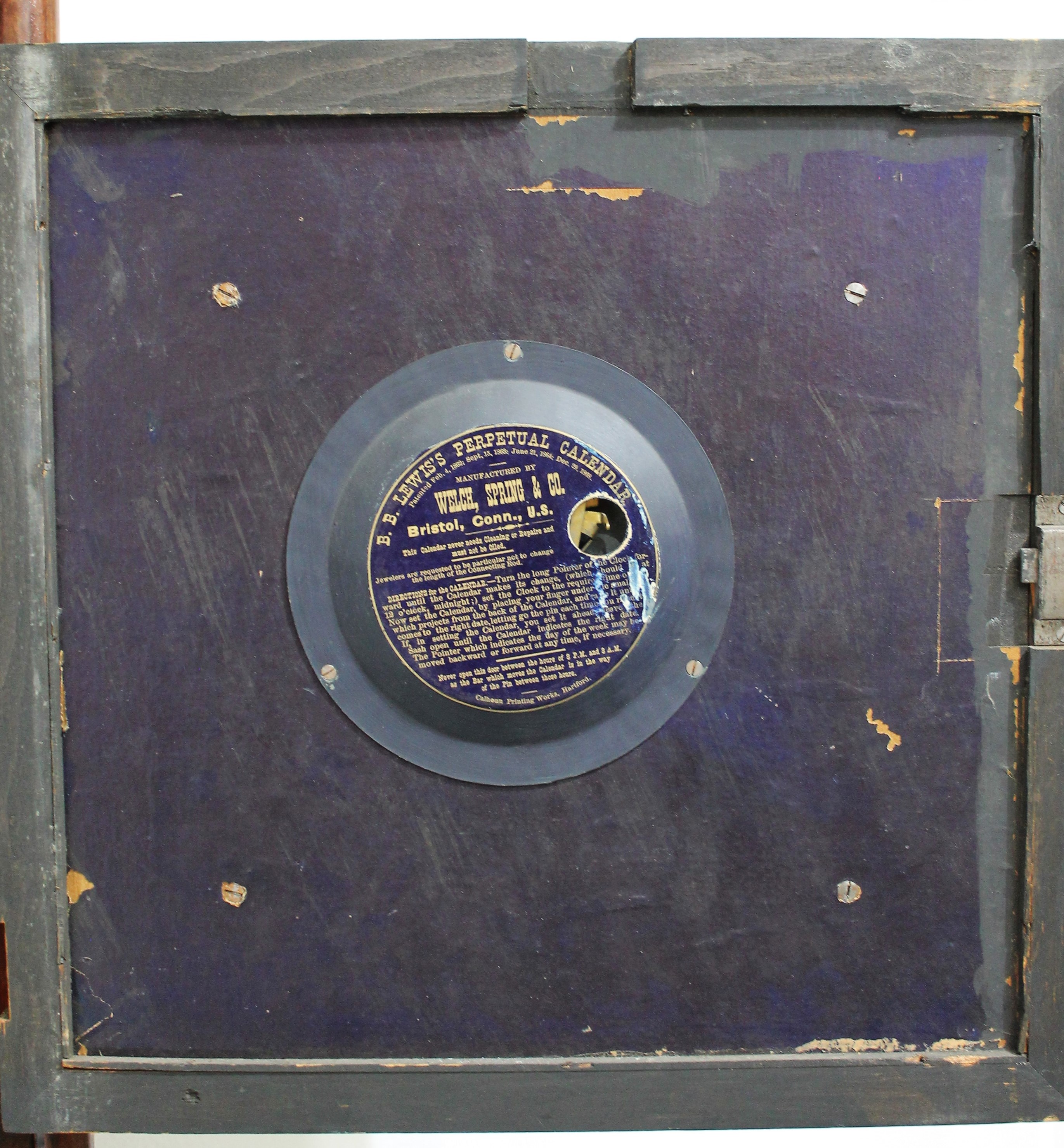 examples of this model used an upside-down brass plate movement, as found here (note the winding arbors above the mainstem). It is weight-driven with two appropriate cast iron weights and is running, but stops irregularly. The B.B. Lewis calendar mechanism