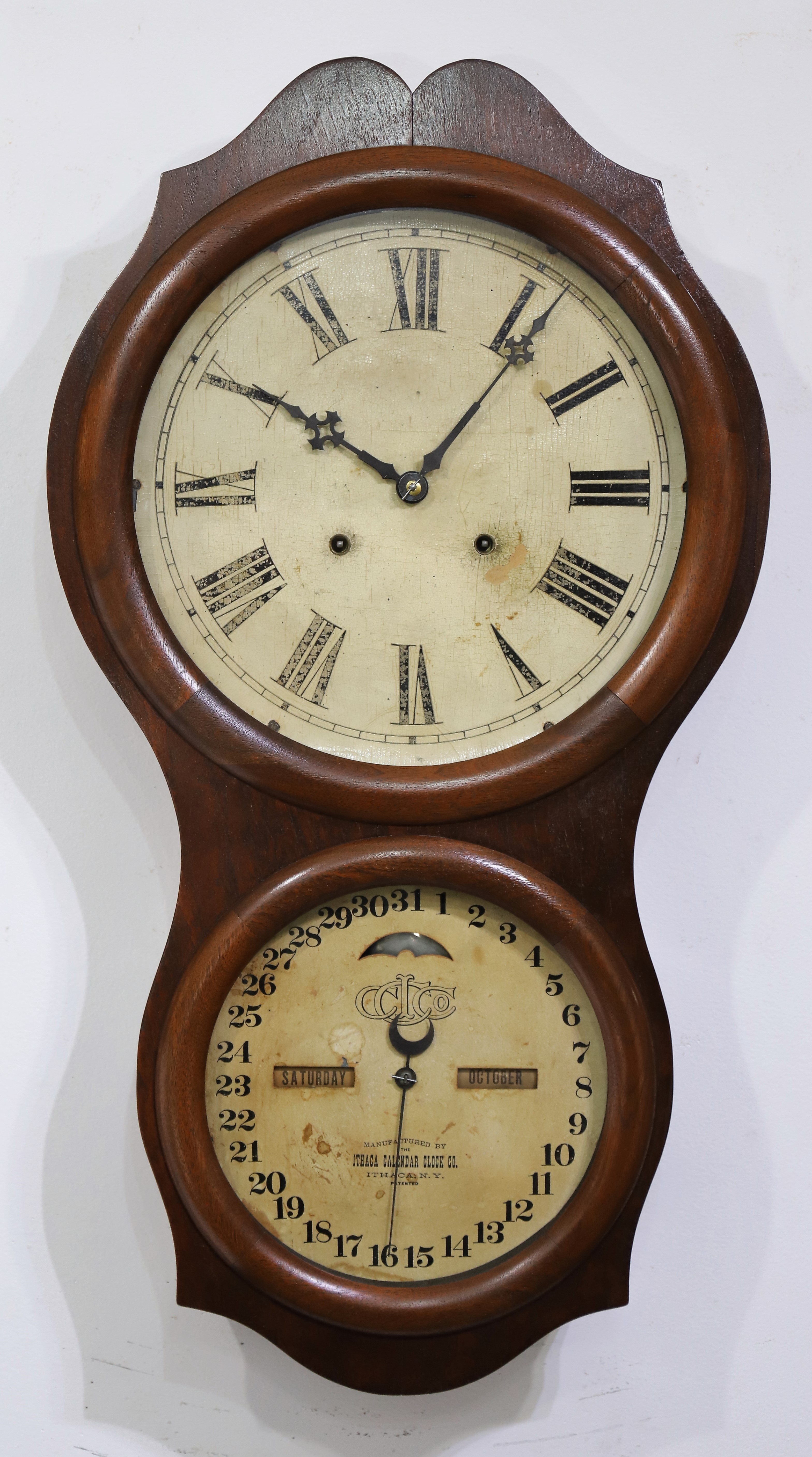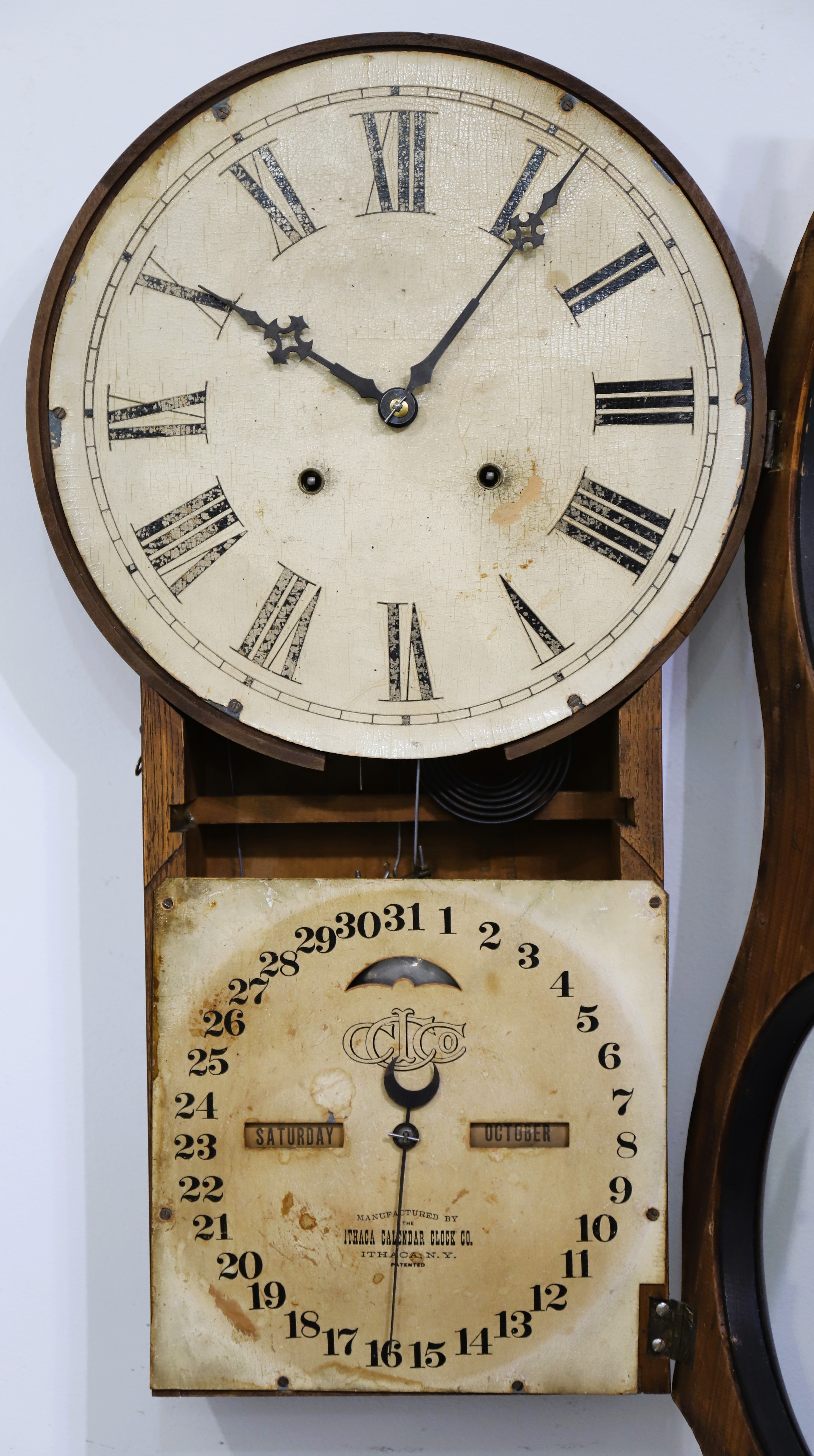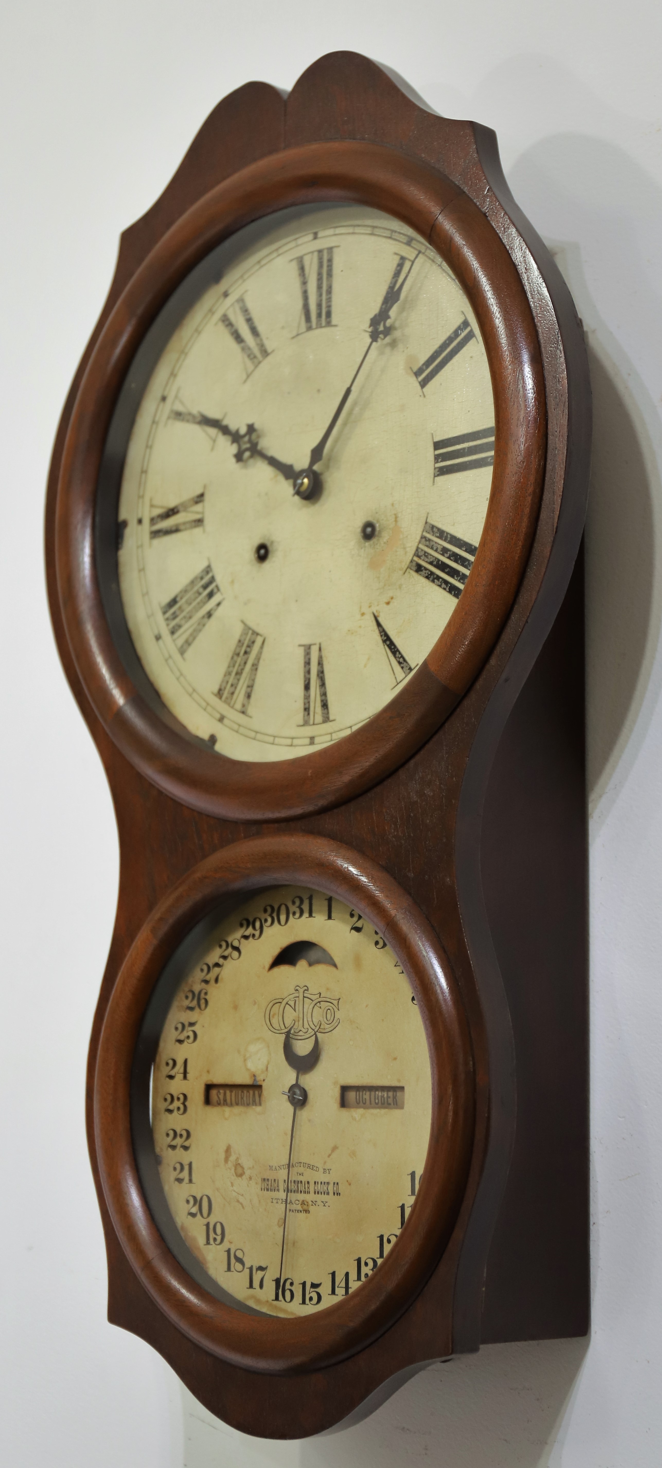 Ithaca Calendar Clock Co. “No. 4 Hanging Office”, 1869-1918. A second example of this workhorse calendar clock that was appreciated for its 12-inch dial and easy visibility across an office. It came with a variety of movements, and even came without a calendar. This walnut example contains an 8-day time-and-strike