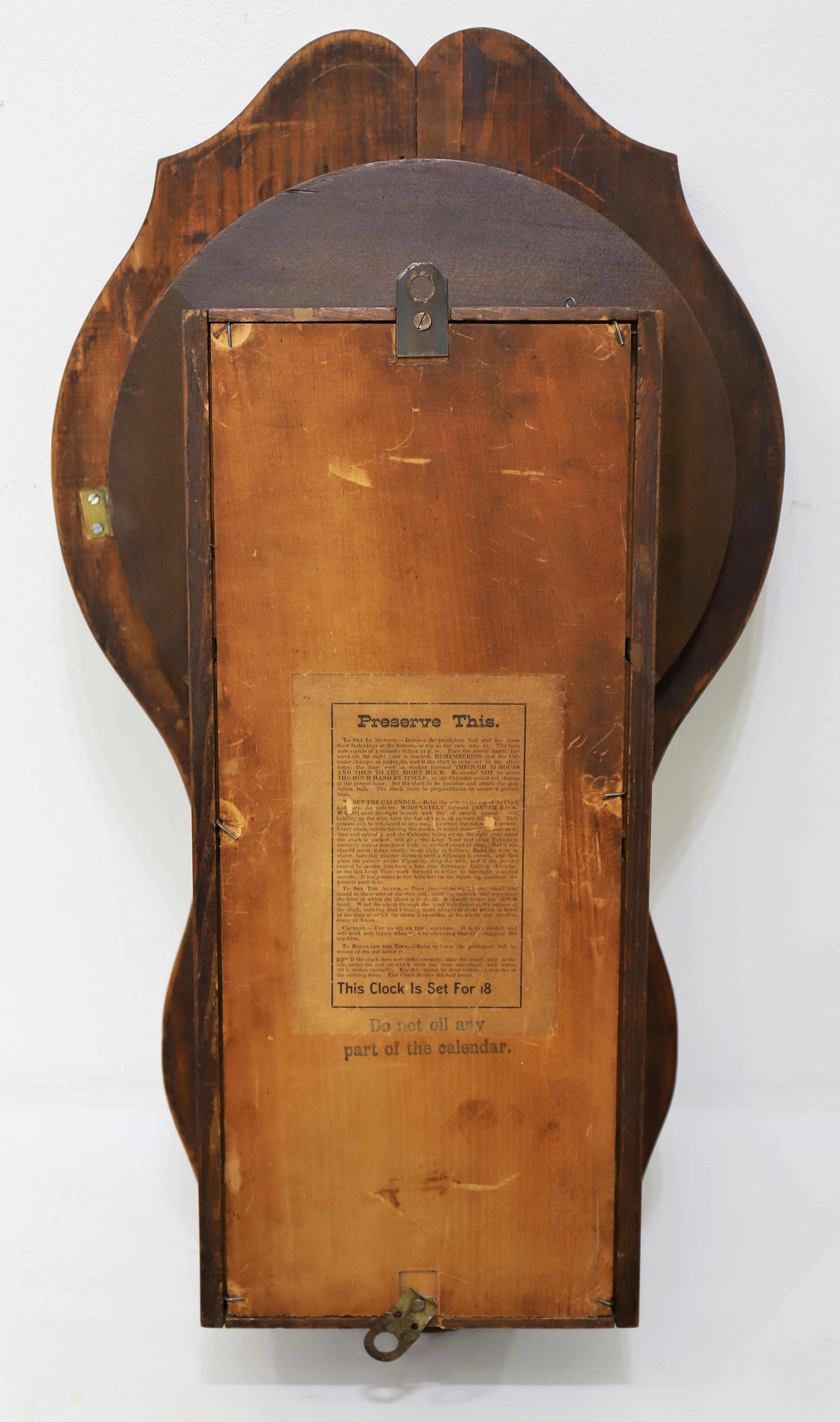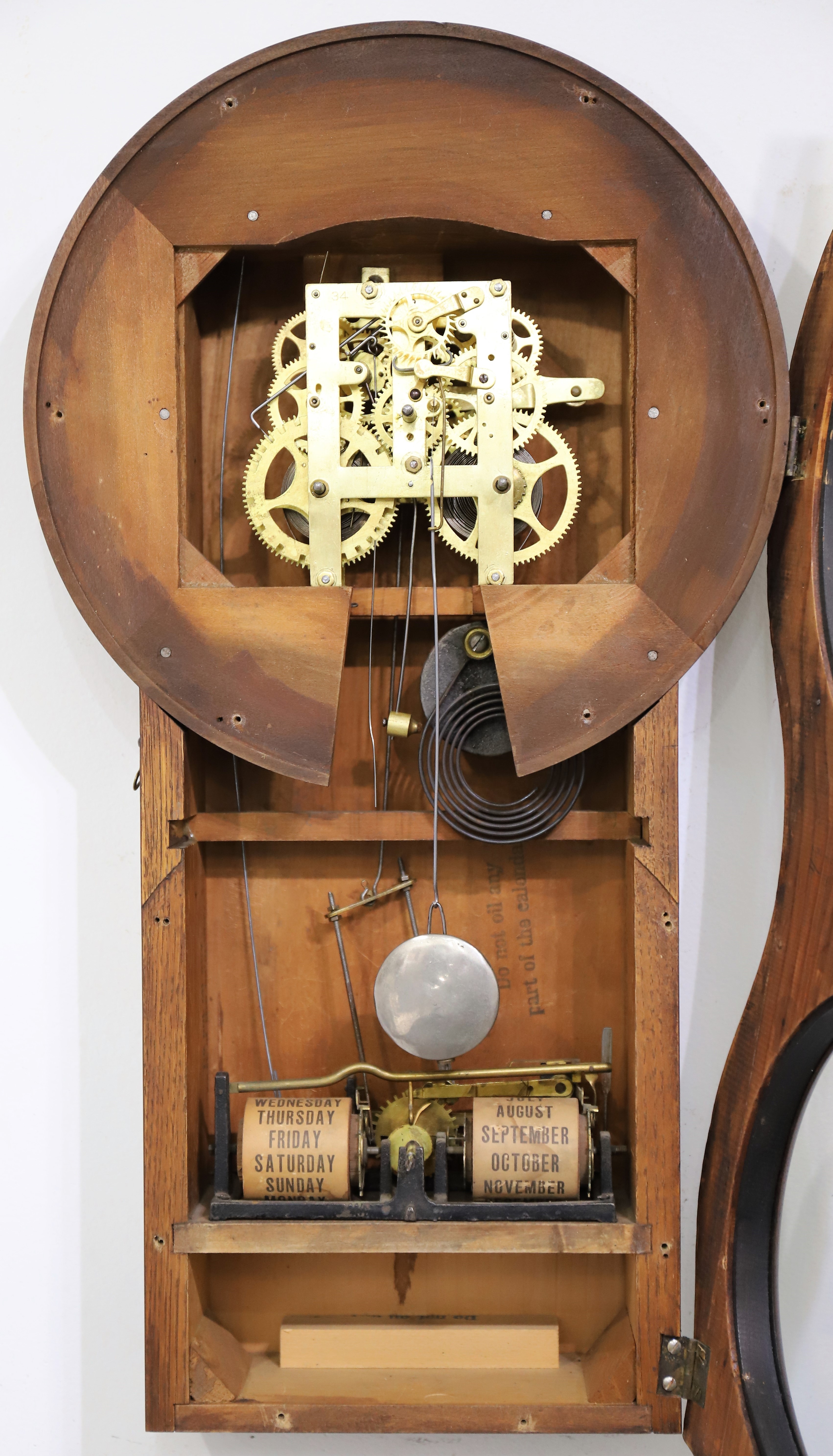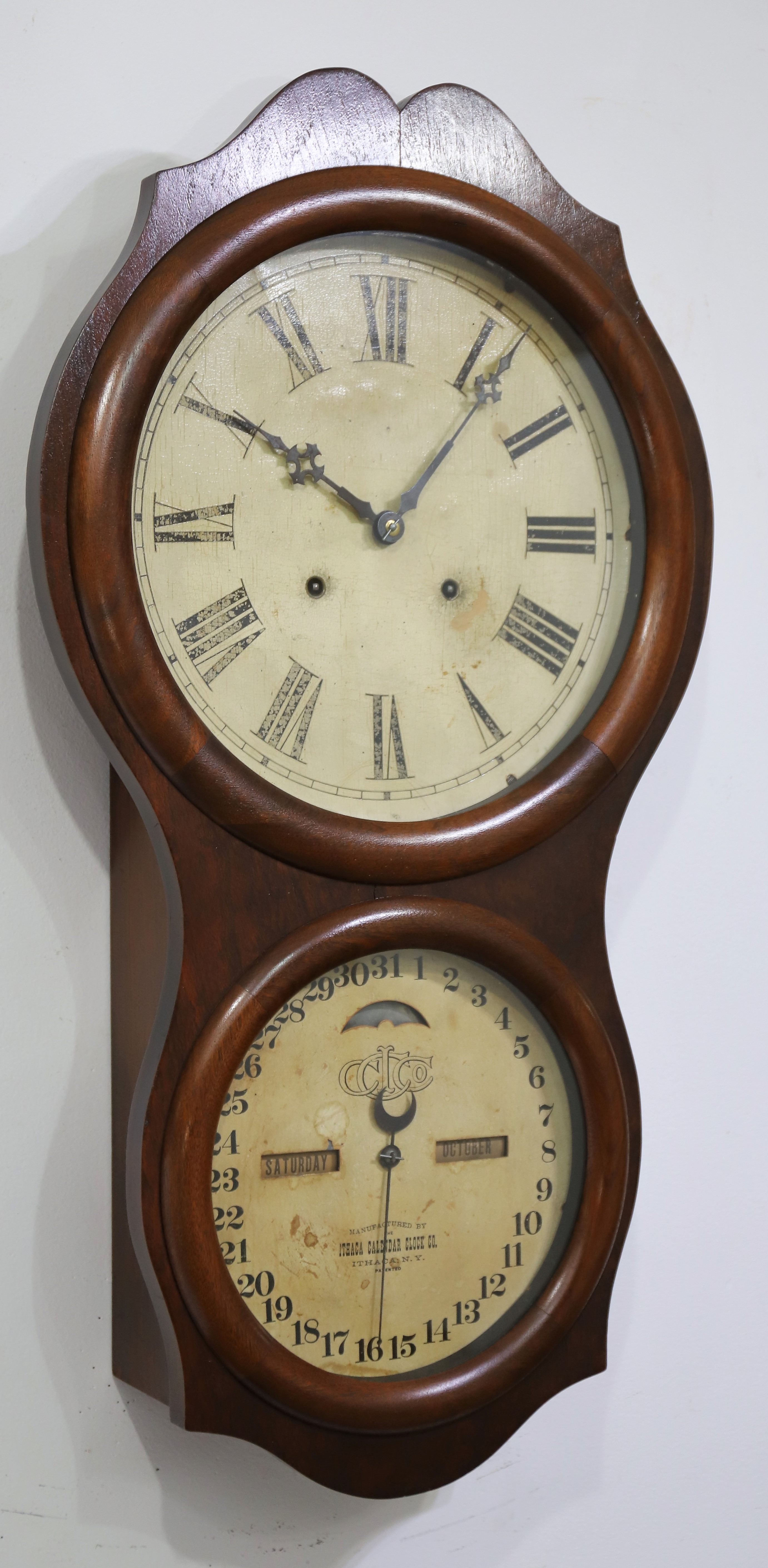 Ithaca Calendar Clock Co. “No. 4 Hanging Office”, 1869-1918. A second example of this workhorse calendar clock that was appreciated for its 12-inch dial and easy visibility across an office. It came with a variety of movements, and even came without a calendar. This walnut example contains an 8-day time-and-strike