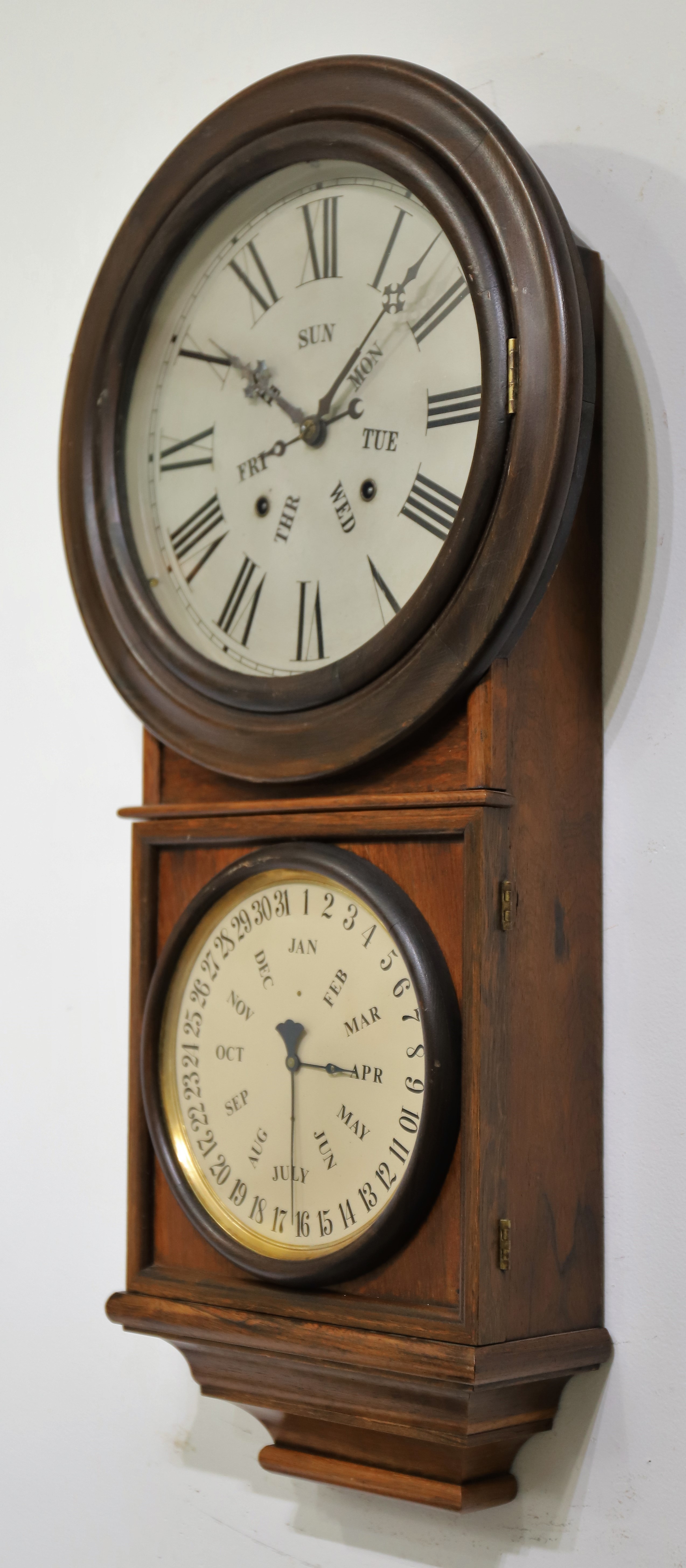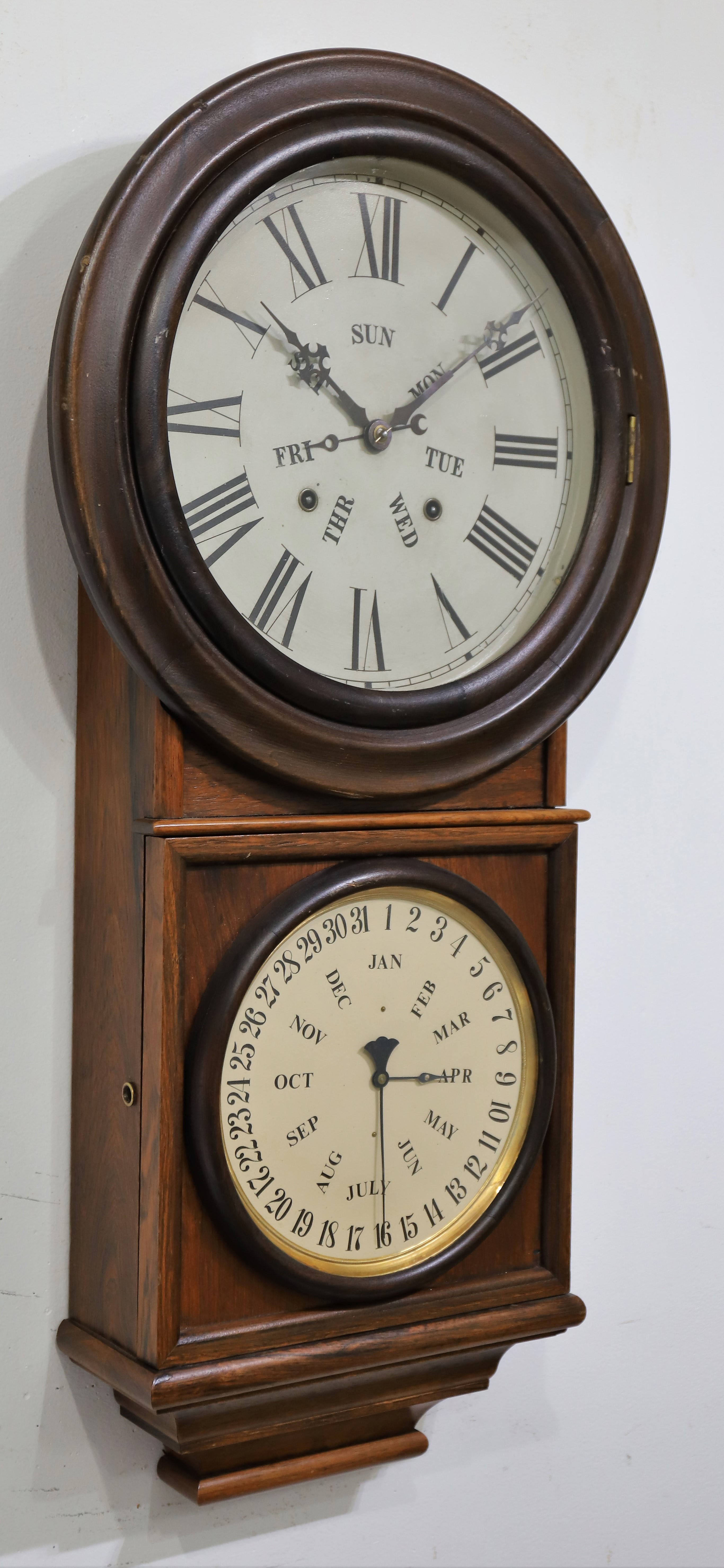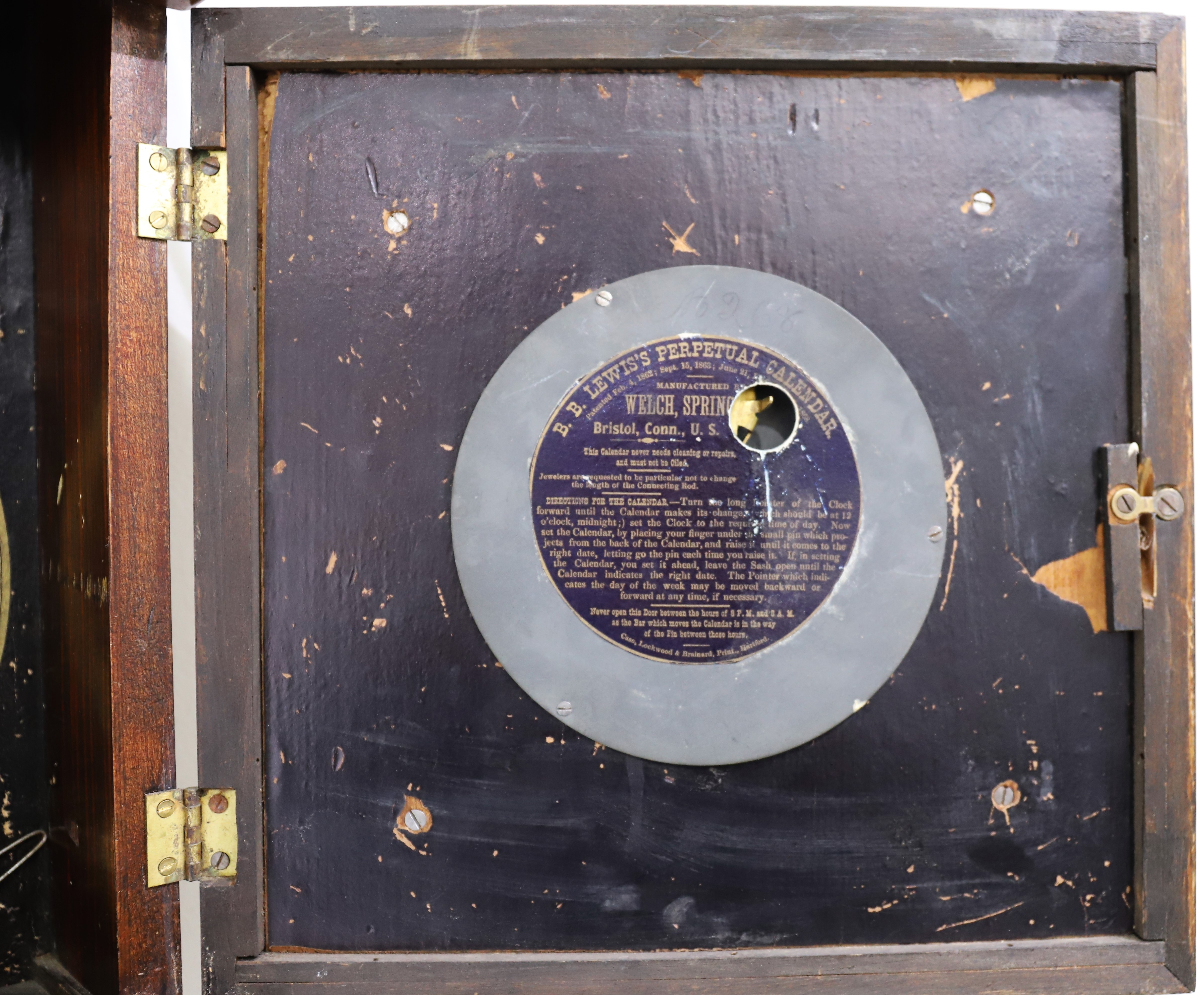 the time dial holds old paint with some touch-up at the edges, the calendar dial is paper I believe. All hands are correct. The E.N. Welch 8-day, time-and-strike movement is running and striking, and the calendar is advancing. There is a good label