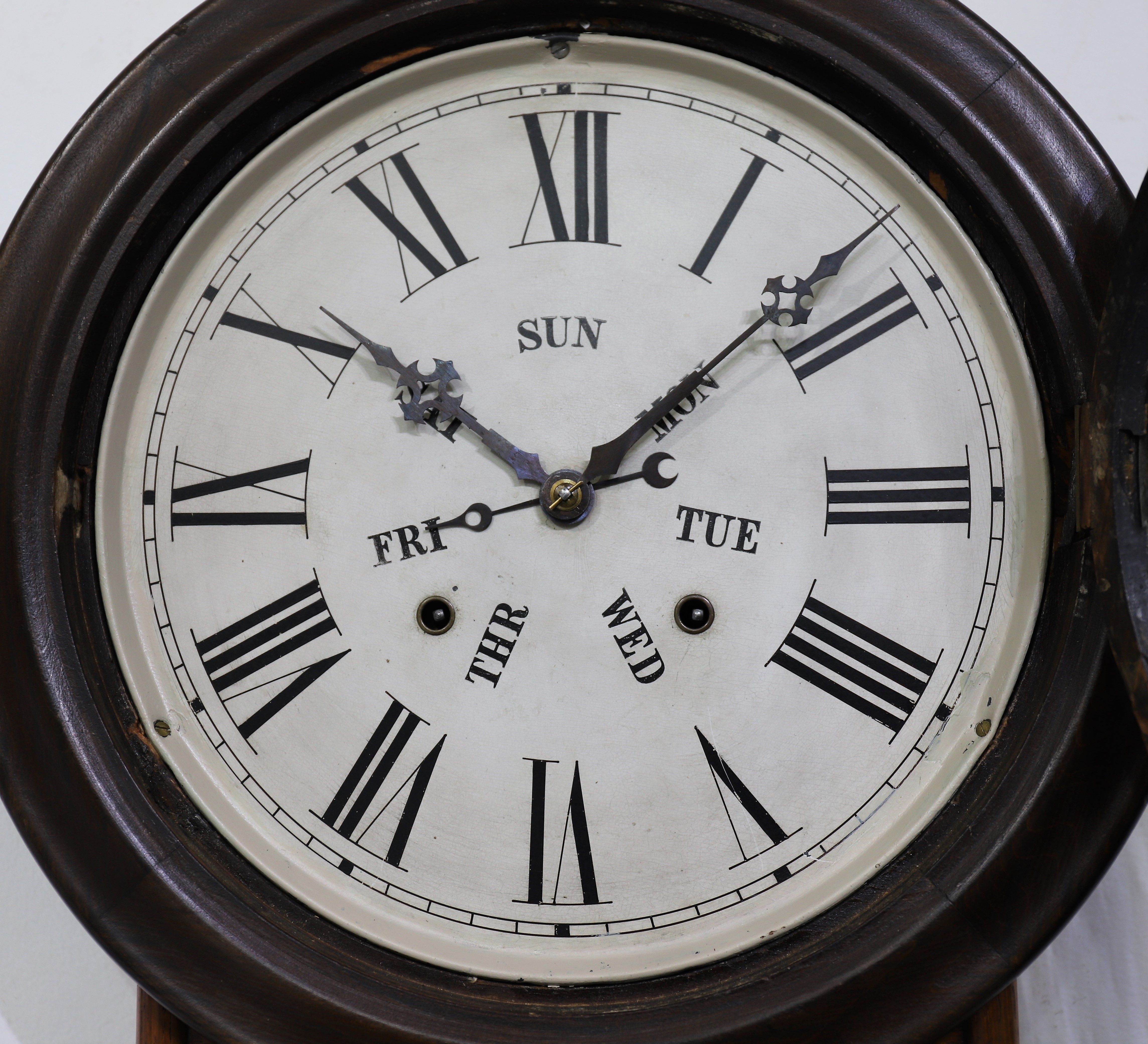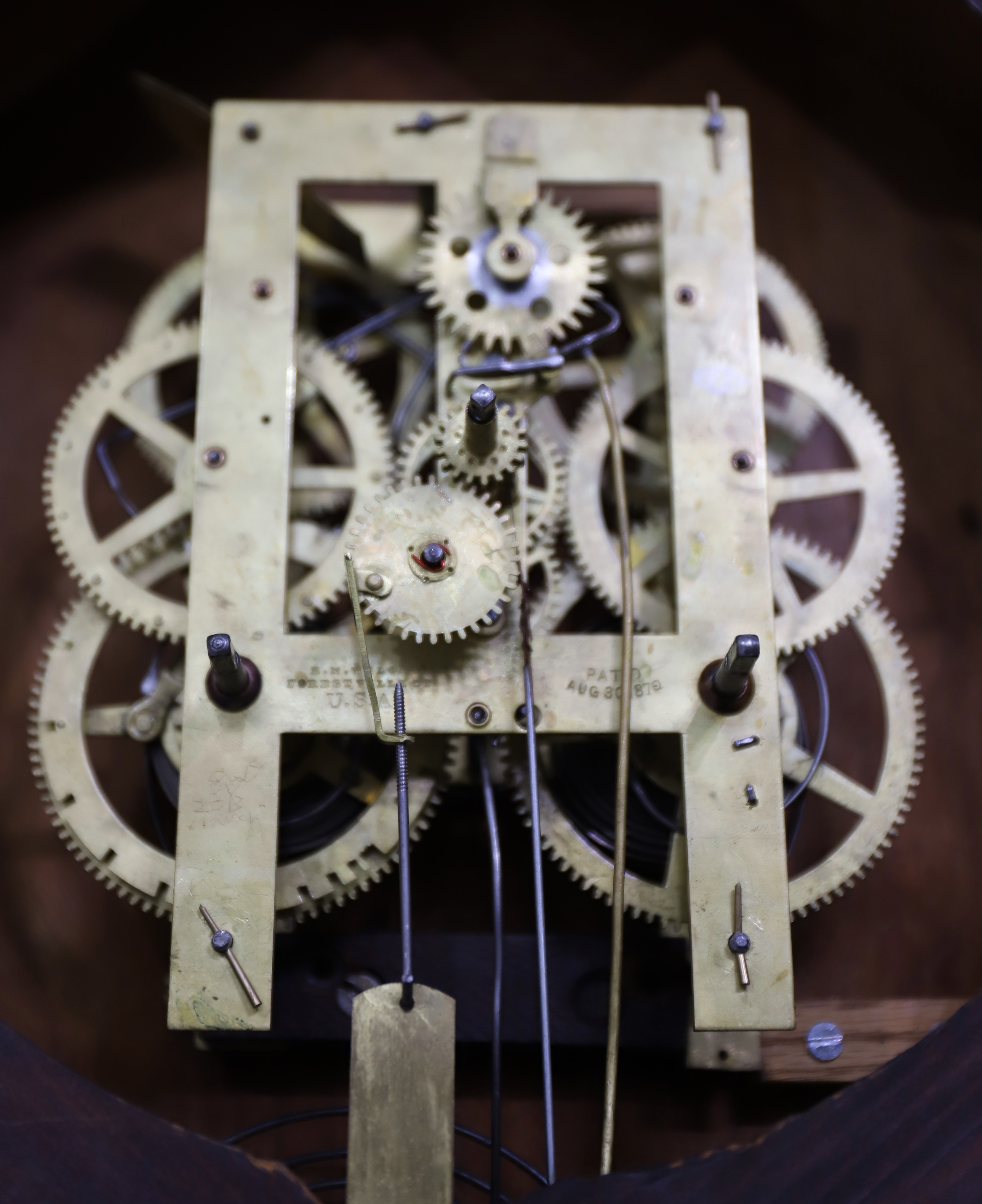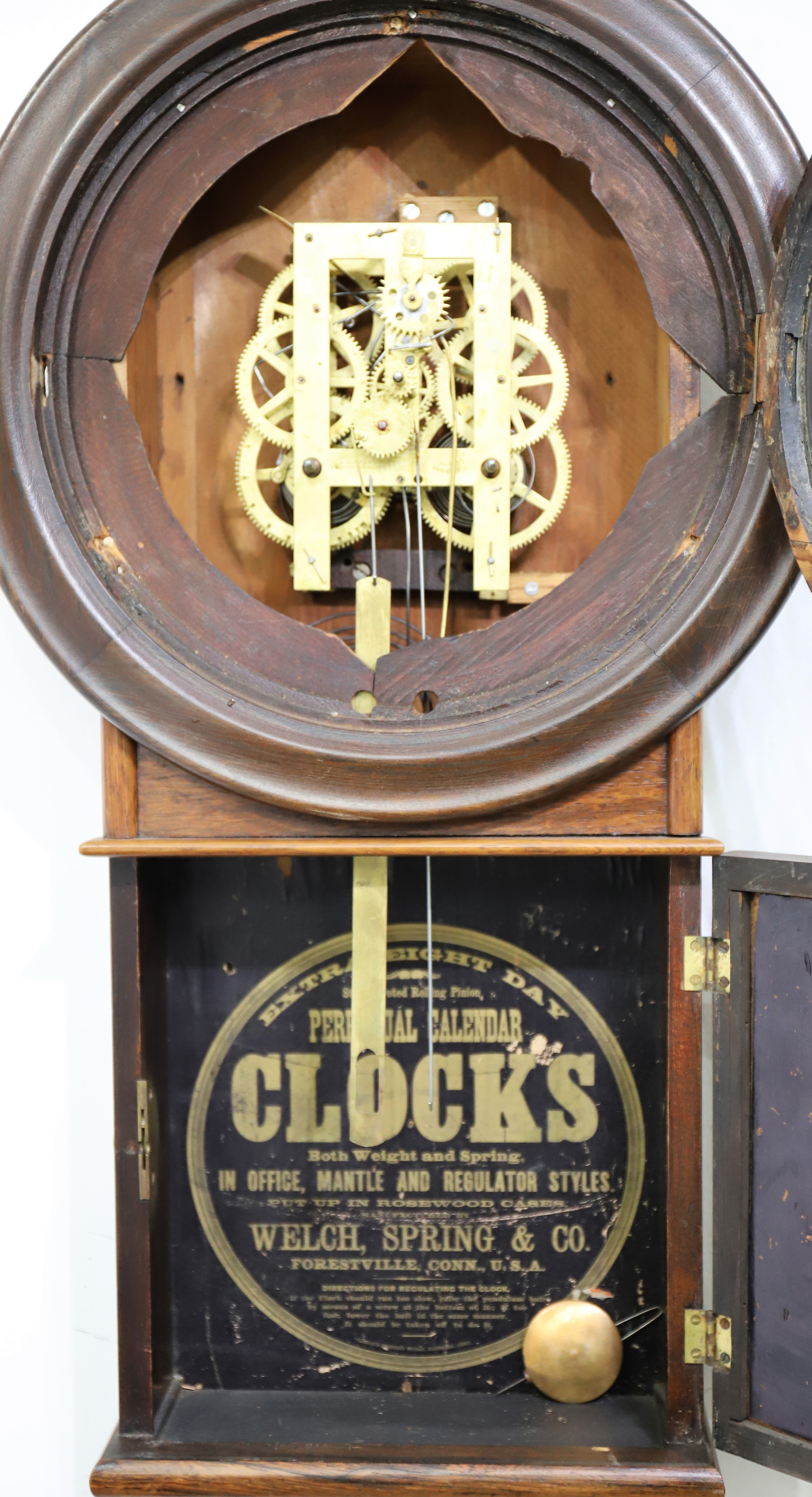 Welch, Spring & Co. “No. 4 Round Head Regulator”, ca. 1878. A 31-inch case veneered in rosewood with grain-painted bezels; most of the grain-painting is worn off. Both glasses are old/original,