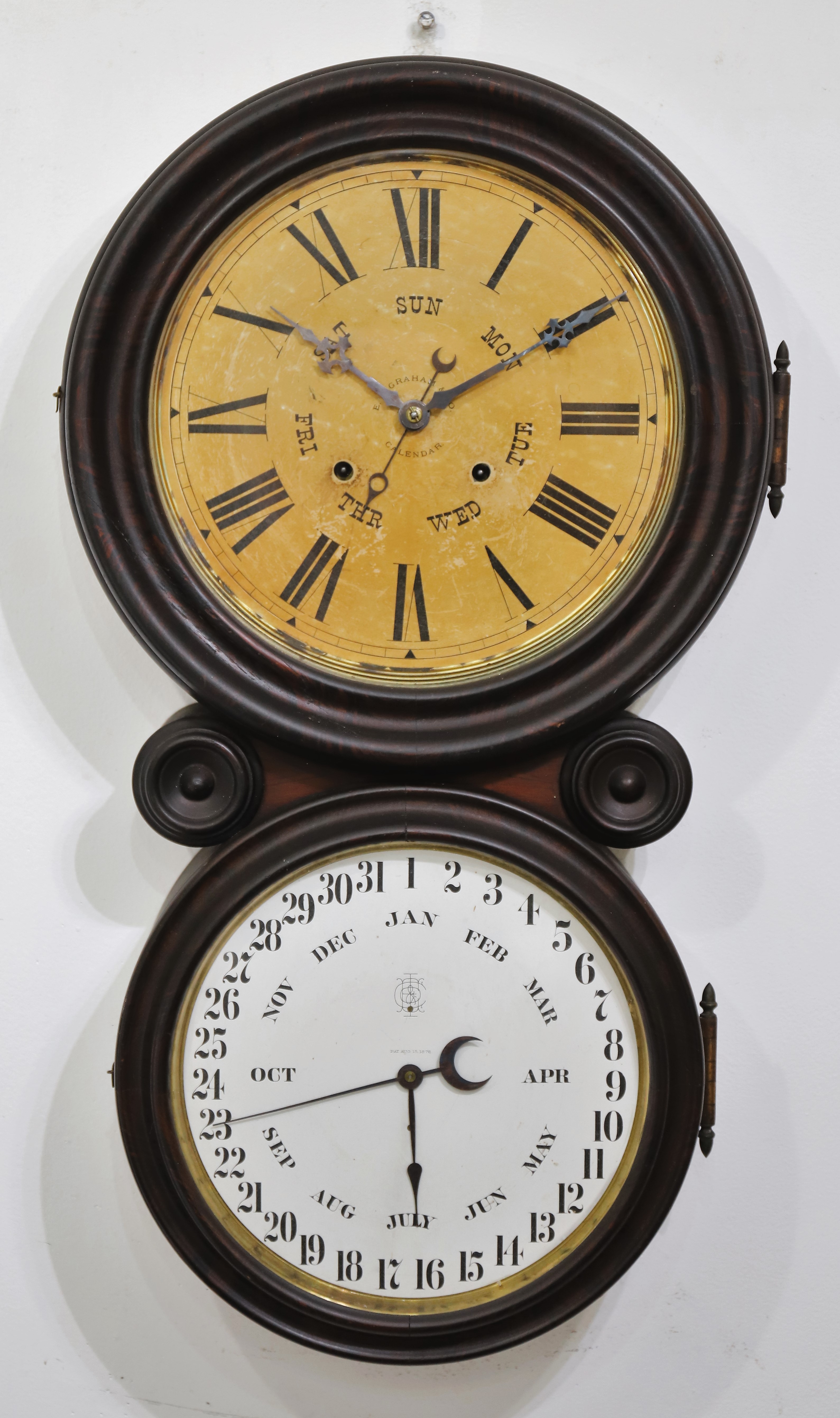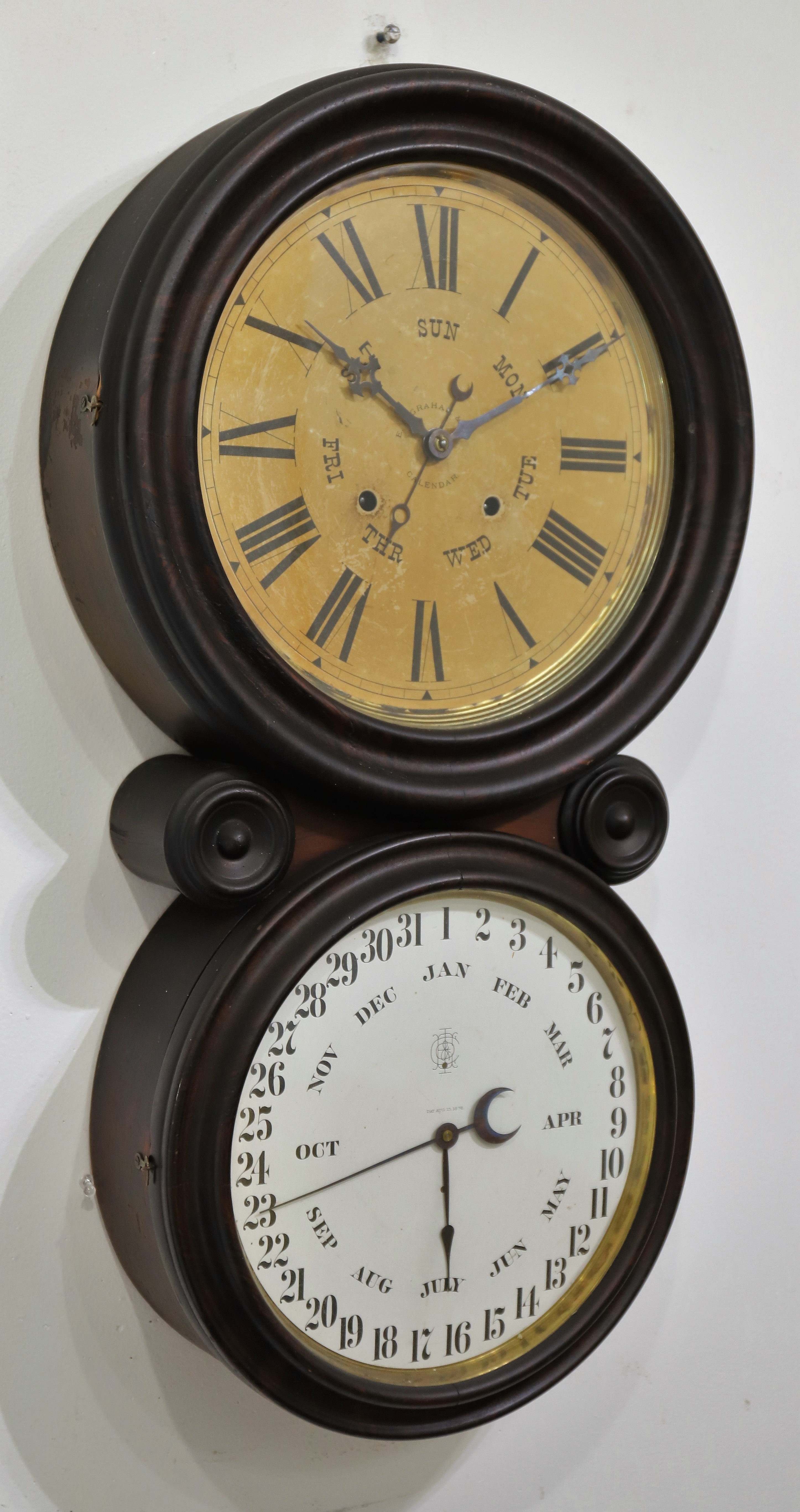time-and-strike movement is signed, running and striking on a wire gong, and the calendar is advancing. There is a good label
