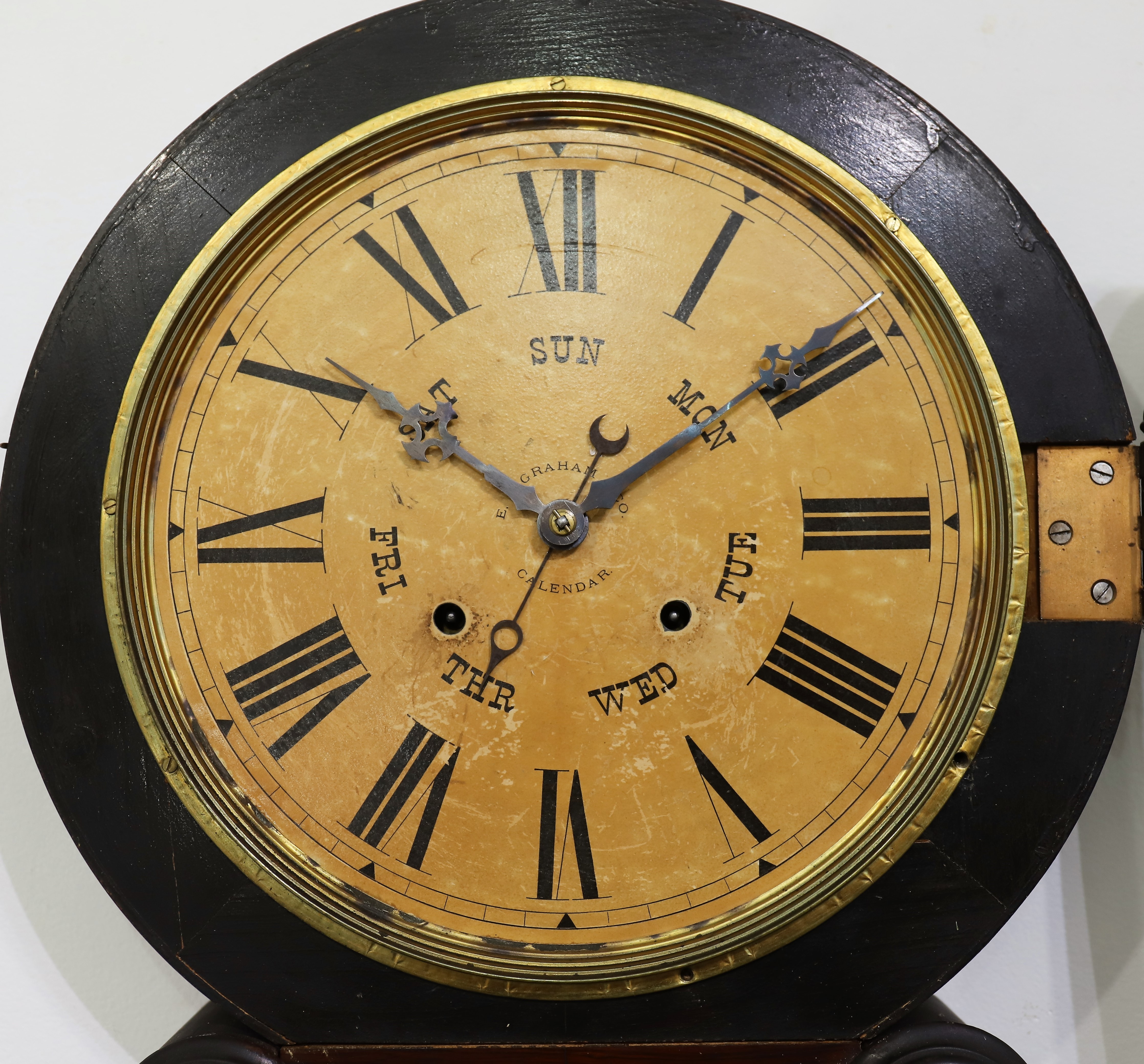 walnut case is 29 inches long with painted bezels to resemble rosewood; the grain-painting is retained but this clock has a thick
