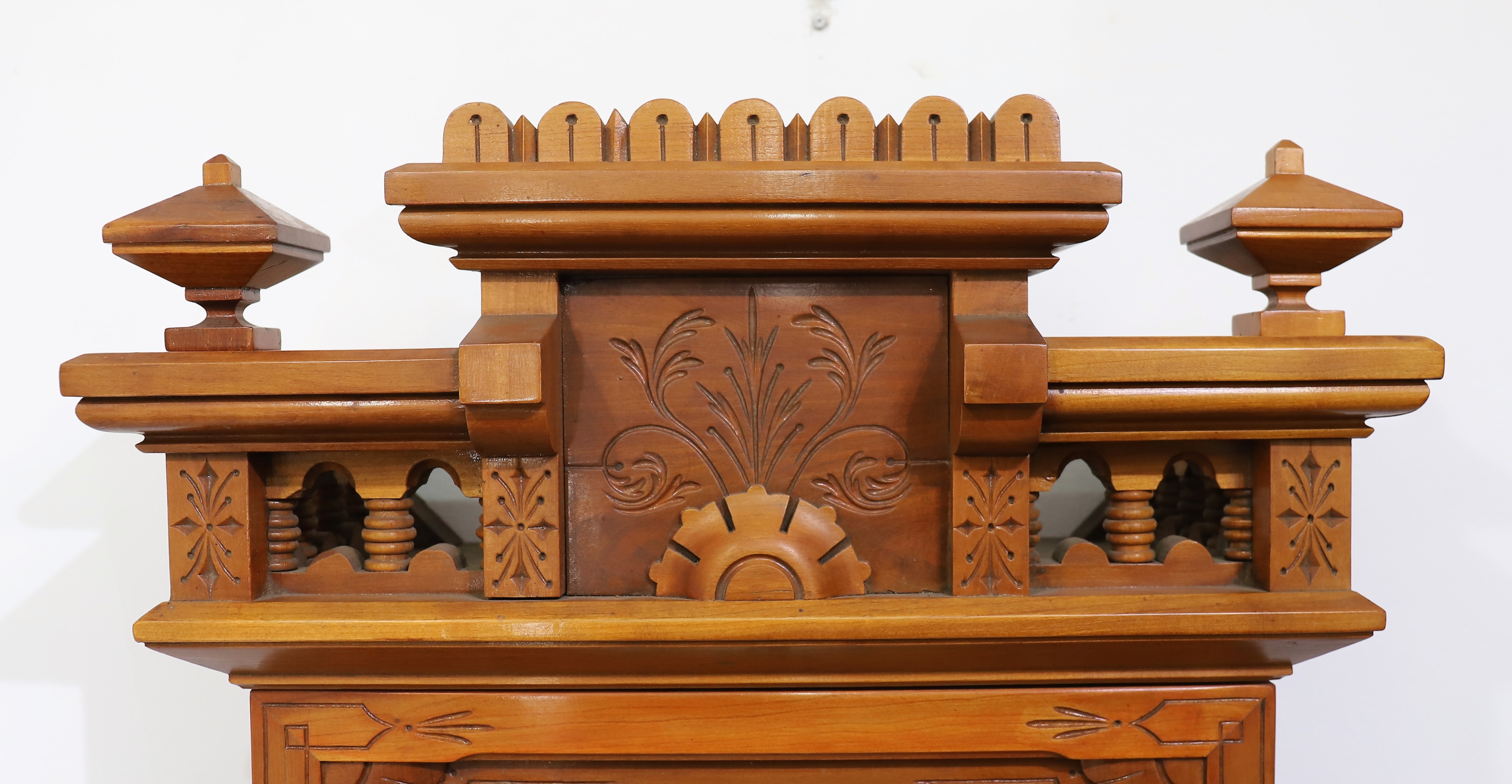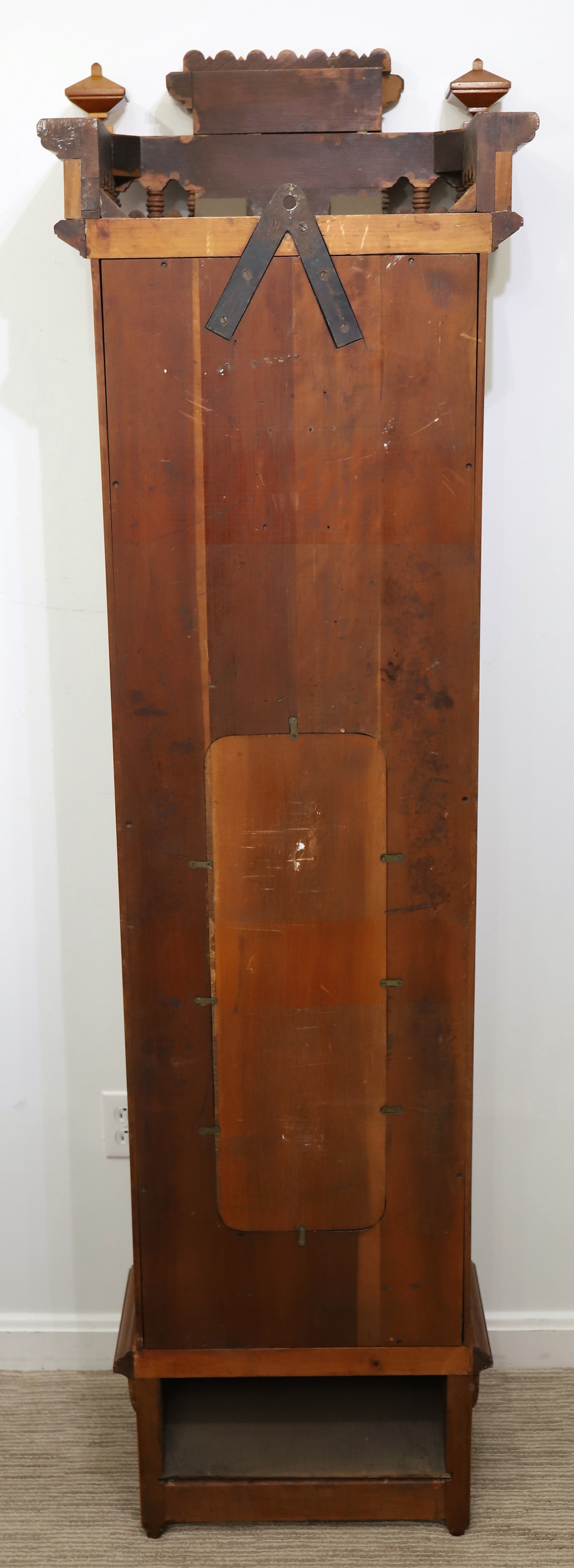 78-inch case came in walnut, oak, cherry, or ash, and I believe this case is refinished cherry, with carvings top and bottom. The square top finials and bottom finials are correct; the top finials are often missing from this model. The door glass and