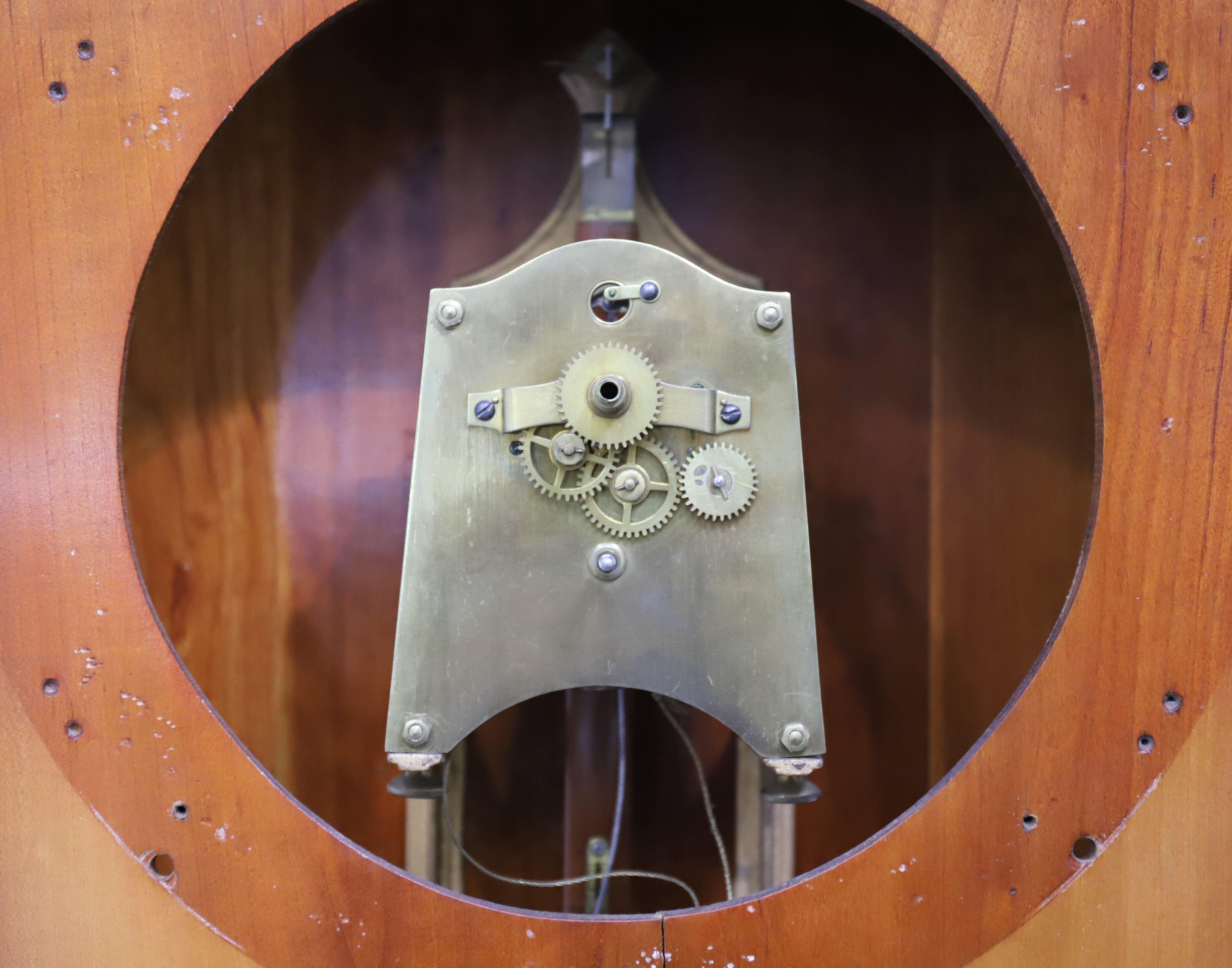 was refinished. The 8-day, time-only brass plate movement is not signed; it has a dead-beat escapement with retaining power