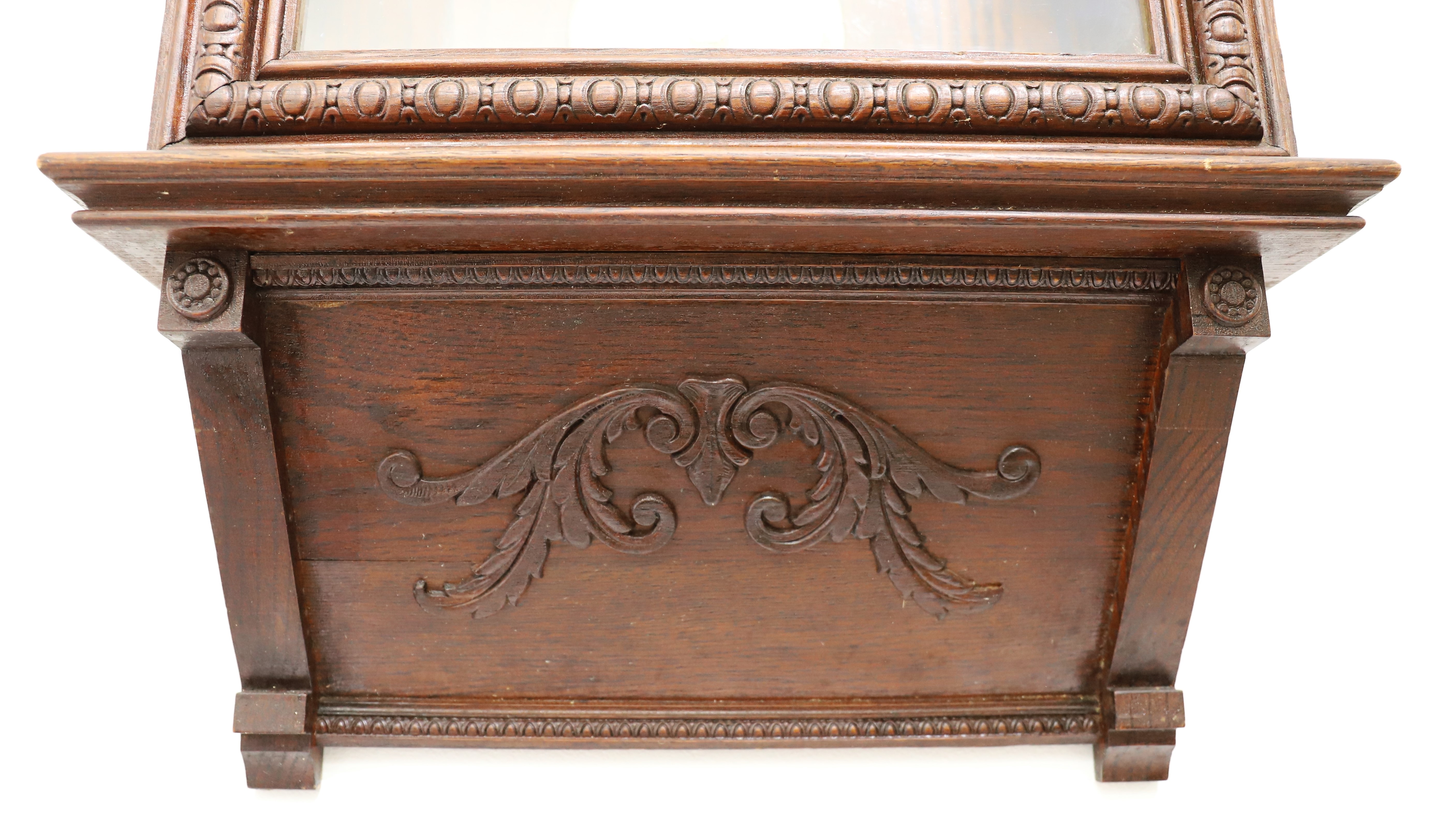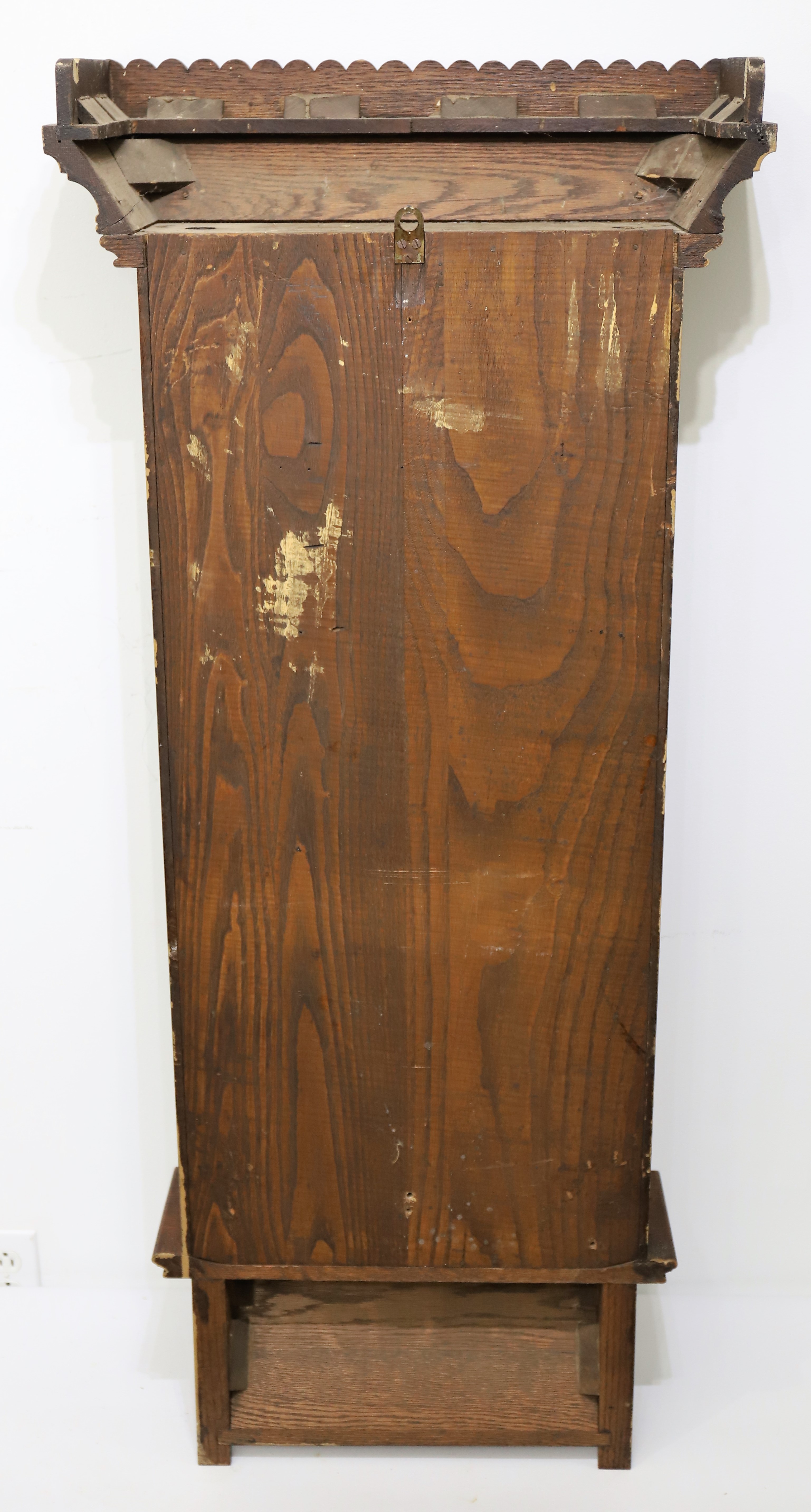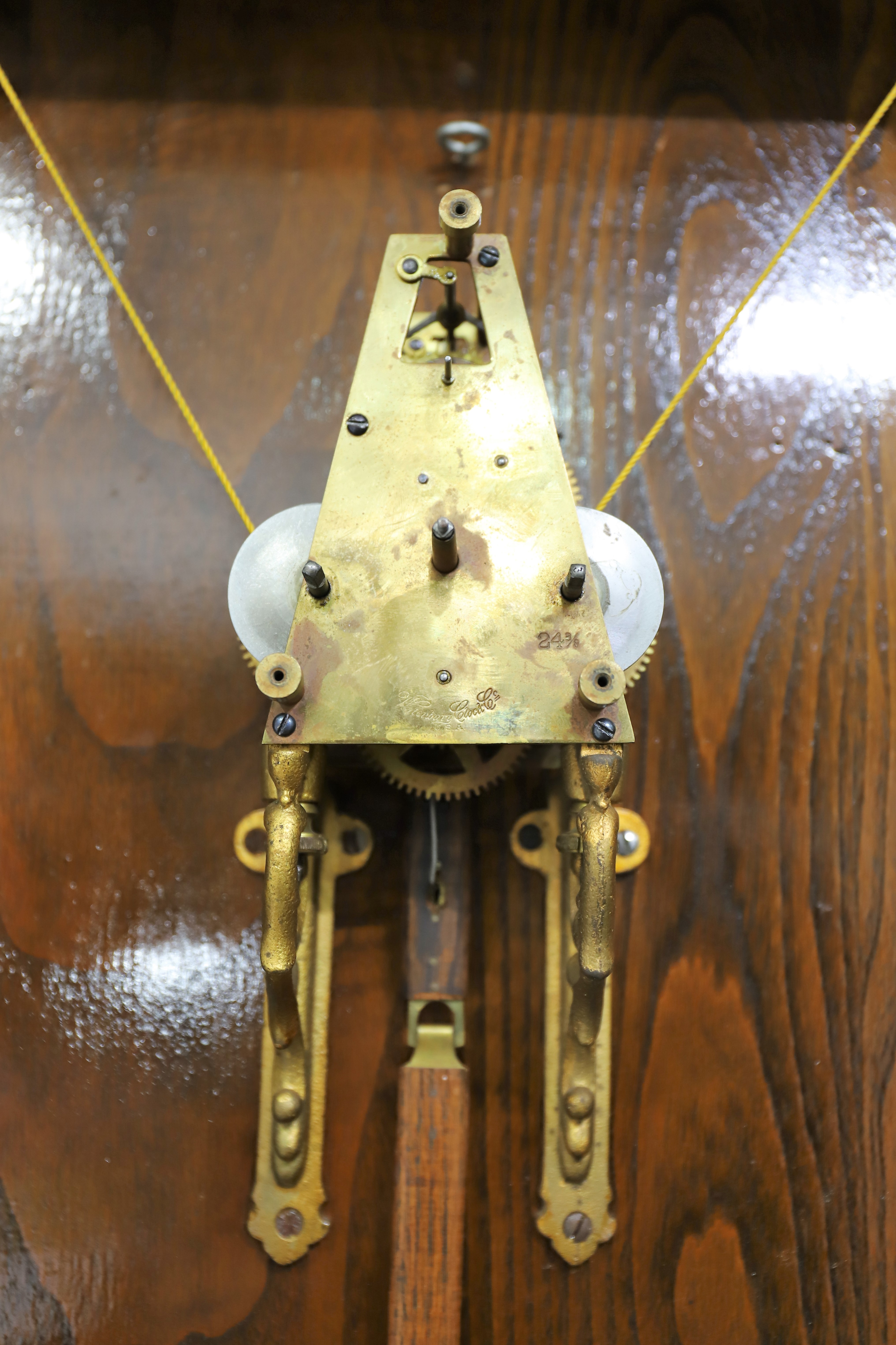 oak case with multiple coats of varnish and grit. The door glass is old, the dial painted and yellowed, the fancy hands original. The 8-day, time-only movement is driven by two wafer weights that run down each side and were painted to match the case to be unobvious. The movement is signed and running, the pendulum bob is Waterbury issue. There is a black label inside. A good example;