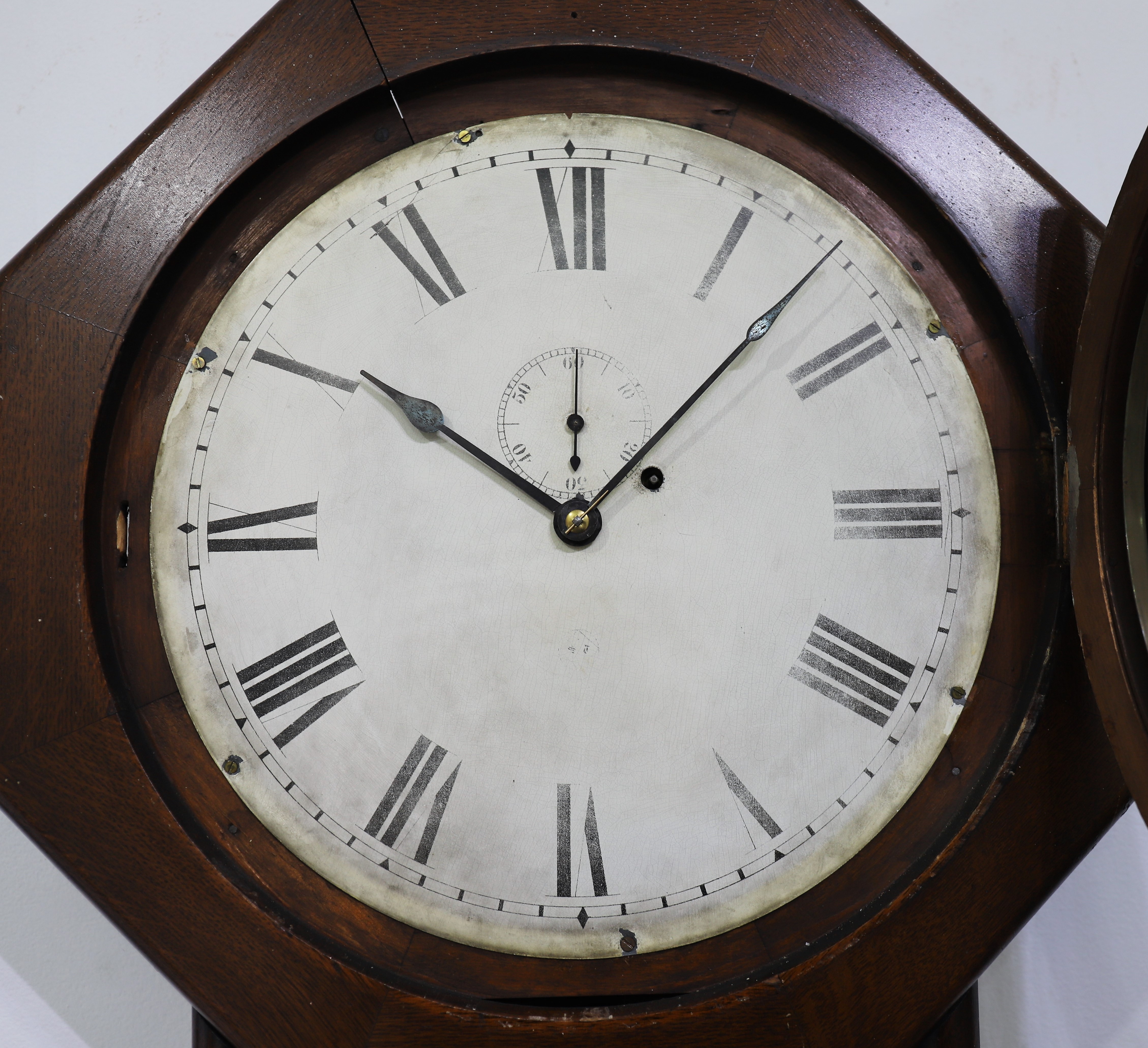 oak-veneer case with a dark and very old finish. Both glasses are period, the dial is likely original and very faded, the blued