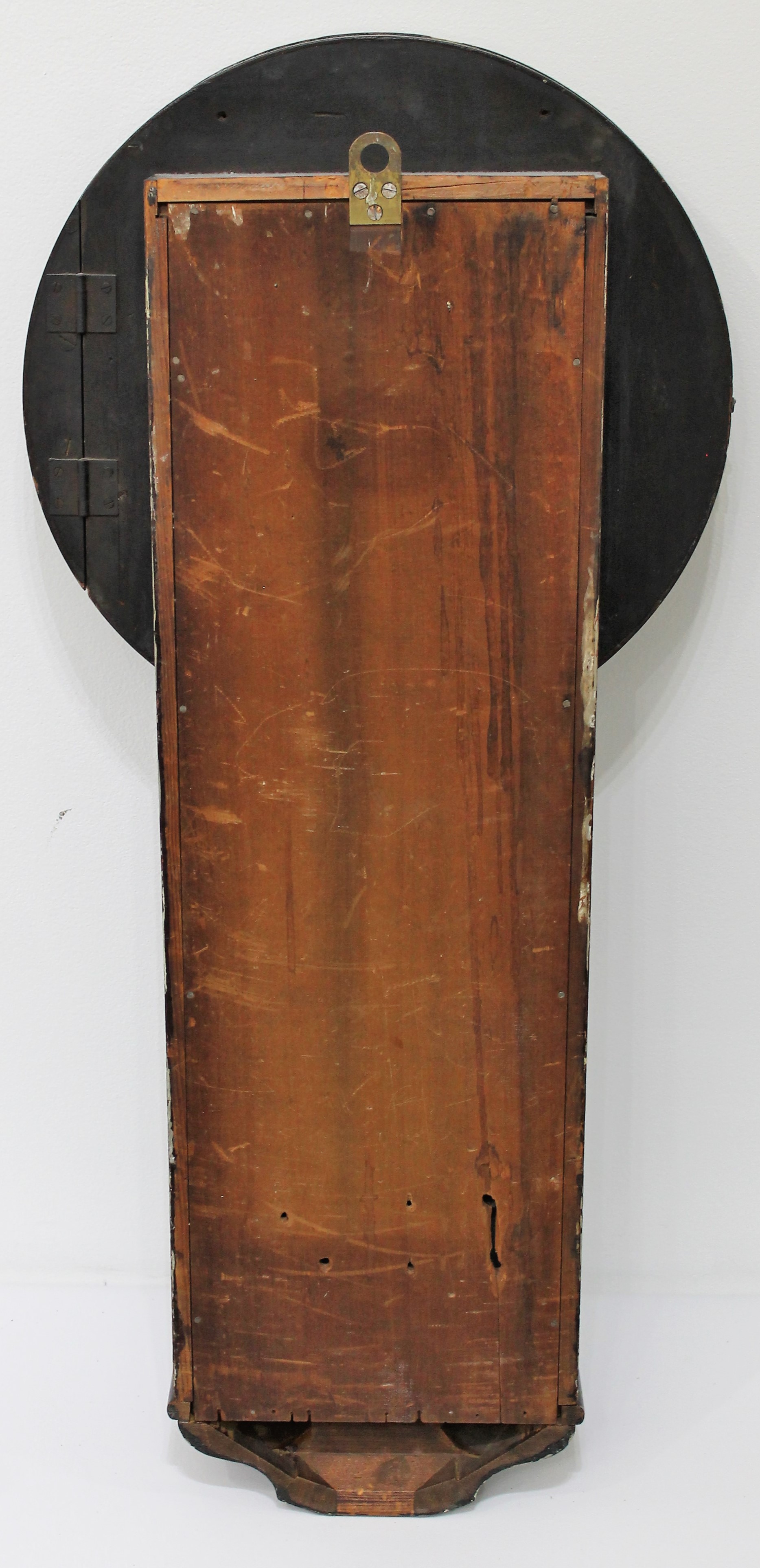 to find, this one in excellent condition. The 33-inch case appears to be mahogany with an old finish, slightly crusty. Both glasses are old, the tablet likely rebacked; the gold-leaf design is well-preserved. The painted dial is old, has the ST