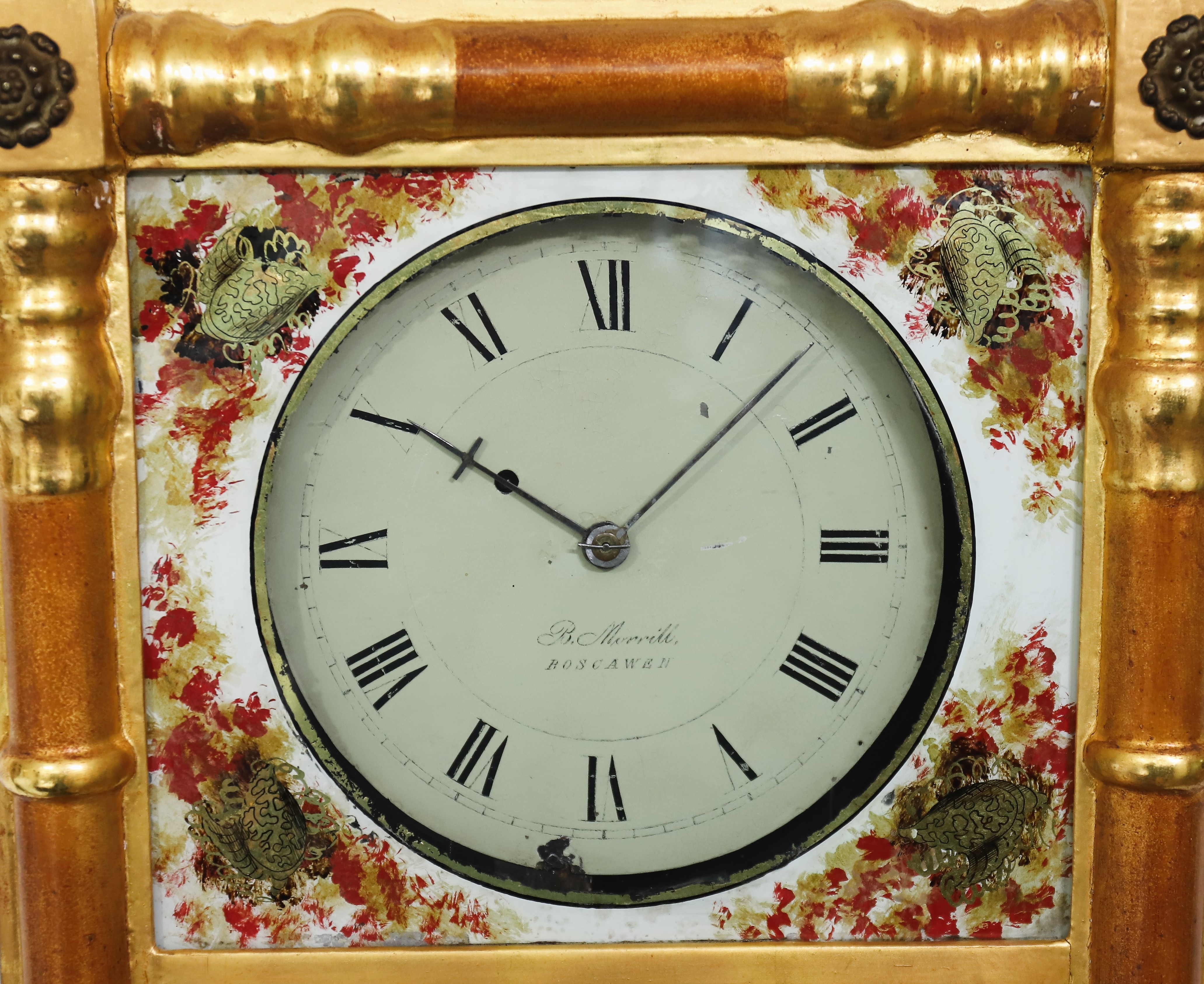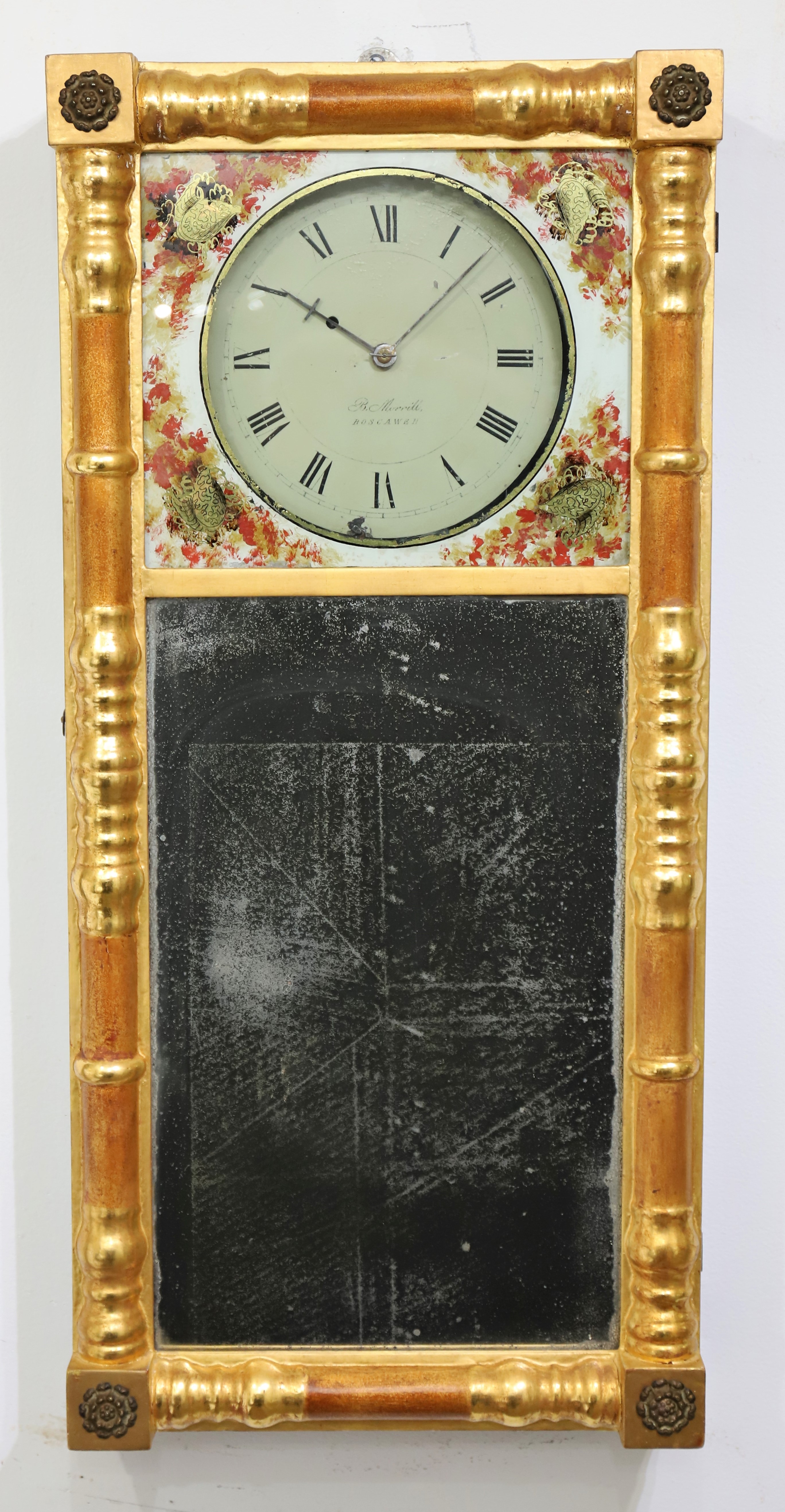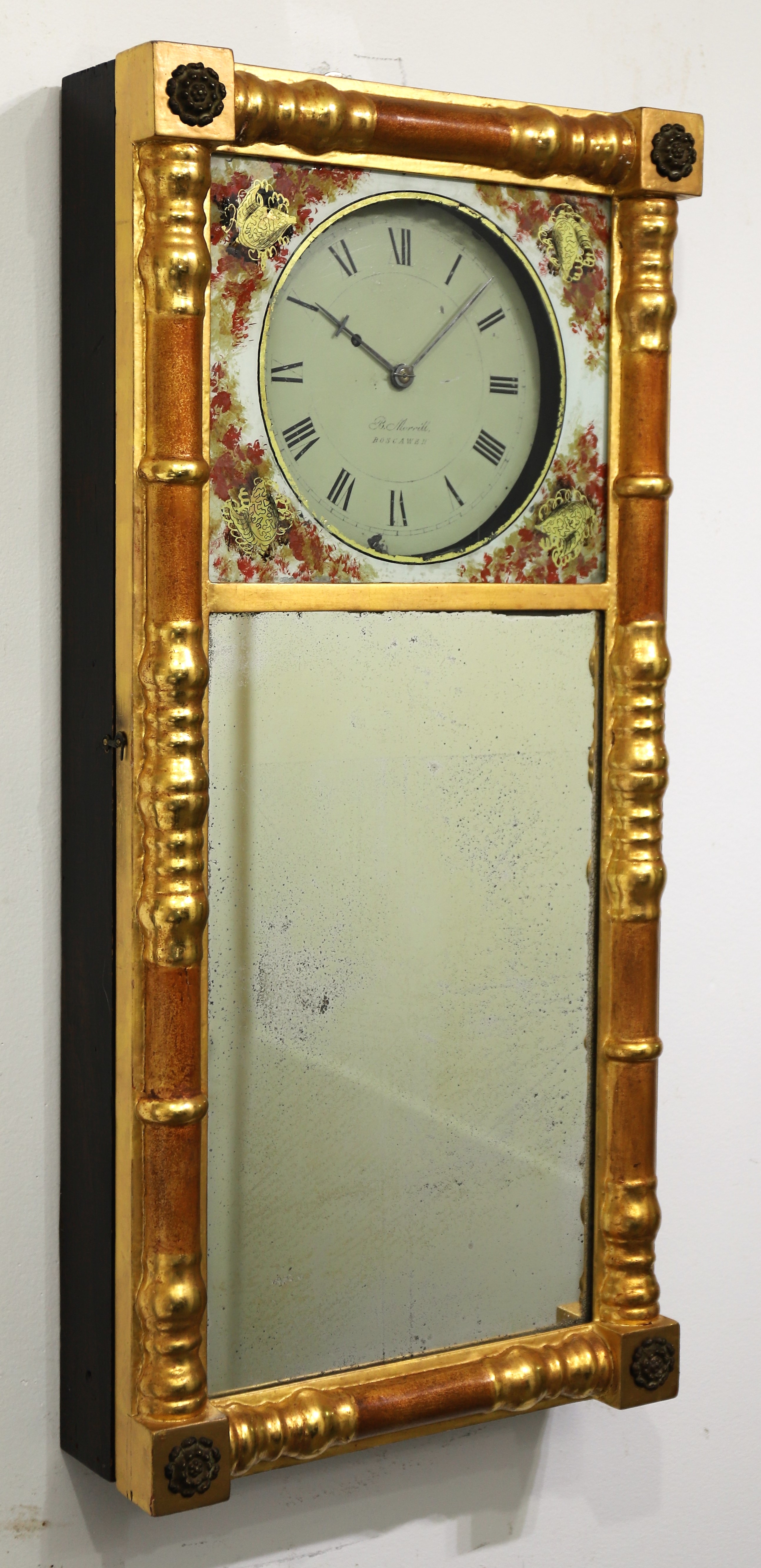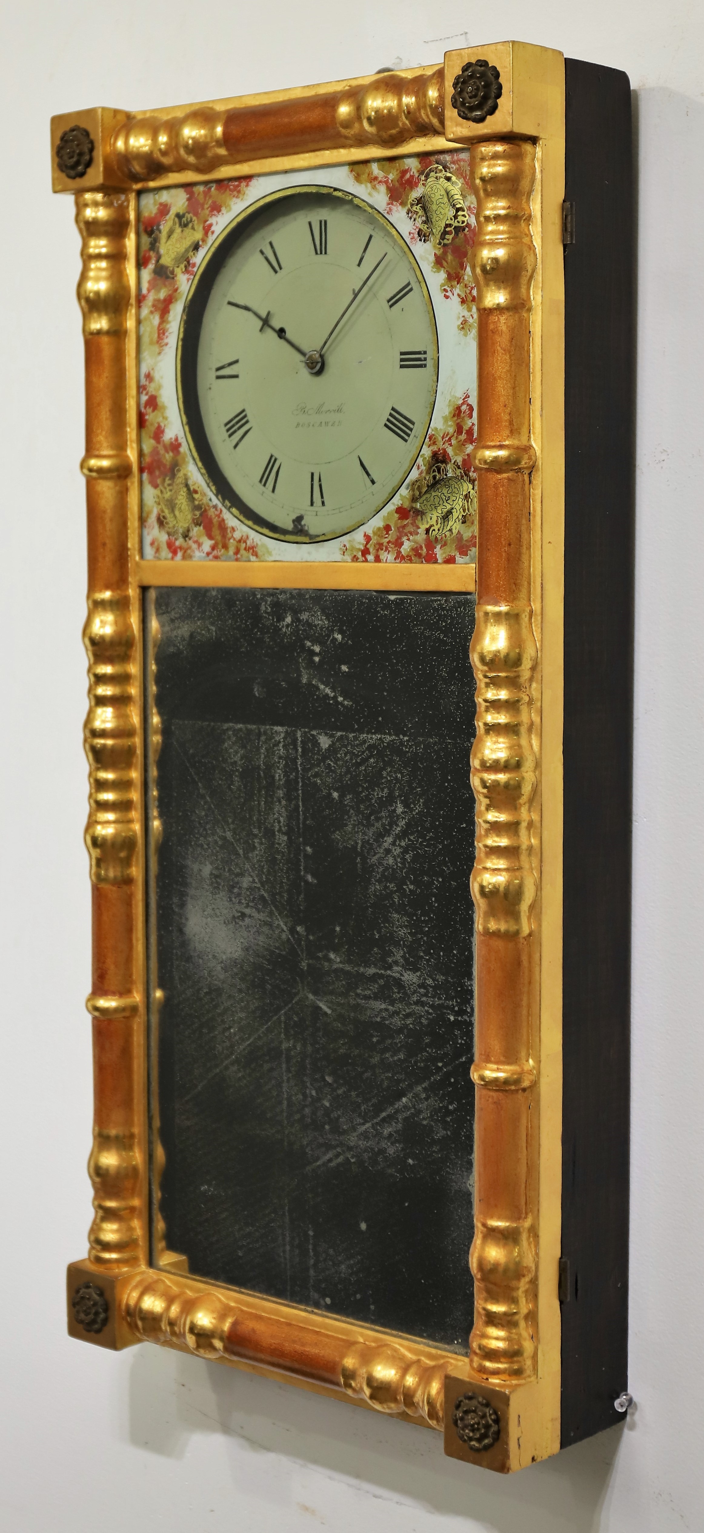 Benjamin Morrill New Hampshire mirror clock, ca. 1825. A small mirror clock by a famous maker out of Boscawen, NH, for which this style of clock is named. The gilded case is 29.5