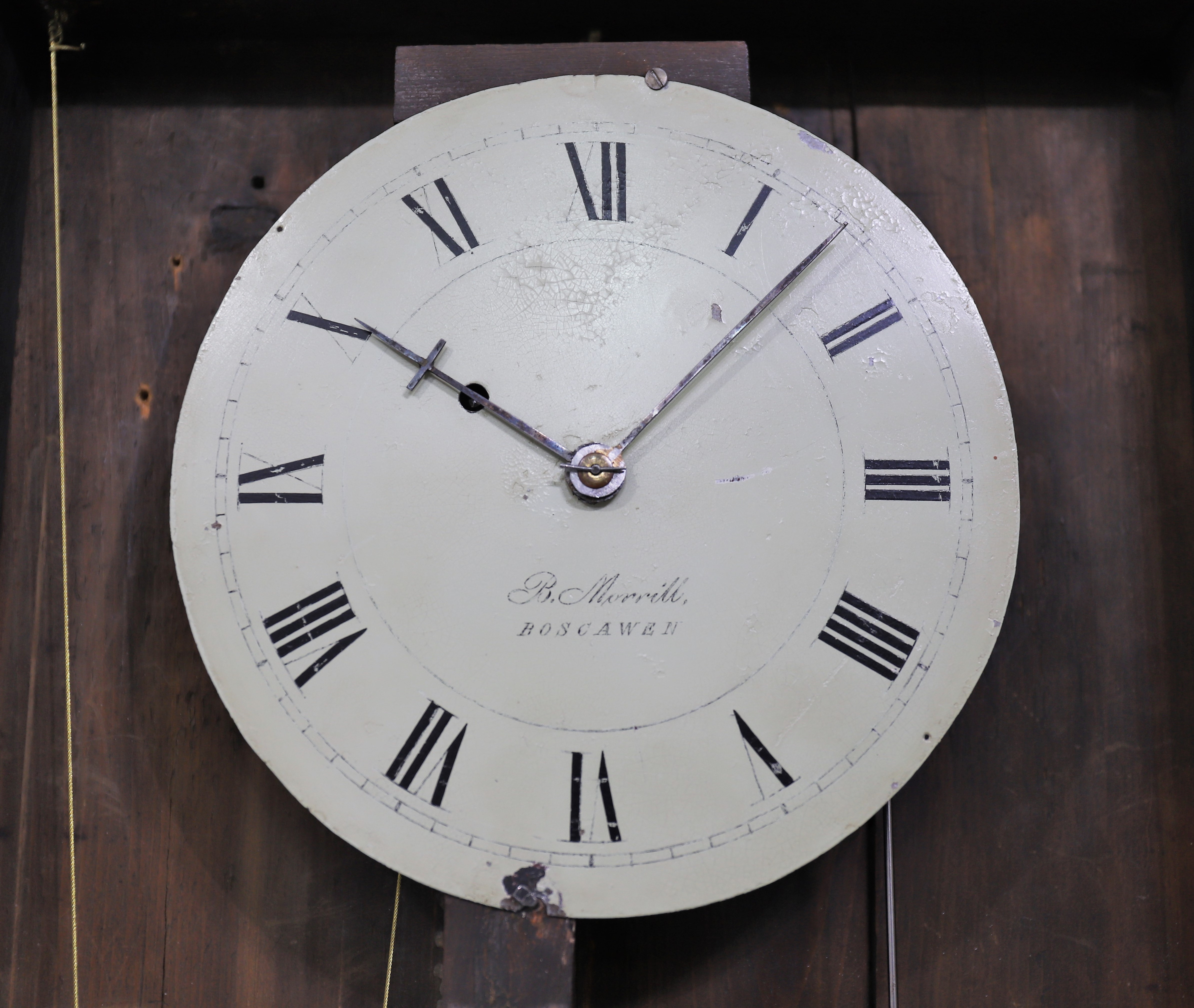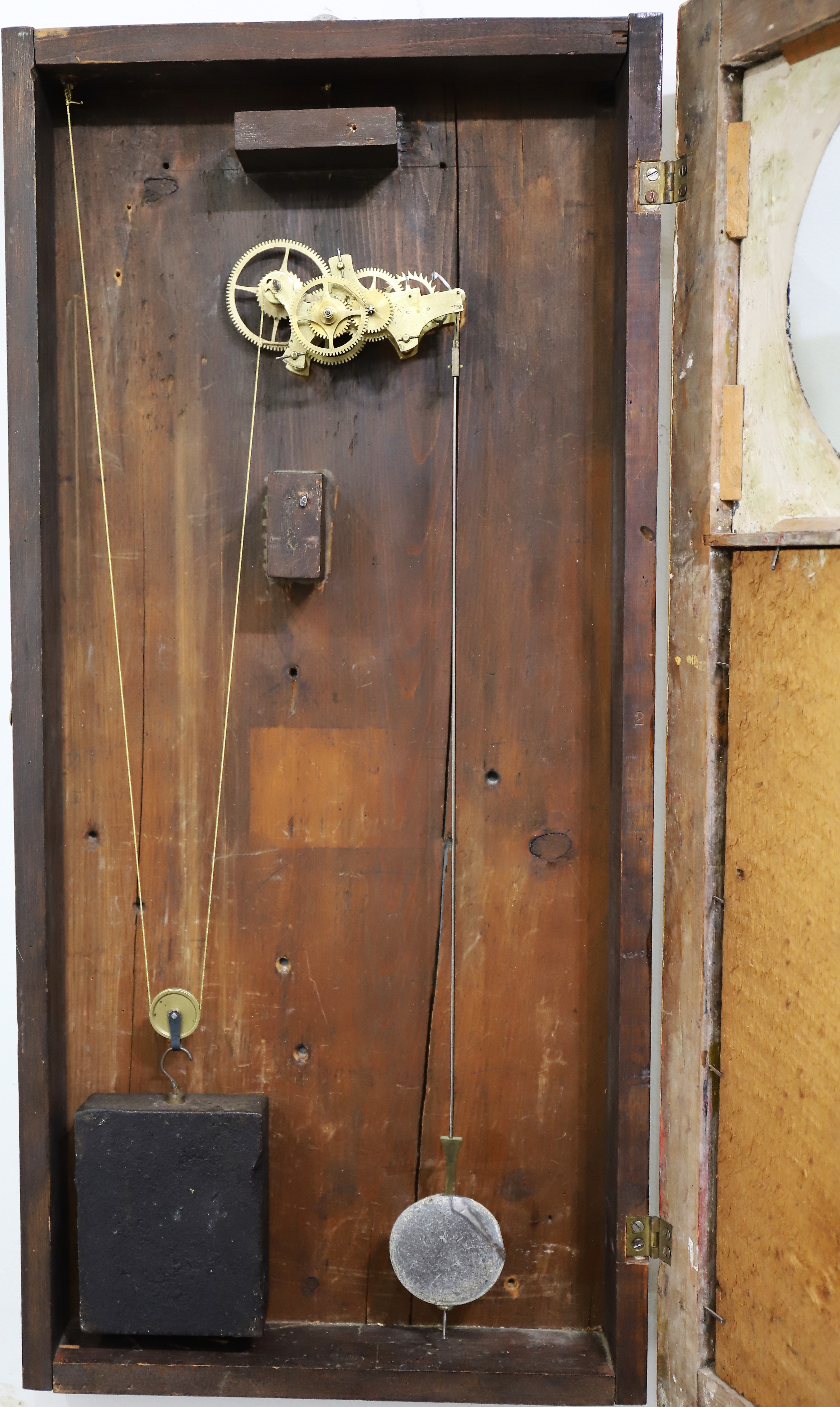 dial is likely original to the clock and has been repainted; the hands are likely original. The wheelbarrow movement is unsigned,