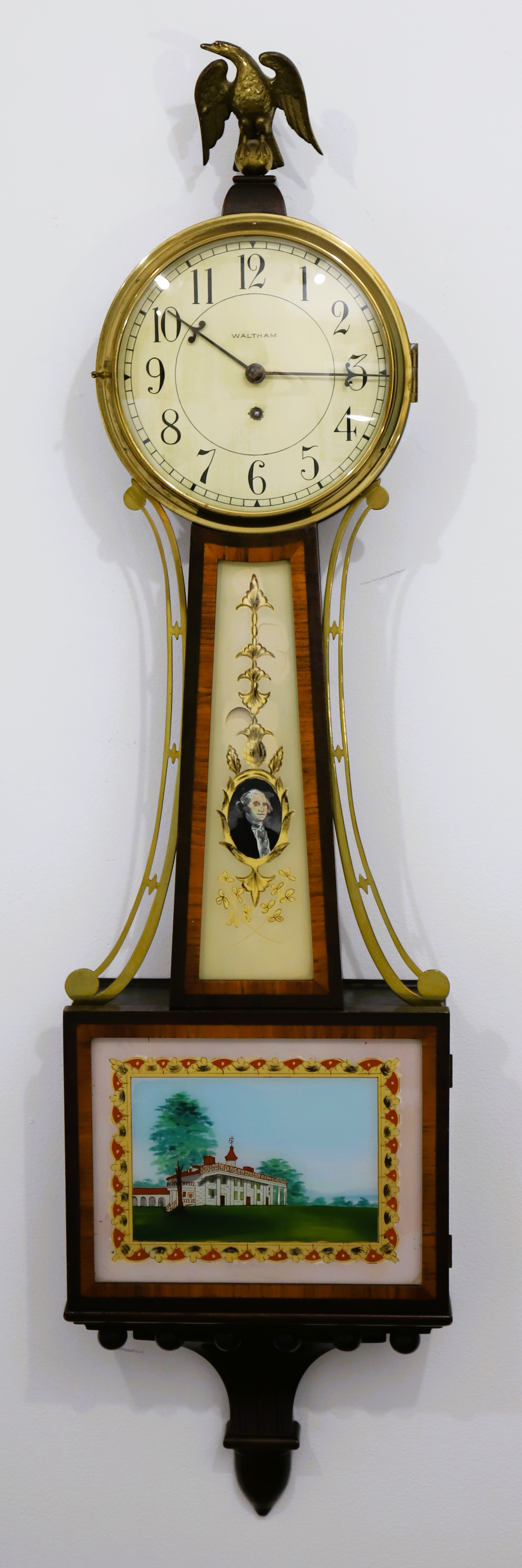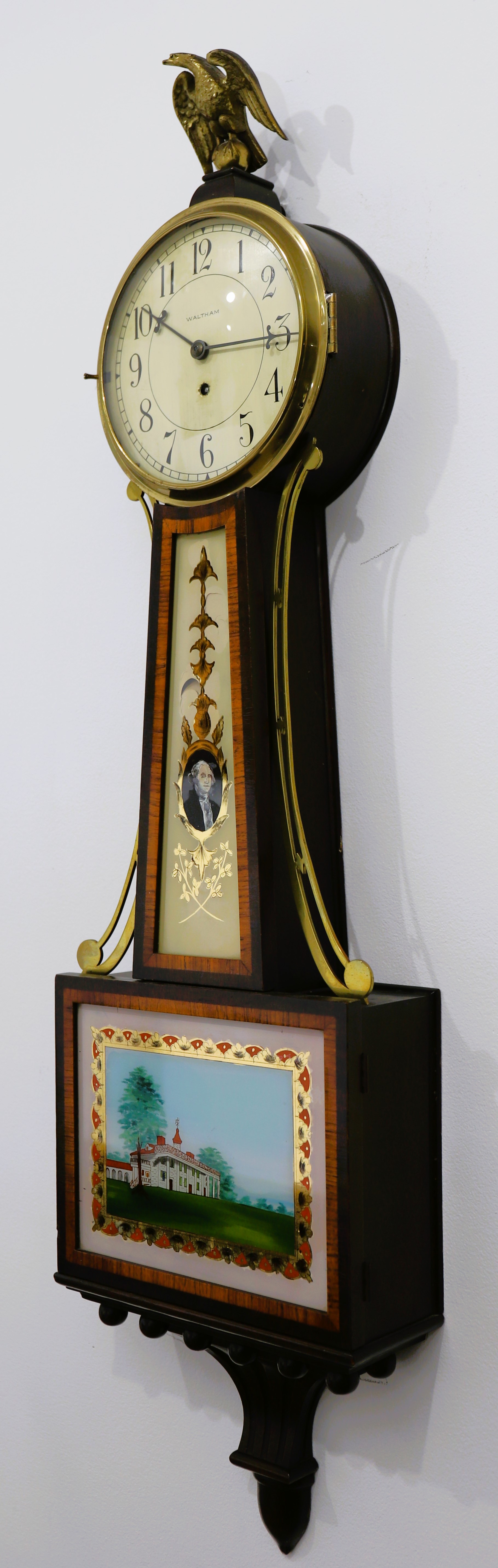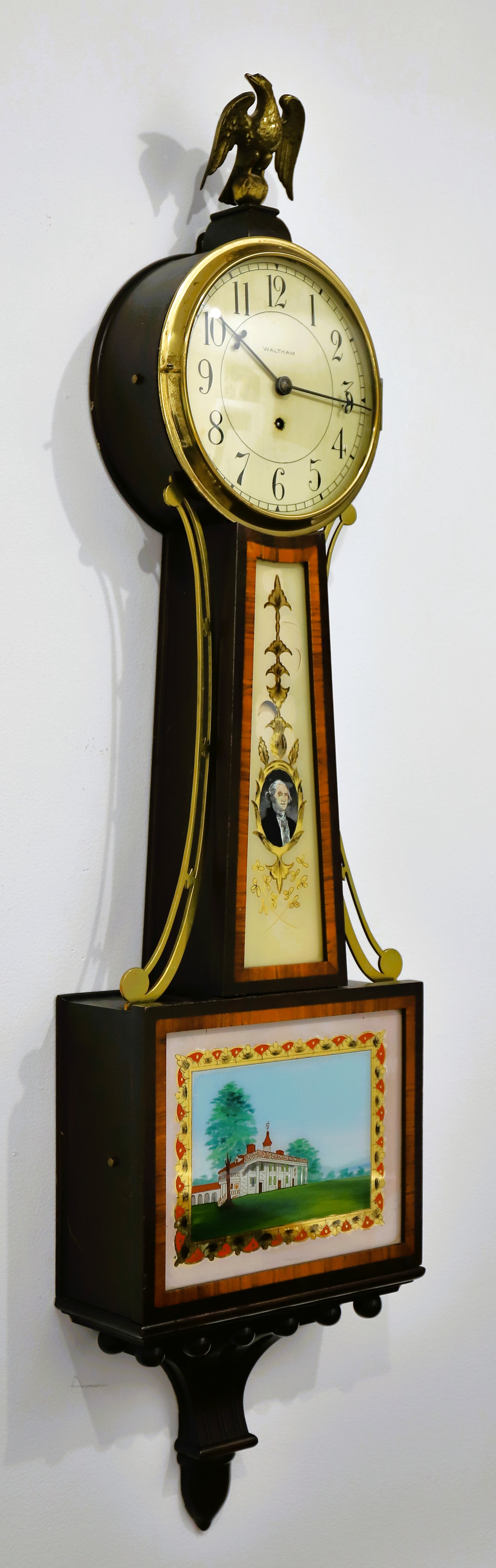 the brass eagle finial; it holds a platform escapement 8-day, time-only movement that is signed “Waltham Watch Co.” and is running