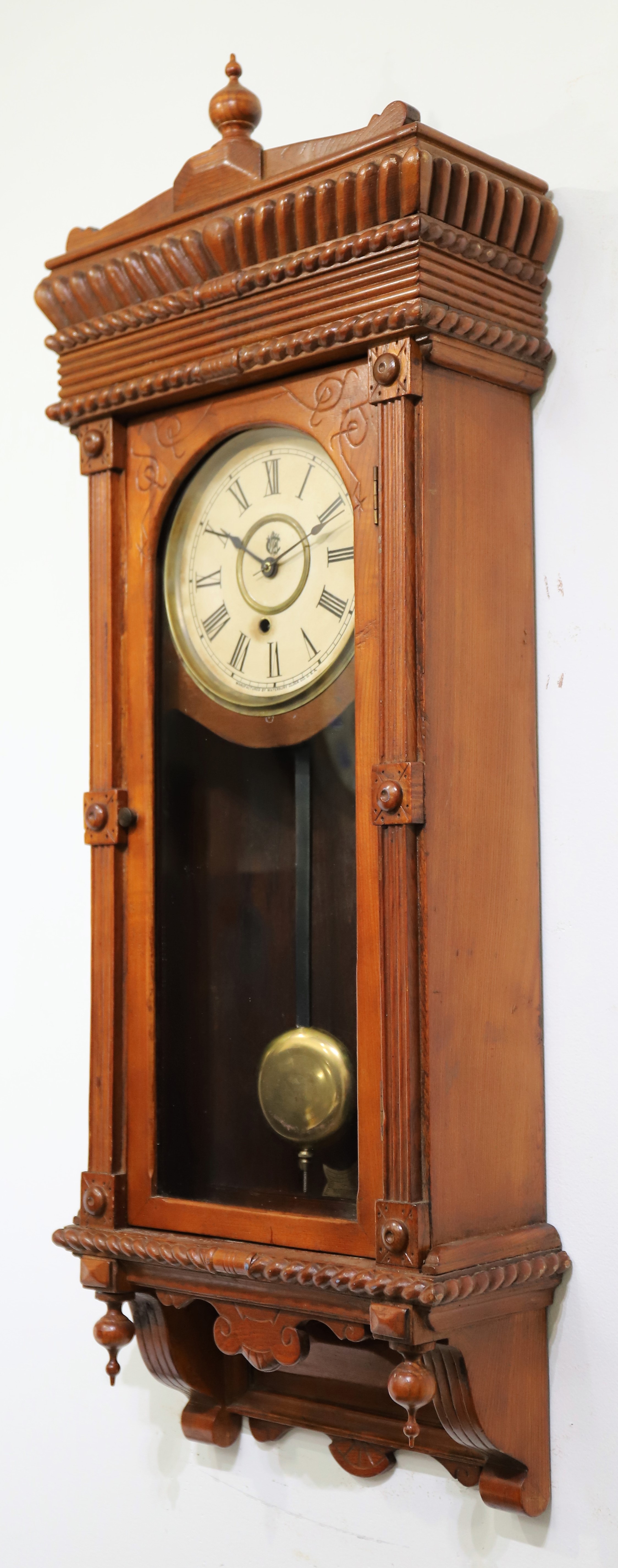 8-day time-only, signed movement is running reluctantly and will need cleaning and/or service; it is regulated by a Waterbury pendulum