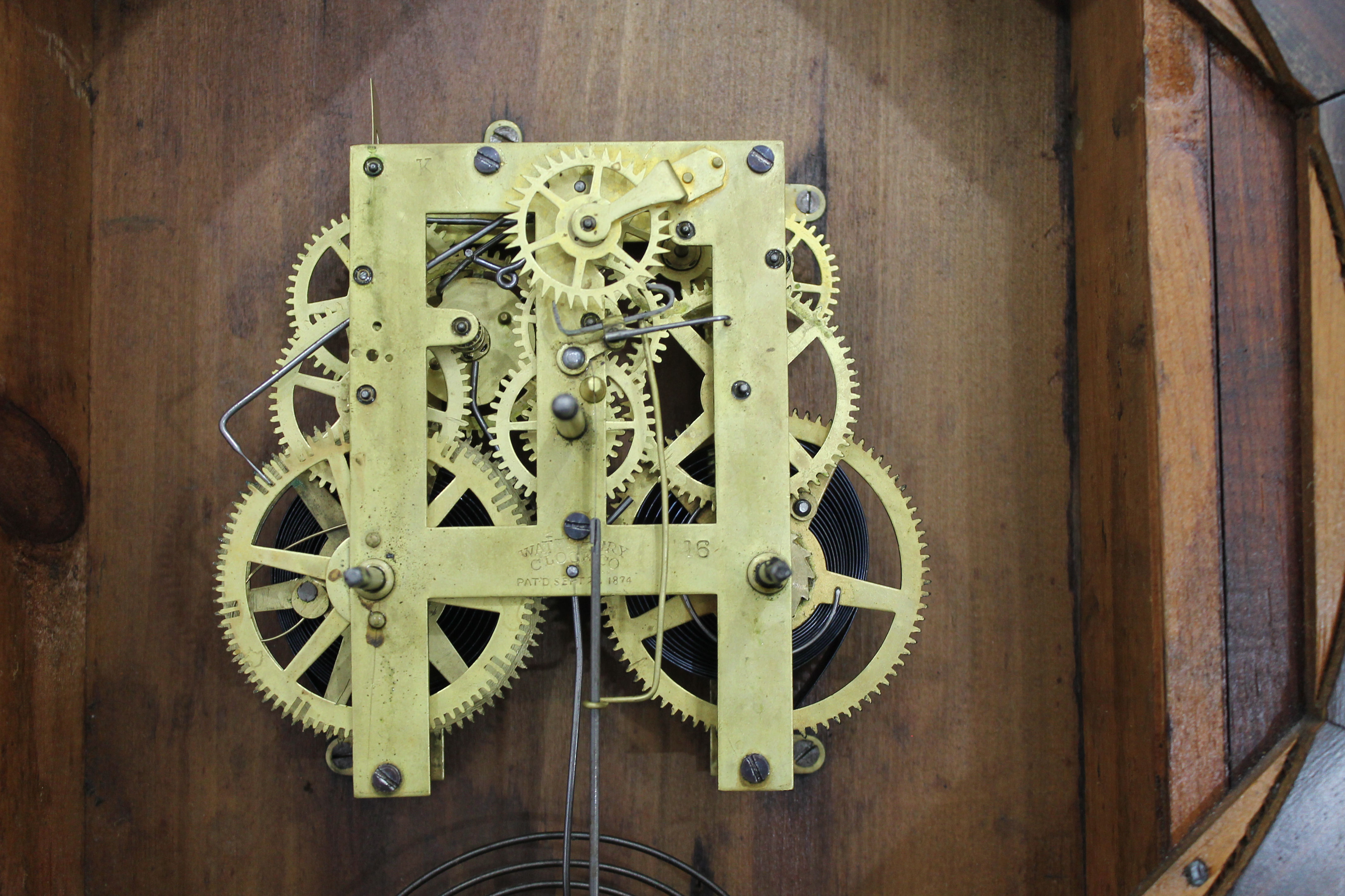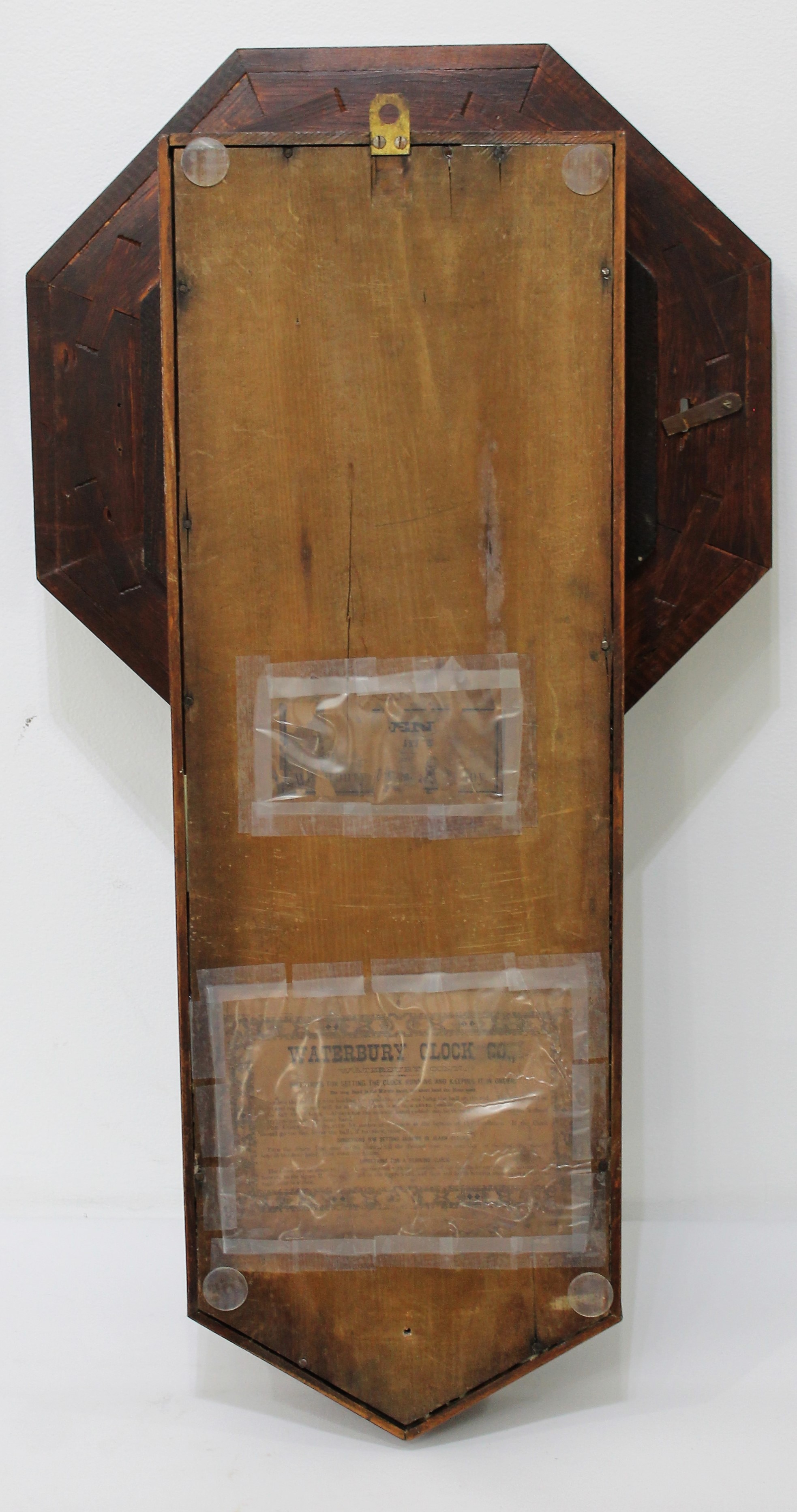 and running, striking on the Waterbury wire gong, regulated by a Waterbury pendulum. The interior has the original patterned