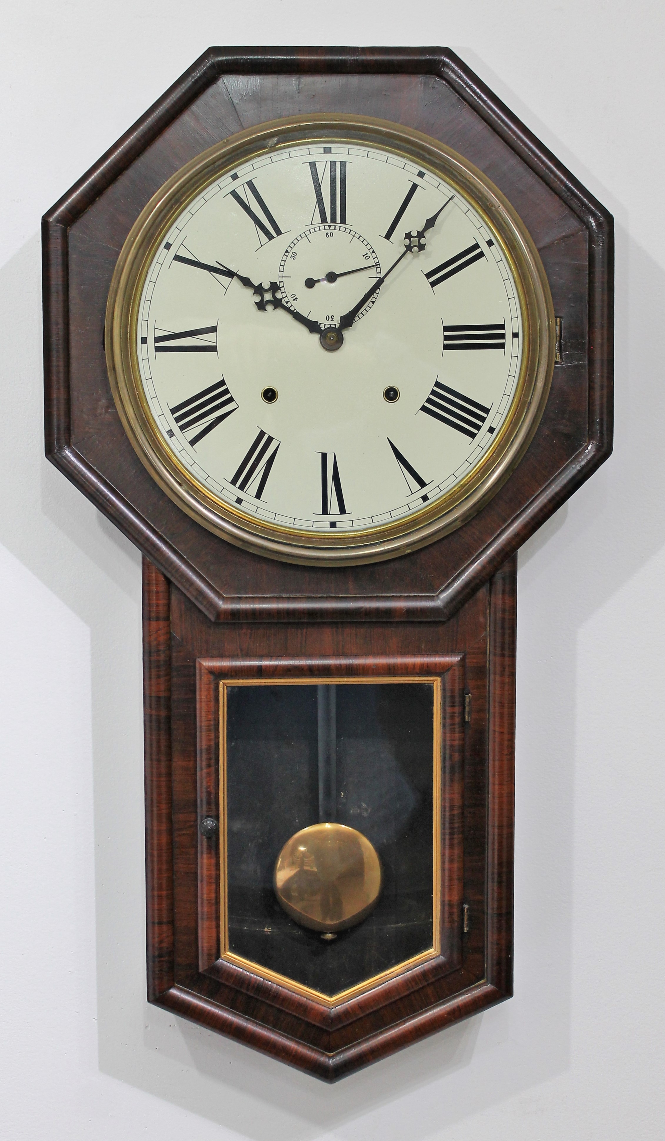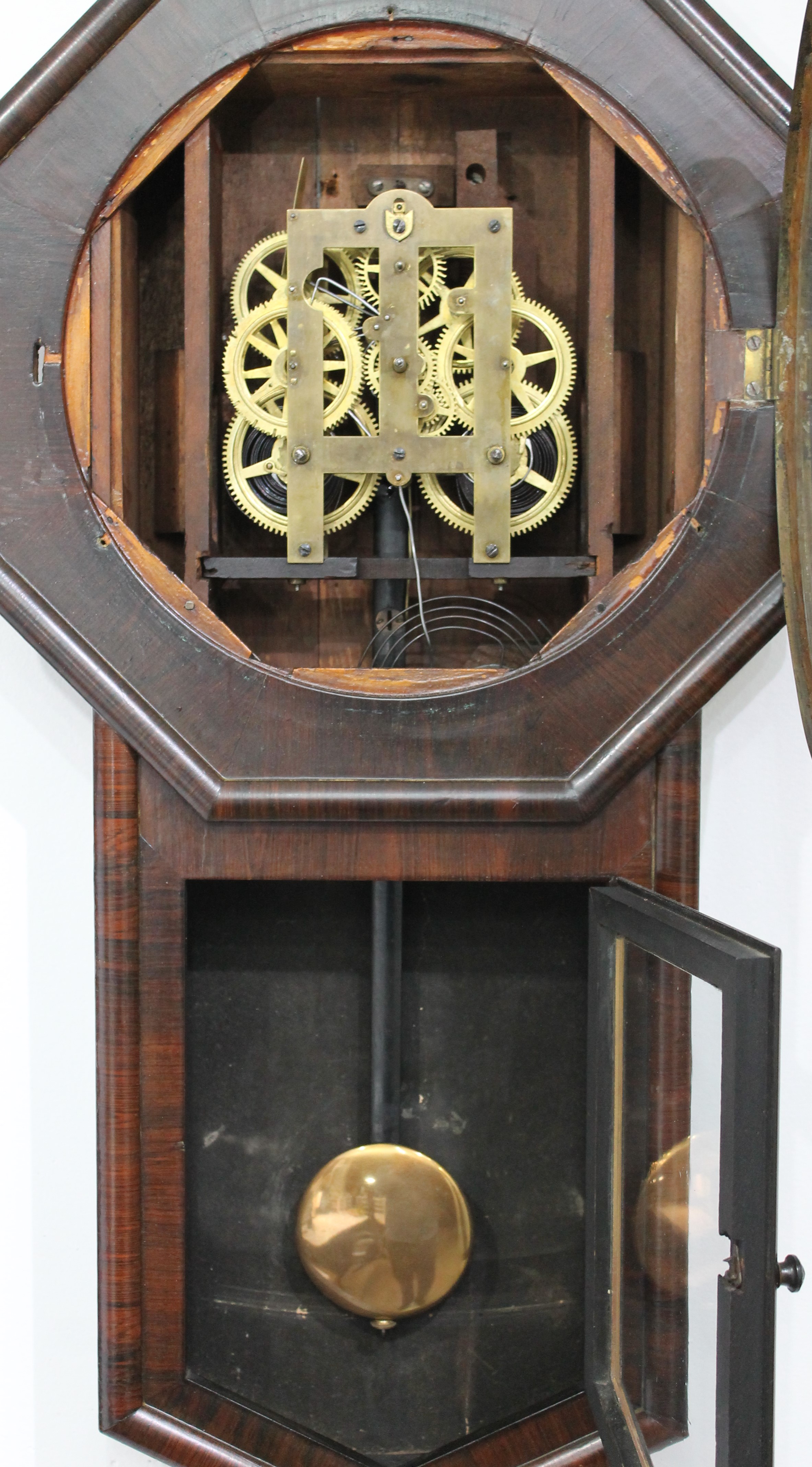 in rosewood, although I think the octagon bezel is grain-painted. The dial glass is modern, the lower door glass period/original. The dial has been professionally repainted, the hands are correct. The 8-day, time-and-strike spring movement is unsigned and